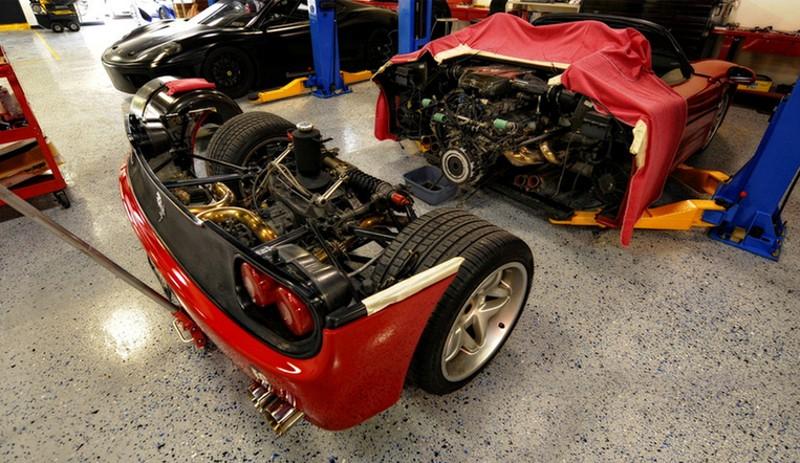 L’arrière de la F50, après démontage de l’énorme capot arrière (en plastique), est tout simplement “coupé” en deux parties (j’écris “coupé” pour vous aider à comprendre l’ingéniosité Ferrari, sans nul doute copiée sur celle du Heer Doktor Porsche, nécessitant le démontage du moteur des 930 Turbo pour changer les 6 bougies)…
