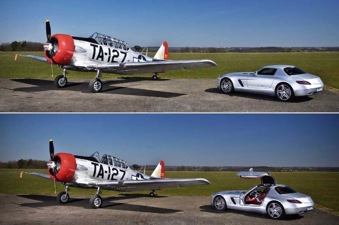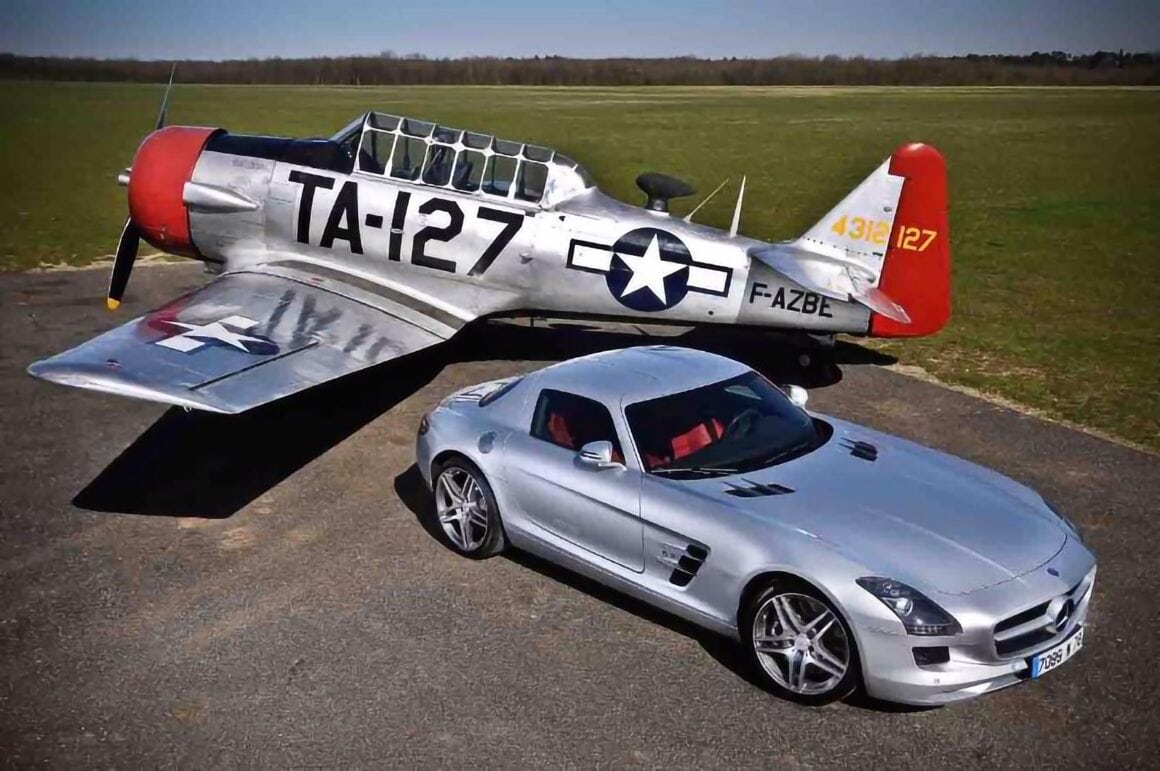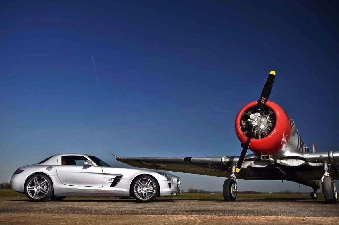 Mais, la célébration de ma vie libérée des tristes contraintes de la réalité, ne peut suffire en soi à faire saisir aux lecteurs et lectrices, la densité de l’immensité, d’où le besoin de m’attaquer à l’analyse même des traces concrètes abandonnées de mues successives, afin de révéler une analyse de la place et de l’aspect inacceptable d’un monde infesté par la rationalité… et en même temps d’essentialité, pour suppléer à la carence de sens quant à notre séparation d’avec le néant, m’attachant pour cela uniquement à mon propre travail et ne faisant appel qu’exceptionnellement à ce que tant d’autres érudits élaborent difficilement. Loin de me perdre dans divers méandres, j’affronte courageusement la complexité de chaque sujet et parvient à ne pas perdre de vue la suite de ce qui fera la référence : le panégyrique de tous les preux, accordant à chacun le temps nécessaire pour trouver sa spécificité admirable dans un ensemble…, passant ensuite en revue la munificente imagerie avec laquelle le temps et surtout les plus talentueux, enrichissent la légende…, transfigurant ainsi votre vision de l’automobile (et de la littérature), vous transportant, pour peu que vous soyez un peu réceptif, dans un état second que vous crûtes ne jamais pouvoir éprouver à la lecture de mes textes sans queue ni tête que les générations futures garderont précieusement en mémoire, peut être soigneusement entourés d’une chaîne et d’un cadenas, pour éviter qu’une jeune âme ingénue ne les exhume par hasard… et ne discerne, au creux de mes lignes prolixes, les voiles interdits d’un univers voué à l’anathème… Je n’écrirai rien concernant la Mercedes SLS photographiée à coté d’un North American T6 restauré à la perfection, faites-vous-en votre propre cinéma au moyen de ce que j’ai déjà écrit et sur ce que d’autres en disent…