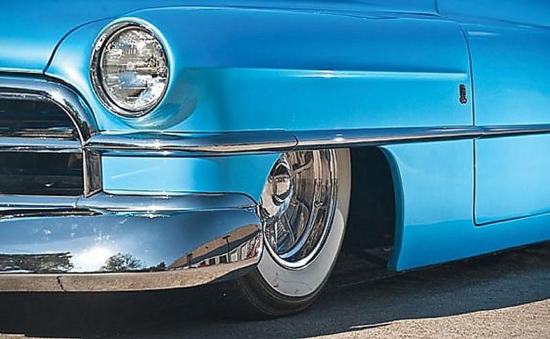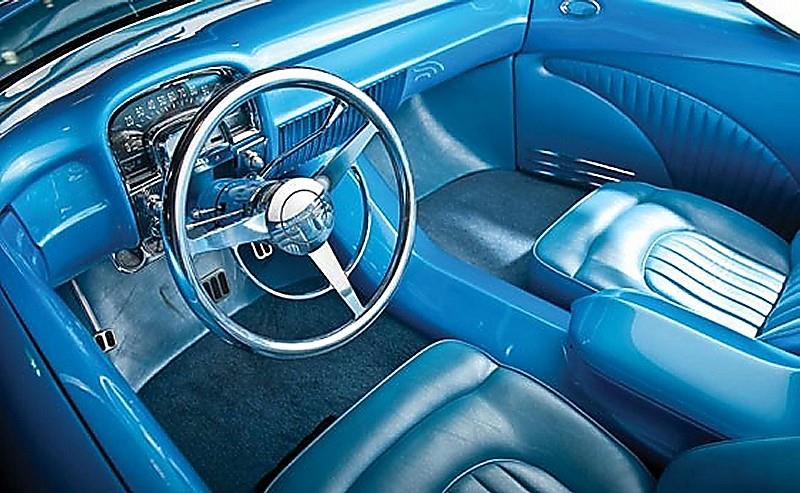 En peu de temps la discussion a bien heureusement changé de sujet, nous en sommes venu à papoter de la baleine bleue… : “350 chevaux, 350ci, c’est un V8 Chevrolet ZZ4 avec carburateur Holley, et une THM-350, une transmission automatique à trois vitesses, freins hydrauliques aux quatre roues, suspension indépendante à l’avant et suspension pneumatique arrière…, ouaissss mec, c’est mon interprétation moderne du roadster quifaisait le tour des USA avec le Motorama GM. J’ai eu avec ma baleine bleue une collection impressionnante de récompenses, y compris le Bradley Design Award Harley Achievement, le plus beau trophée personnalisé du monde, j’ai aussi remporté le prix d’élégance Custom au GoodGuy ainsi que le prix Westergard Harry. Je suis membre du Daryl Starbird Museum et du Grand National Roadster. Ouaisss, mec ! C’est coll, non ! Dans la presse écrite, ma Cadillac a figuré sur les couvertures de Hot Rod magazine, et de Street Rodder magazine, j’ai même eu droit à une des émissions de Hot Rod TV avec ma bonne vieille “Kashmir”. J’avais toujours voulu faire un concept-car, un exercice de style inédit. Pour accomplir ma vision, j’ai acheté une Cadillac berline-coupé deux portes de 1952, elle était en bel état, ?toute en métal nu. Mon premier travail a consisté à démonter une Chevy Nova pour en récupérer la suspension avant indépendante. Puis je me suis occupé de la Cadillac, le toit a été coupé, le pare-chocs a été lissé. J’peux pas tout dire ce que j’ai fais d’autre, y a trop de boulot, mon gars ! En finale je l’ai peinte en bleu nacré, un bleu éblouissant, que j’ai poncé et poli jusqu’à obtenir un éclat magique. L’histoire de la teinte bleue est intéressante, en 2003, lors de la visite d’un marché en plein air à Venise, en Italie, j’ai repéré un châle bleu électrique vendu par un vendeur marocain. C’était exactement la couleur que je voulais pour ma Cadillac; J’ai acheté le foulard. Sur l’étiquette, il était dindiqué : Cachemire ! C’est le nom que j’ai gardé, c’était très exotique !”…