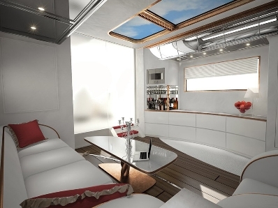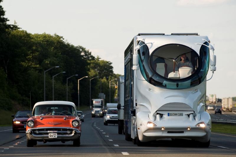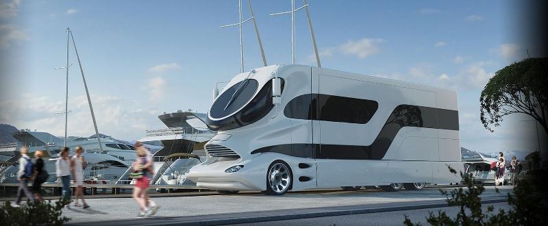 Cet énorme bijou de technologie, à la croisée du Nautilus et du TGV, avoisine les 40m2 d’espace (l’habitacle est extensible sur rails), pèse 20 tonnes, est motorisé par un V8 ou un V12 Mercedes de plus de 500 chevaux… et, pour le posséder, il fallait débourser la modique somme d’environ 2,5 millions d’euros, ce qui en faisait le camping-car le plus cher du monde.