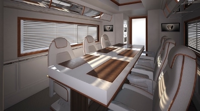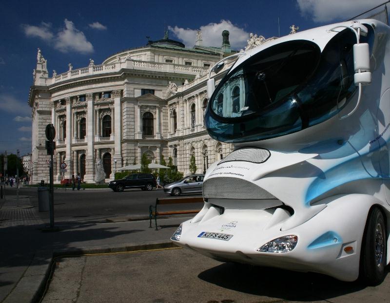 La frontière est infime pour qualifier ce véhicule original de 12 m de long mis en chantier par Marchi Mobile, un constructeur autrichien spécialisé dans les projets fous de grand luxe…, le EleMMent Palazzo devait, en fonction des clients, être un véhicule de promotion, ou une navette VIP ou plus classiquement un camping-car…, mais quel que soit l’usage de ce EleMMent Palazzo, chacun de ses hypothétiques acquéreurs était certain d’avoir une longueur d’avance.
