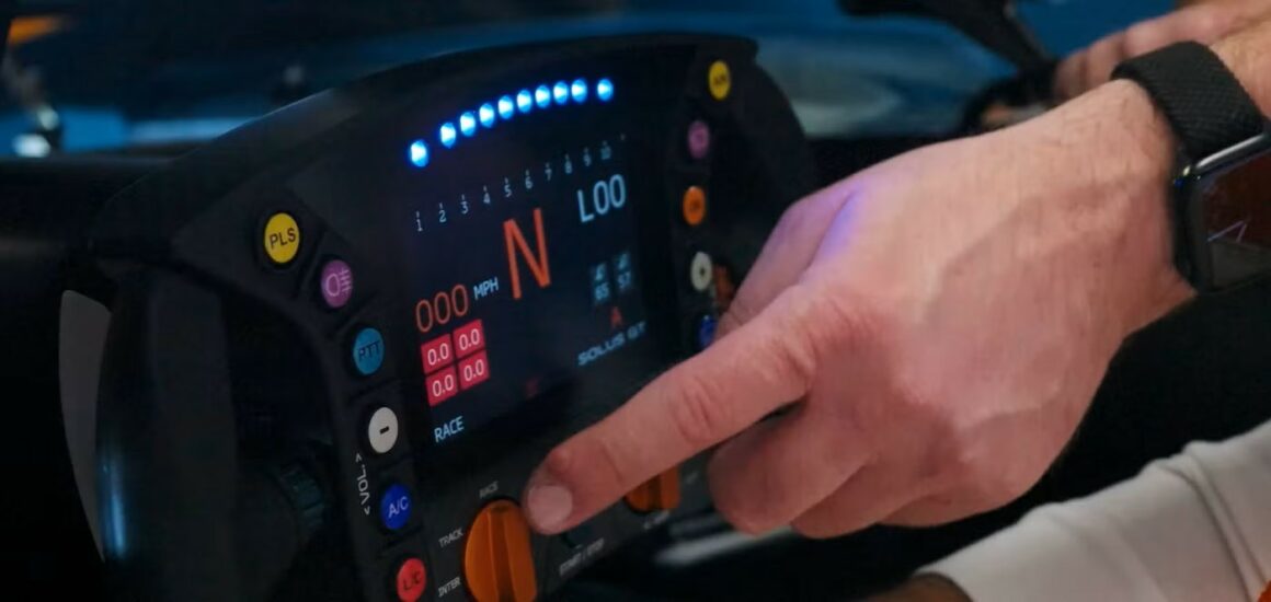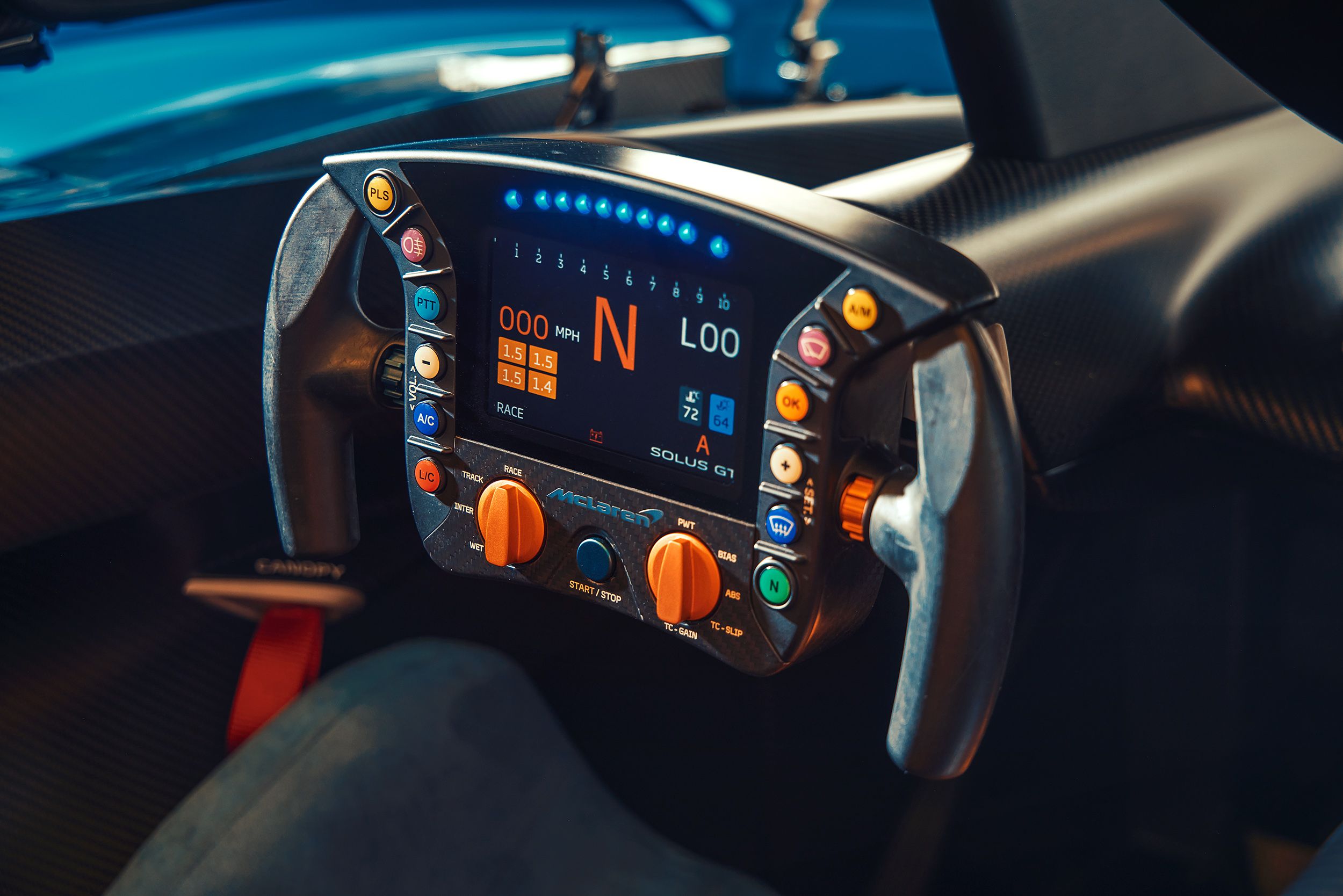 Le volant fait office de groupe d’instruments. L’aménagement est inspiré de la F1, mais comporte des commodités telles que climatisation et dégivrage arrière. La Solus GT dispose d’un ensemble mécanique complètement inattendu. McLaren dit qu’elle voulait de l’engagement, et bon sang, est-ce que c’est vrai. La Solus GT est équipée d’un moteur V-10 de 5,2 litres développé en collaboration avec Engine Developments Ltd., basé dans le Warwickshire, en Angleterre. Vous les connaissez peut-être sous le nom de Judd. Si l’expression “Judd V-10” ne remue pas votre âme, alors que le diable vous aide. En creusant davantage, l’engagement envers la connexion, la précision et les meilleures pratiques de voiture de course s’étend à chaque élément de la Solus GT.