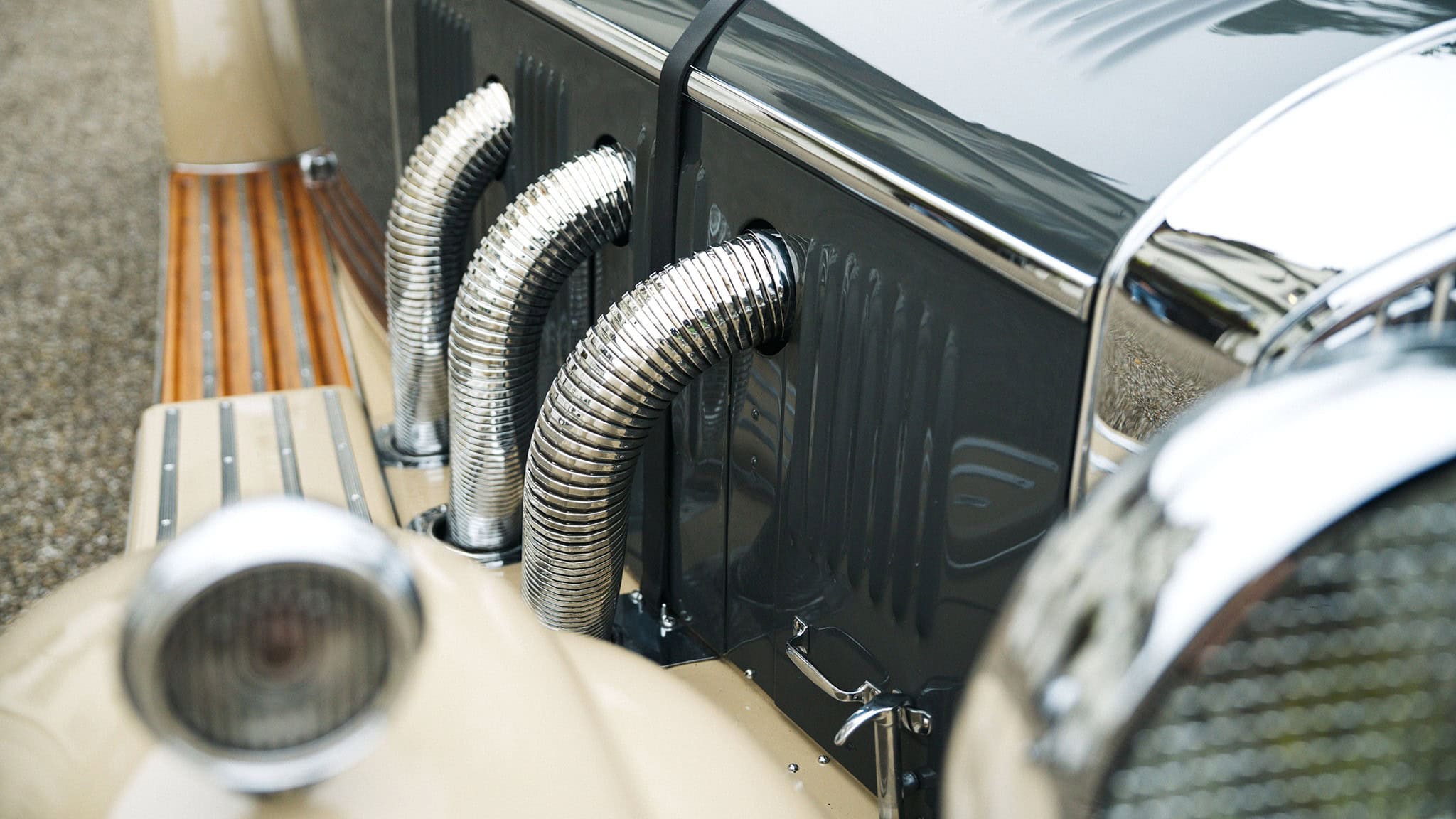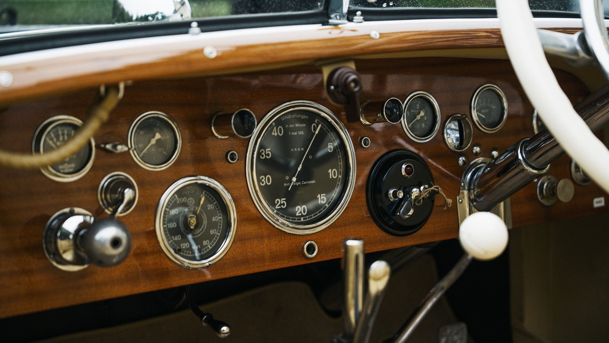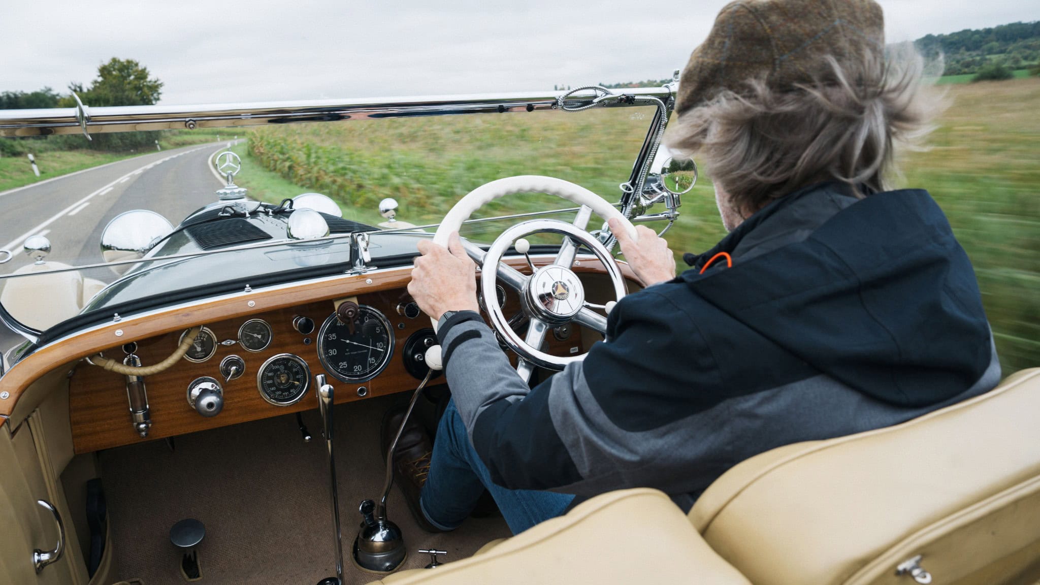 Sur l’autoroute, la Mercedes SS a roulé joyeusement à 120km/h, le gros/grand six cylindres en ligne tournant à 1 700 tr/min, l’échappement sifflant comme les pales du rotor d’un Huey fendant l’air tropical dans Apocalypse-Now. En appuyant sur la pédale d’accélérateur au sol pour engager le compresseur, on ajoute seulement 40 cv à la puissance maximale atmosphérique du moteur de 160cv. J’ai brièvement piqué l’ours sur le chemin de Sindelfingen pour que je puisse entendre le beuglement caractéristique du compresseur, un son de trompette distinctif qui a donné aux versions de course peintes en blanc de la W06, des roadsters SSK et SSKL, le surnom d’éléphants blancs parmi les fans de course. Les mécaniciens m’ont dit au retour que j’avais pris des libertés…