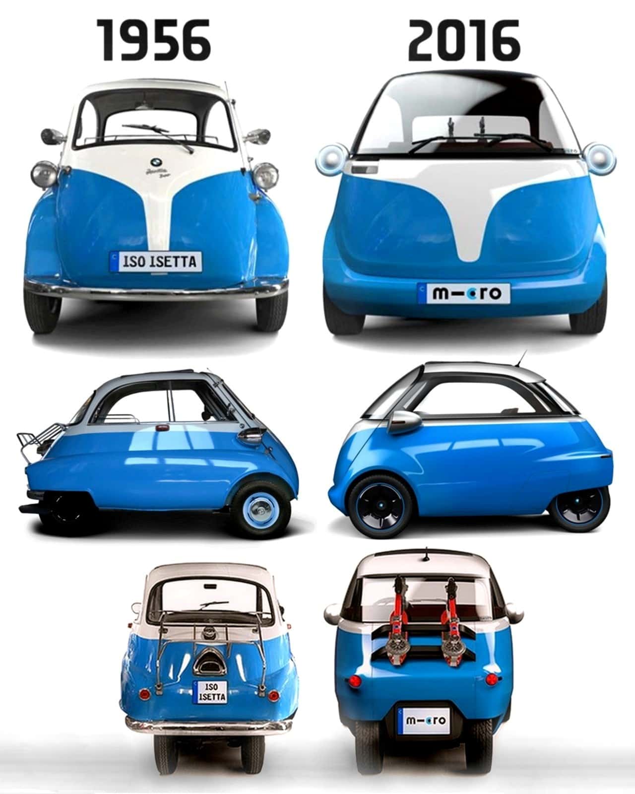 La Microlino, au premier regard, au “premier coup d’œil”, la première impression est qu’il s’agit d’une micro-voiture science-fictionneste-uchronique, une renaissance de l’Isetta suivant l’air du temps automobile actuel. L’Isetta était le nom d’un véhicule urbain compact conçu par la firme italienne ISO Rivolta, l’une des microcitadines les plus populaires produites après la Seconde Guerre mondiale, à un moment où les trajets de courte distance étaient privilégiés. Nombre de personnes n’avaient pas les moyens financiers de s’offrir de grosses automobiles et se tournaient vers les scooters ou les motos. Diverses séries ont été produites (sous licence où en copie) en Espagne, Belgique, France, Brésil, Royaume-Uni et surtout en Allemagne par BMW.