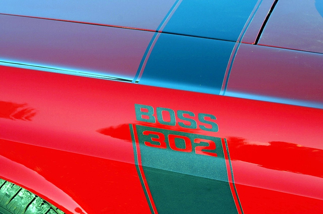 Des bandes de décoration en forme de “C” soulignées par un “Boss 302” venant interrompre la branche verticale du “C” étaient apposées sur les flancs de l’auto. La voiture était disponible en 4 coloris, le capot recevait un noir mat du plus bel effet, tout comme les entourages de phare et le panneau arrière.