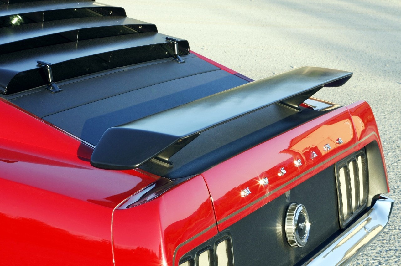 Un spoiler noir mat faisait également partie de l’équipement de série. Du côté des jantes, la Boss 302 disposait en série de jantes de style en tôle avec un cache écrou central plat, les jantes magnum 500 faisaient partie de la longue liste d’options dont les persiennes de custode arrière et le becquet de coffre.