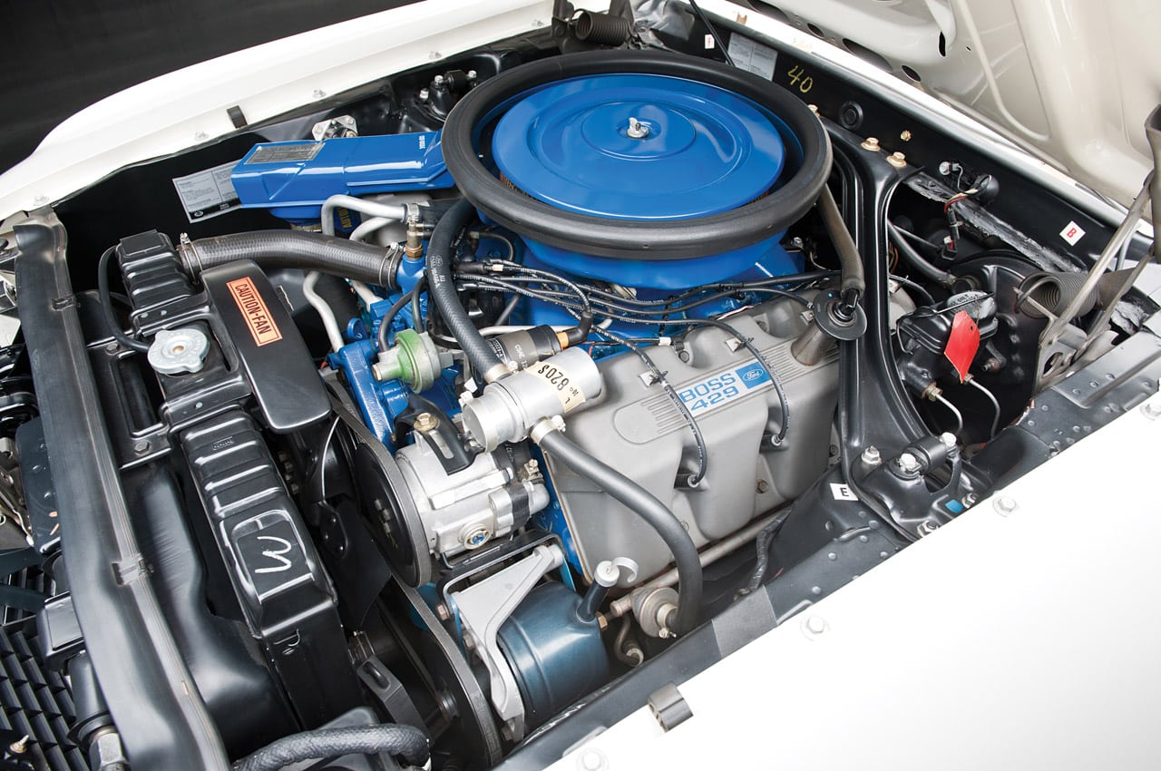 Un radiateur d’huile additionnel était disposé devant le radiateur d’eau. Les chambres de combustion avaient une forme bien spécifique, pas complètement sphériques, mais dotées de soupapes énormes (admission = 58 mm, échappement = 48 mm) et inclinées. Il eu plusieurs versions de ce moteur en 1969, les 279 premières reçurent des bielles spécifiques rigidifiées. Les moteurs portaient le code S. Les autres Boss 429 de 1969 troquèrent ces lourdes bielles pour des plus légères (code T). D’autres modifications de mise au point profitèrent à cette nouvelle série, comme un arbre à cames plus pointu ou des pièces en aluminium pour remplacer celles qui étaient en magnésium. Pour alimenter ce moteur, un seul carburateur quadruple corps Holley de 735 cfm coiffait l’imposant collecteur d’admission.