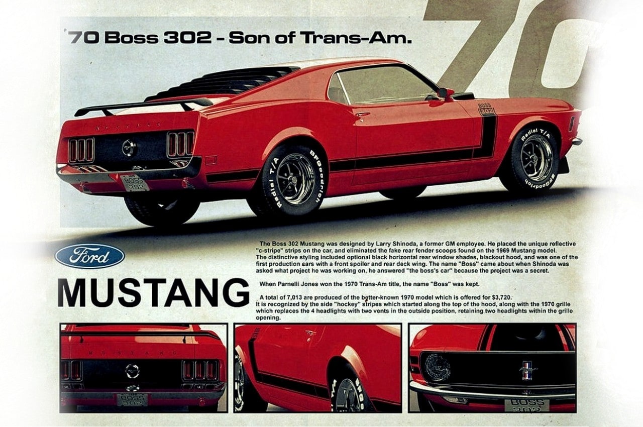 Au début du projet, la voiture ne portait pas de nom. Mais pourquoi Boss ? Les dirigeants de Ford voulurent l’appeller “SR-2“, “SR” pour “Sports Racing“, mais Shinoda trouvait ça stupide car se rapprochant trop du “Z/28” de Camaro. Bunkie, lui, avait un autre nom en tête, un nom qui allait bientôt résonner dans toutes les têtes ! Puisque cette voiture se devait être ce qui se fait de mieux, alors pourquoi ne pas l’appeller Boss !