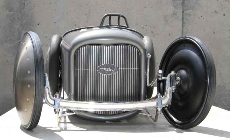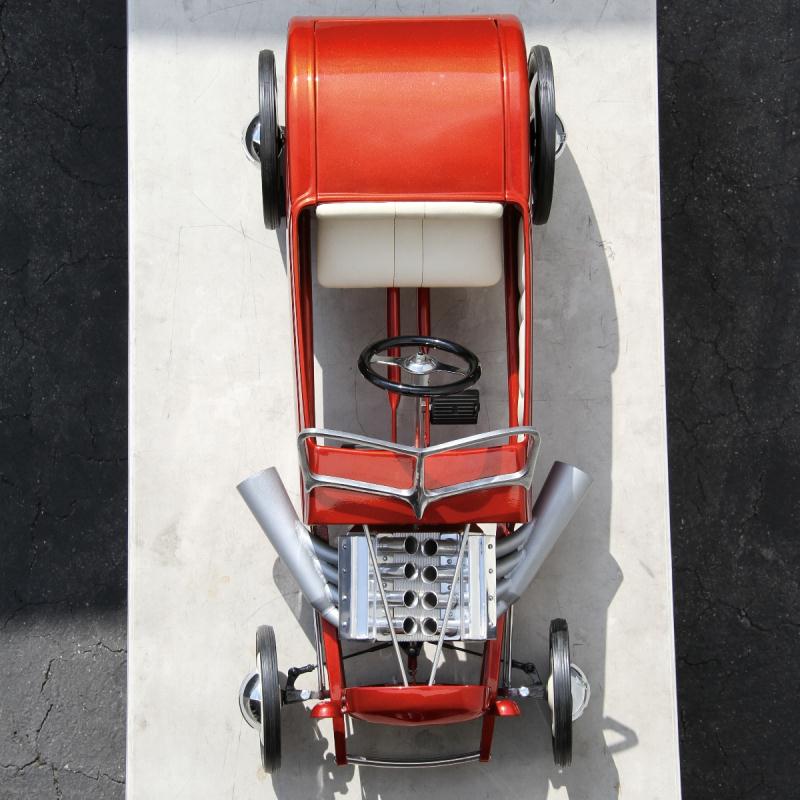 This particular pedal car features a completely hand-built, all-steel body by Hollywood Hot Rods, which accurately mimics a real ’32 roadster and is built as a tribute to Troy Ladd’s famous HHR-built “Respect Tradition” roadster. It includes a miniature, fuel-injected Hemi engine, Duvall windshield, dropped I-beam axle, leather interior, and powder coated exterior. Special attention was given to ensure that the car can still be operated by a child as a pedal car.