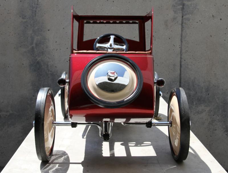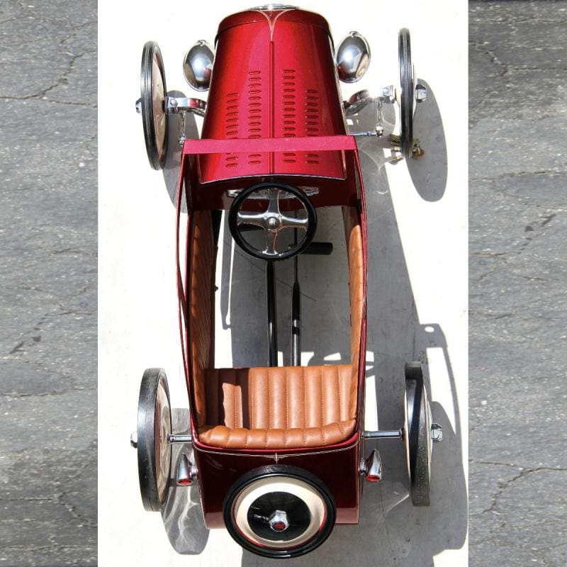 This delightful, little B-400 pedal car sports mini Woodlite headlamps, jeweled Ruby Red taillights, a leather interior, leather sliding top, stainless steel tube grille, chrome “one-off” hubcaps, a drilled chrome I-beam front axle with chrome hairpins, and a mini Art Deco 1920s dash gauge cluster.