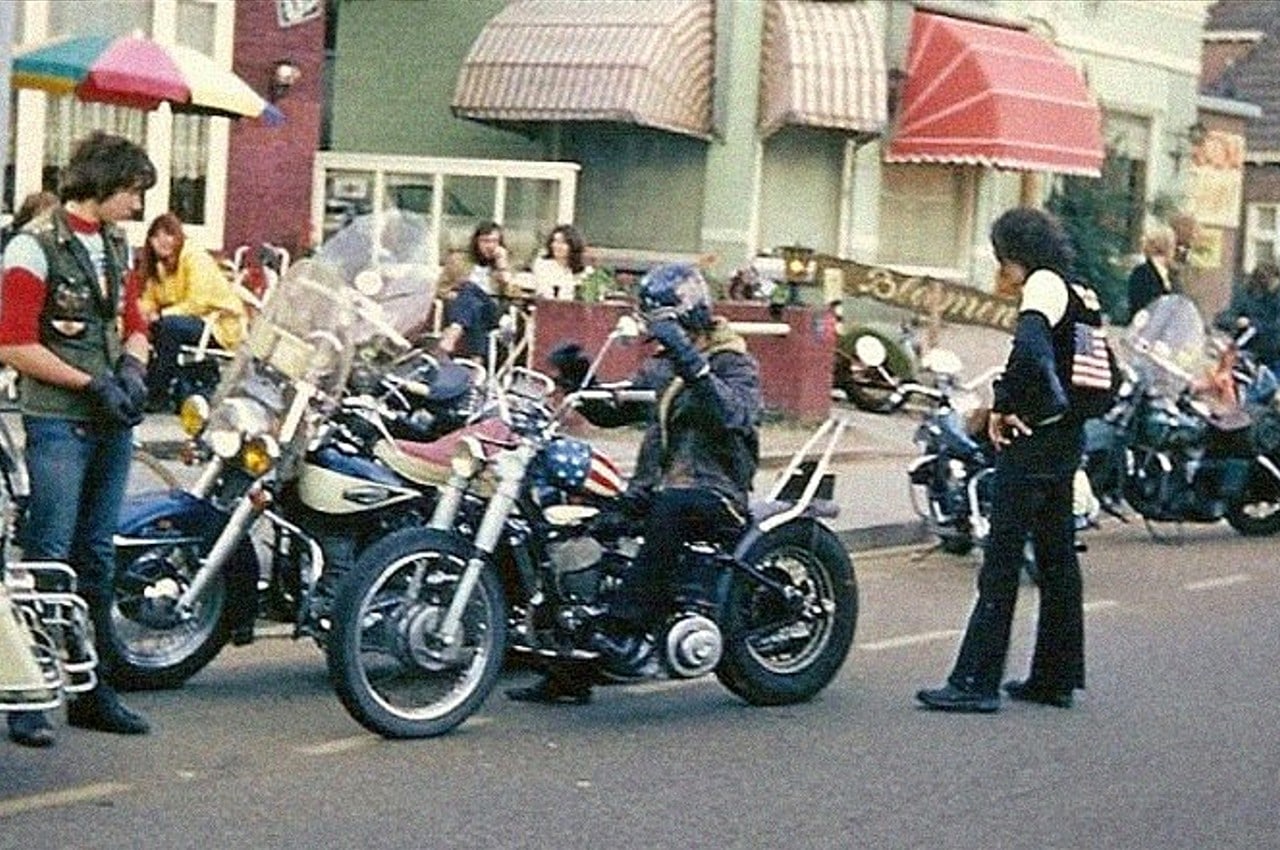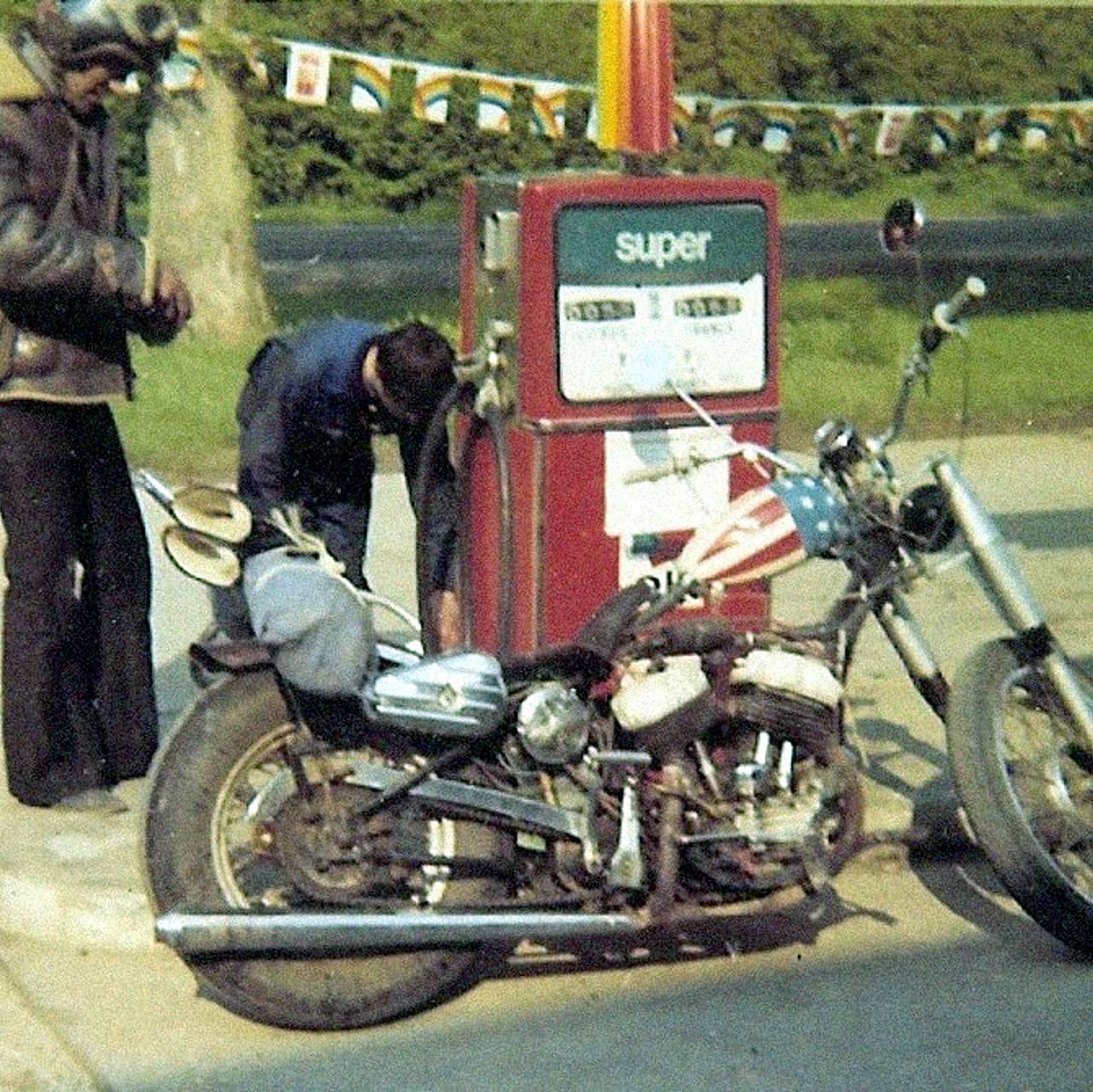 – Hélas mon pote est revenu très malade, je l’ai su bien plus tard, il a choppé un cancer et il n’a pas voulu que ses potes viennent le voir diminué… et il est mort ! Encore une fois ou j’ai chialé. C’était vraiment un mec bien. Ensuite j’ai eu ma période rallyes… Tous mes potes allaient en Hollande et en Belgique… et moi sans papiers je ne pouvais aller nulle part (normalement) ! Quand je suis allé la première fois en Hollande c’était en ’73 à un rallye a Doetinchem. Mon Chopper spécial avait un réservoir de mobylette (5 litres) peint aux couleurs du drapeau américain, je me suis mis au milieu des potes et j’ai pu passer comme ça, putain si j’étais joisse et après j’ai fait beaucoup de concentres en Hollande et en Belgique, il y avait toujours des moments de relachement chez les douaniers, on en profitait avec les potes pour passer… et toujours au milieu de la bande de bikers, les potes chahutaient avec les douaniers pour les distraire un peu et hop…, je dois avouer qu’on était tous joisses…