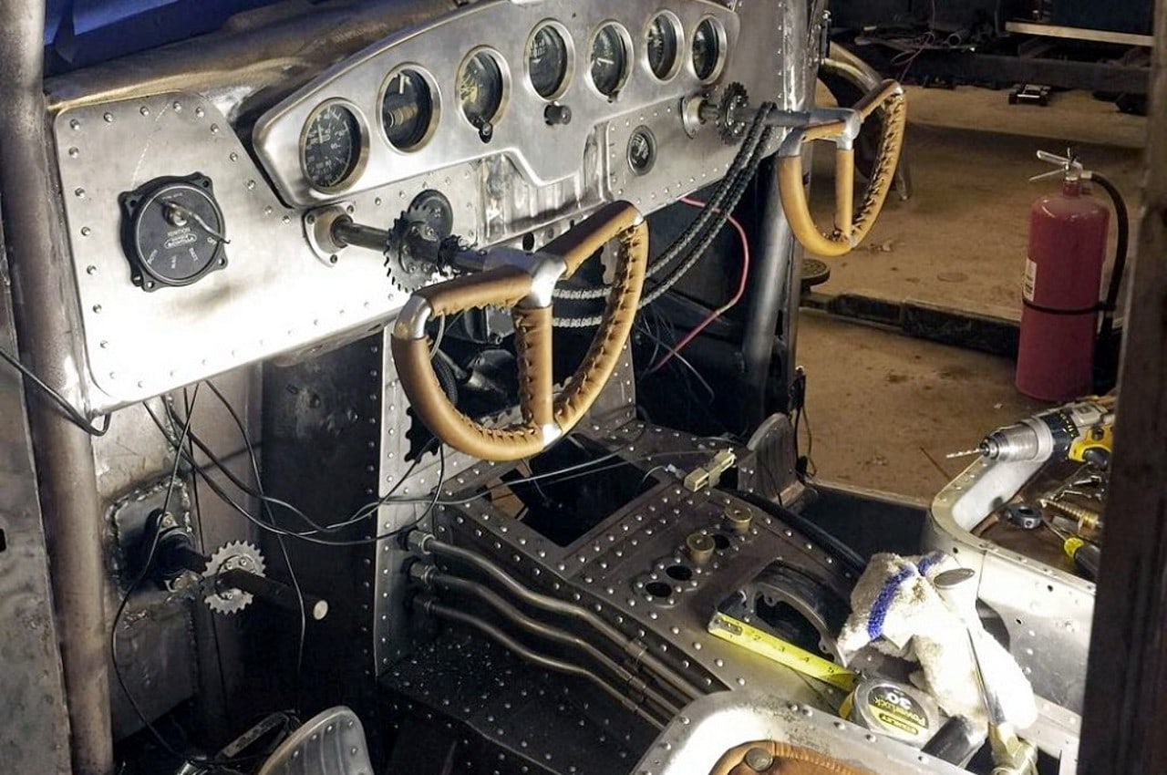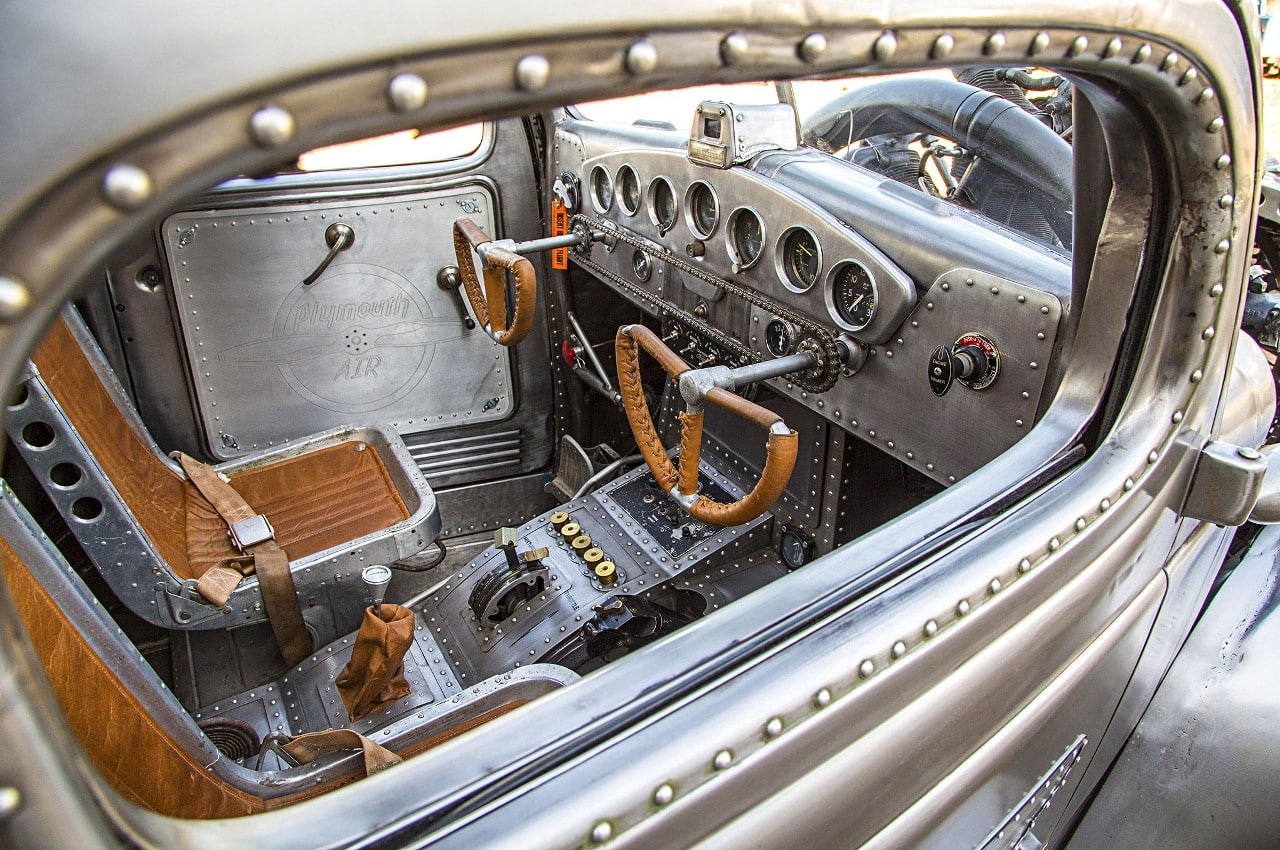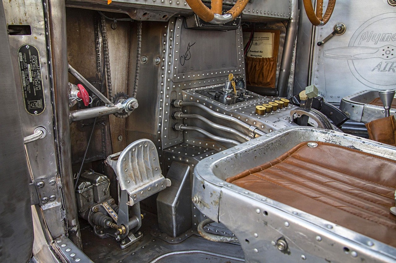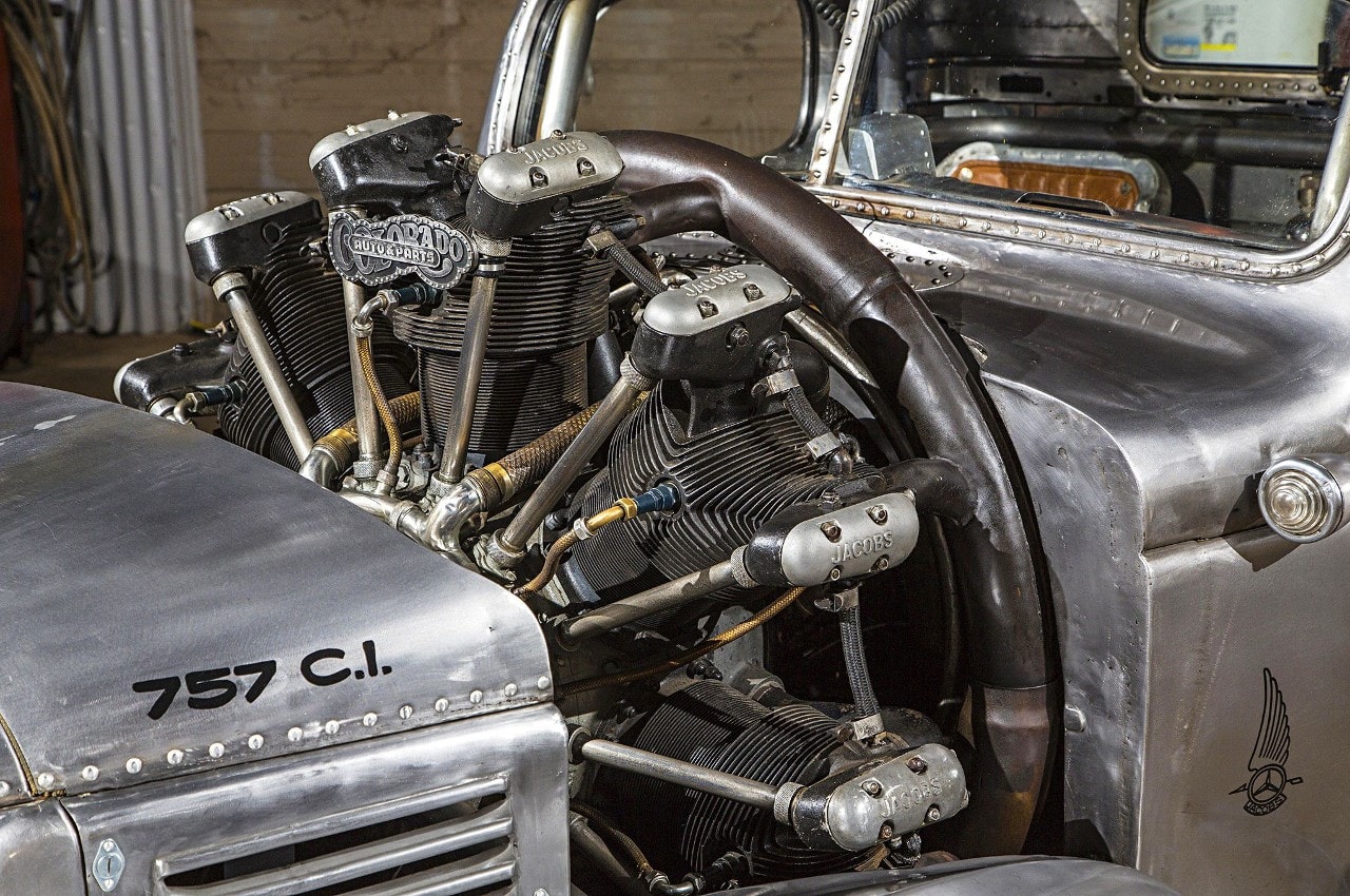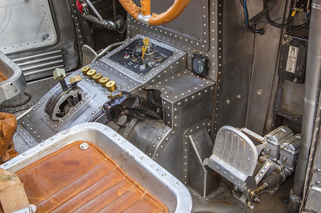 (La pièce maîtresse est évidemment le moteur d’avion étoile, un sept cylindres 12,5 litres construit par Jacobs Aircraft Engine Company pour le Cessna 195… il produire 300 chevaux, le moteur n’a pas été choisi évidemment parce qu’il fait une tonne de puissance, il était plutôt un choix esthétique et thématique, comme le reste adoptait le look d’un avion de l’époque des années ’30 qui inclut de la tôle rivetée, une paire de commandes pour le pilote et le copilote qui apparaissent comme s’ils venaient tout droit sur le Spirit of St. Louis)…