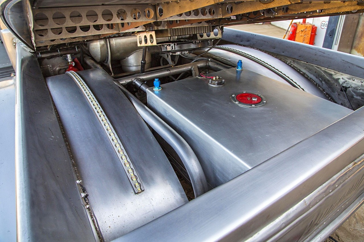 (Le haut a été coupé, l’arrière a été tubbed et solide de main-résisté plus de 1.000 rivets maintenant les lignes de suivi autour de panneaux. Le châssis initial a été abandonné en faveur d’un châssis tube personnalisé, qui s’étend de l’extrémité avant du camion pour faire place au Jacob’s sept cylindres. Ce moteur d’avion a été conçu pour tourner une hélice, obtenir la puissance à la trans automatique Turbo 400 et rétrécie Fenders de changement rapide de Franklin a pris quelque temps de mon temps, avec la plupart des composants soit récupérés dans l’yard ou frottée dans la boutique).