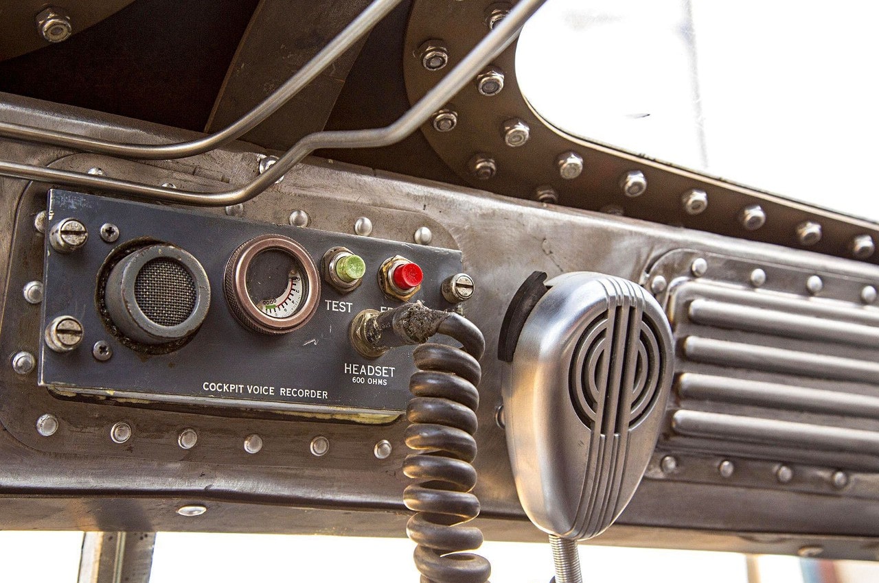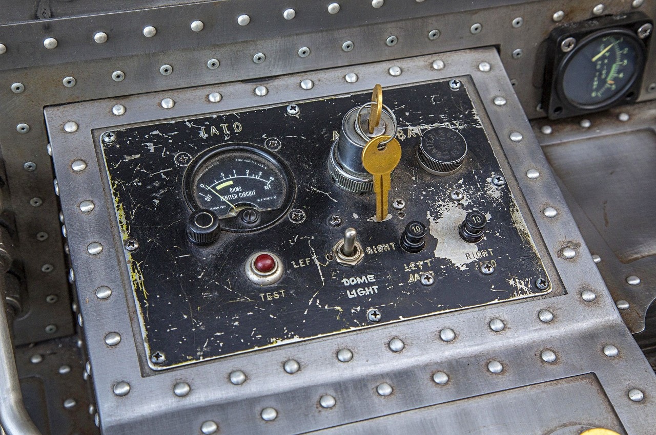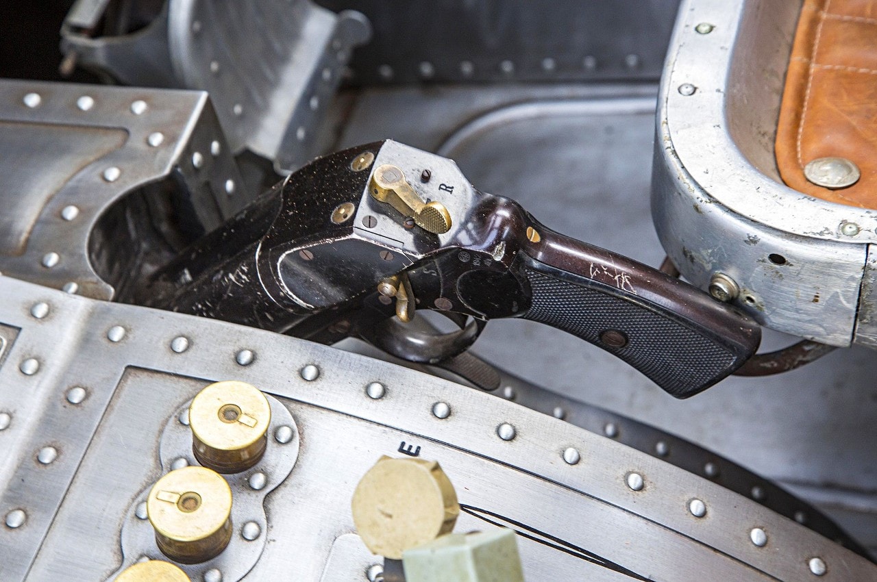 (Pitot tubes et avions lumières parsèment l’extérieur et l’intérieur, visage de sièges d’avion cuir double jougs et un tableau d’indicateurs de direction destinés à voler au-dessus des nuages. Coup d’obus de la cartouche et démarreur shotgun dans la console frottée).