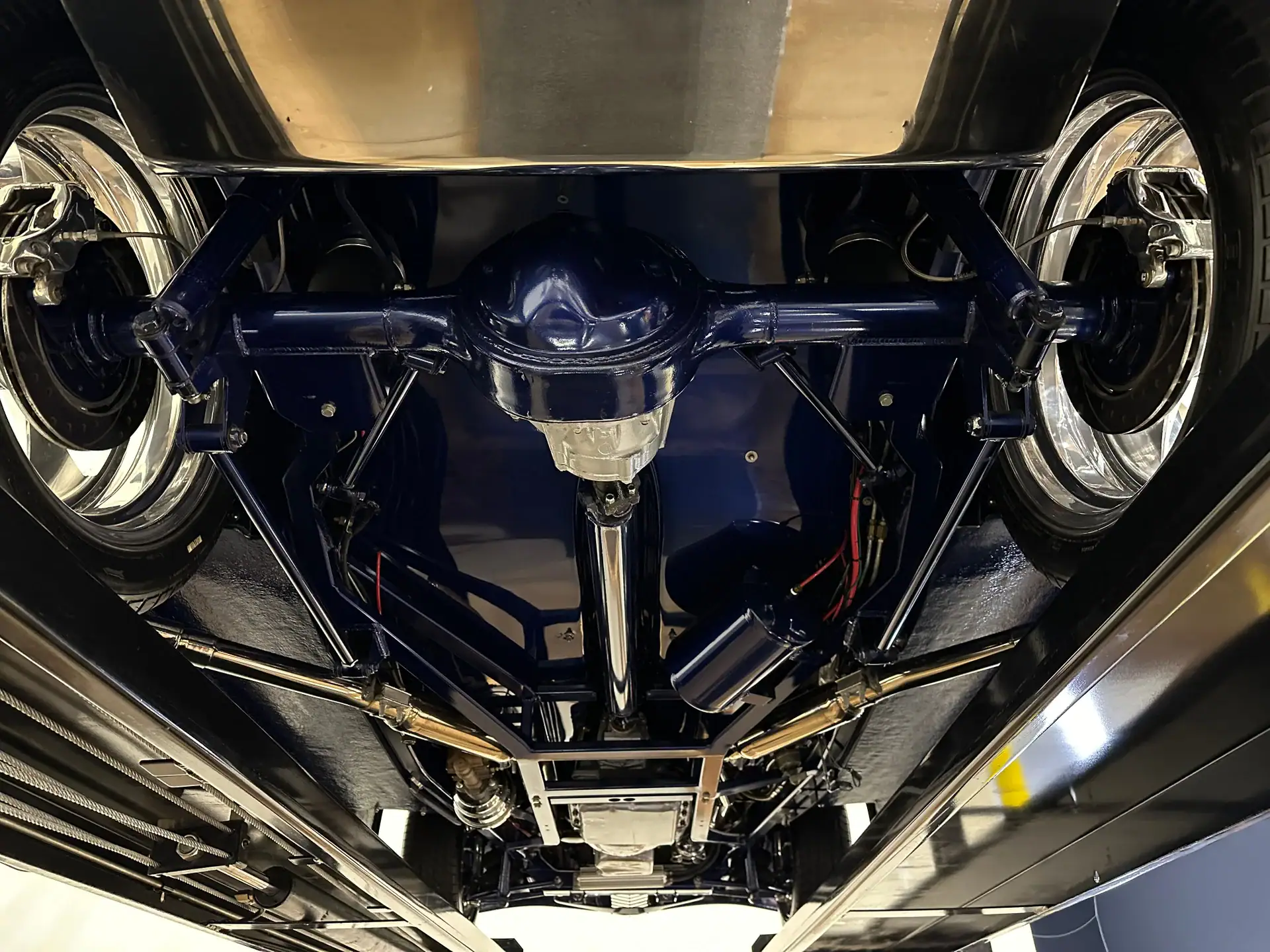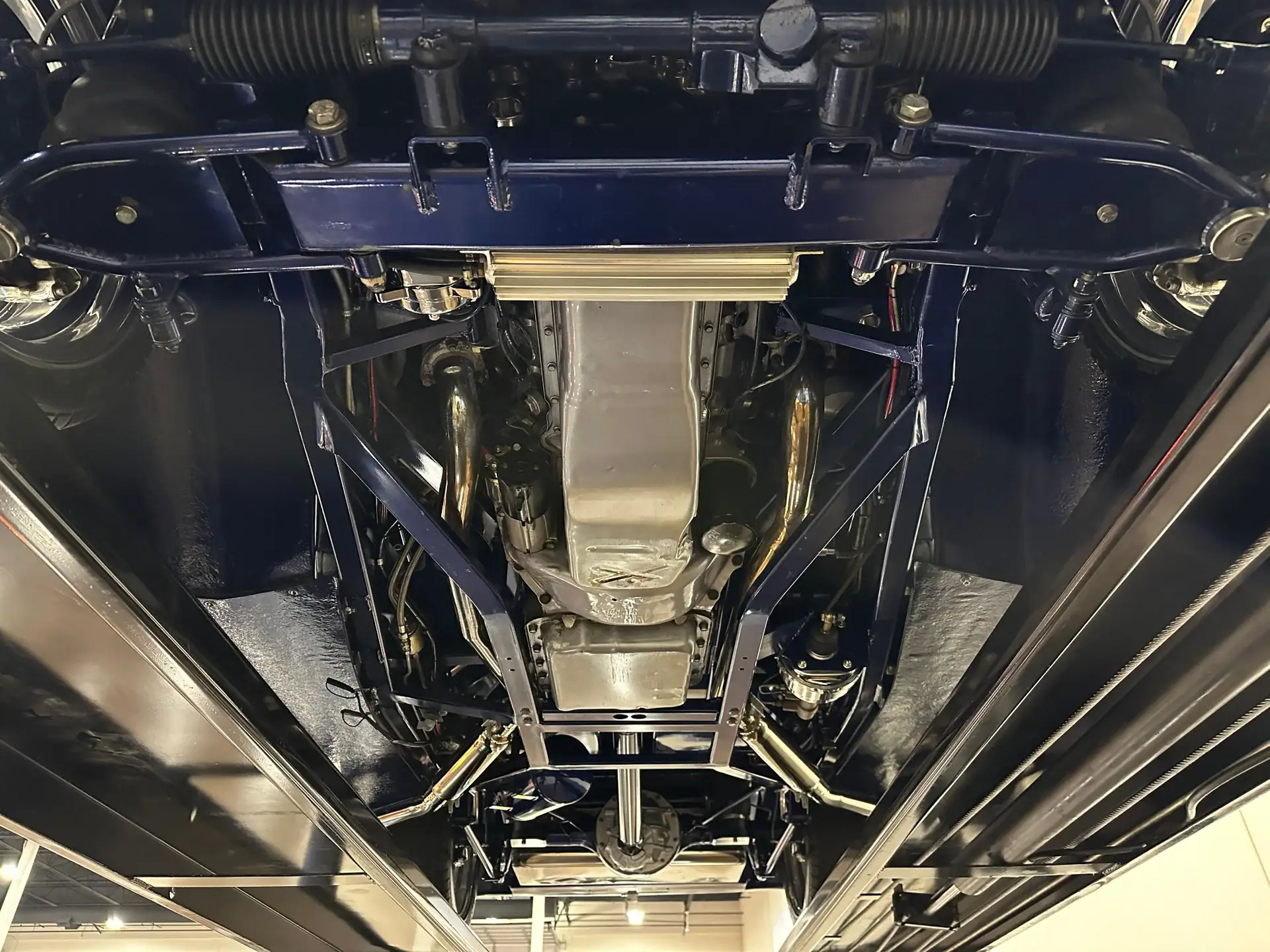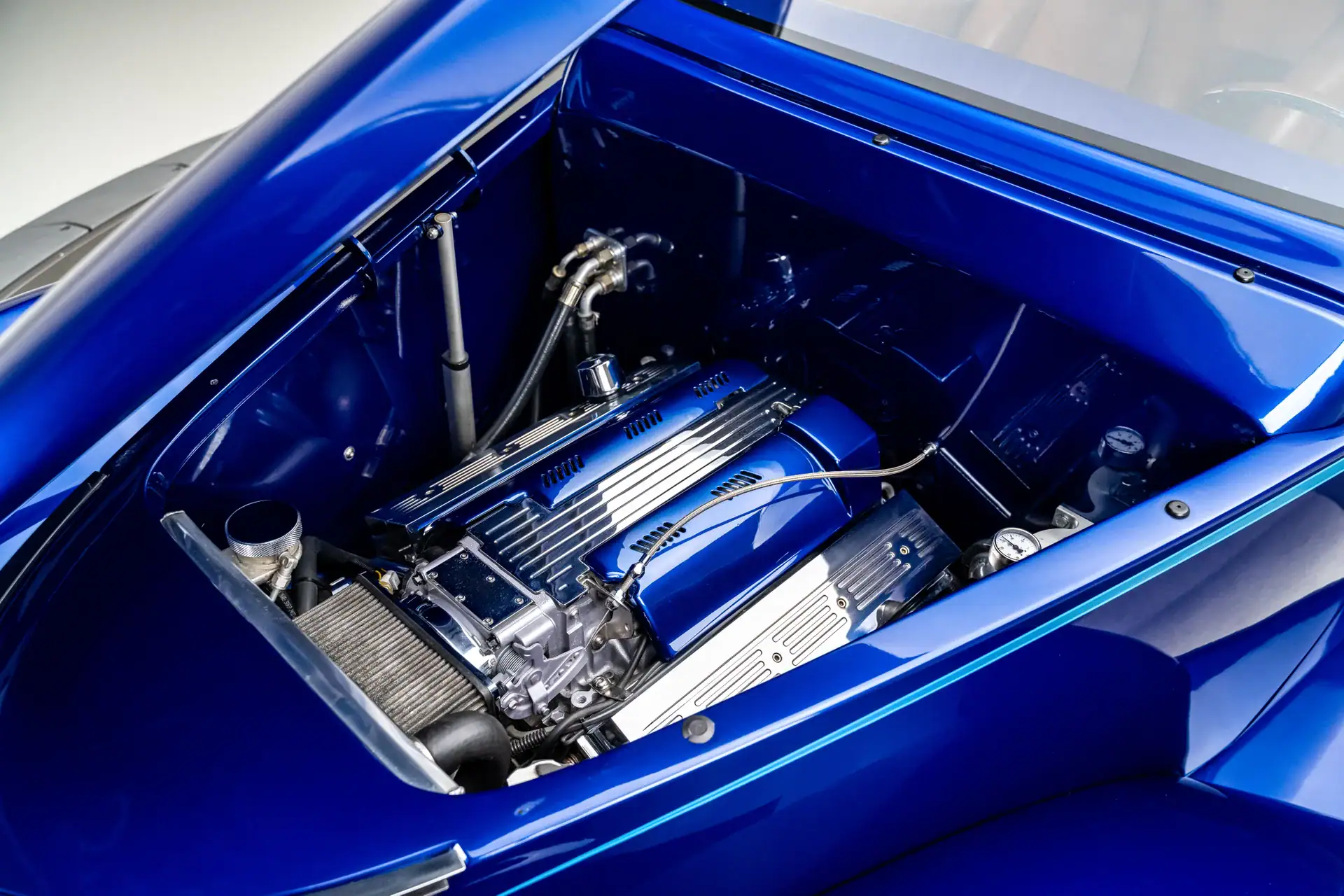Elle offre une finition bleue miroir qui souligne la silhouette basse et large du coupé. Ce Hot Rod repose sur un sur-châssis “Fat Man Fabrications” entièrement personnalisé, doté de longerons caissonnés et de traverses tubulaires pour une robustesse optimale. La couleur du châssis a été méticuleusement assortie à celle de la carrosserie, créant ainsi une harmonie visuelle. Un V8 Chevy small block de 5,7 litres (350 pouces cubes), peint en argent pour créer un contraste, propulse le coupé. L’injection électronique garantit performance et fiabilité. Des collecteurs d’échappement Sanderson et un système d’échappement libre optimisent ses performances, tandis qu’une transmission 4L60E de National Trans assure des passages de vitesses fluides et sans effort grâce à un levier Lokar. La suspension pneumatique Air Ride Technologies est la clé de l’allure irrésistible de cette Ford. Elle permet d’ajuster la hauteur de caisse à volonté, abaissant le coupé pour un look “fête foraine” lors des expositions ou le relevant pour une conduite plus tranquille.