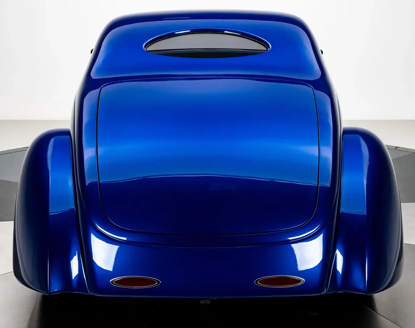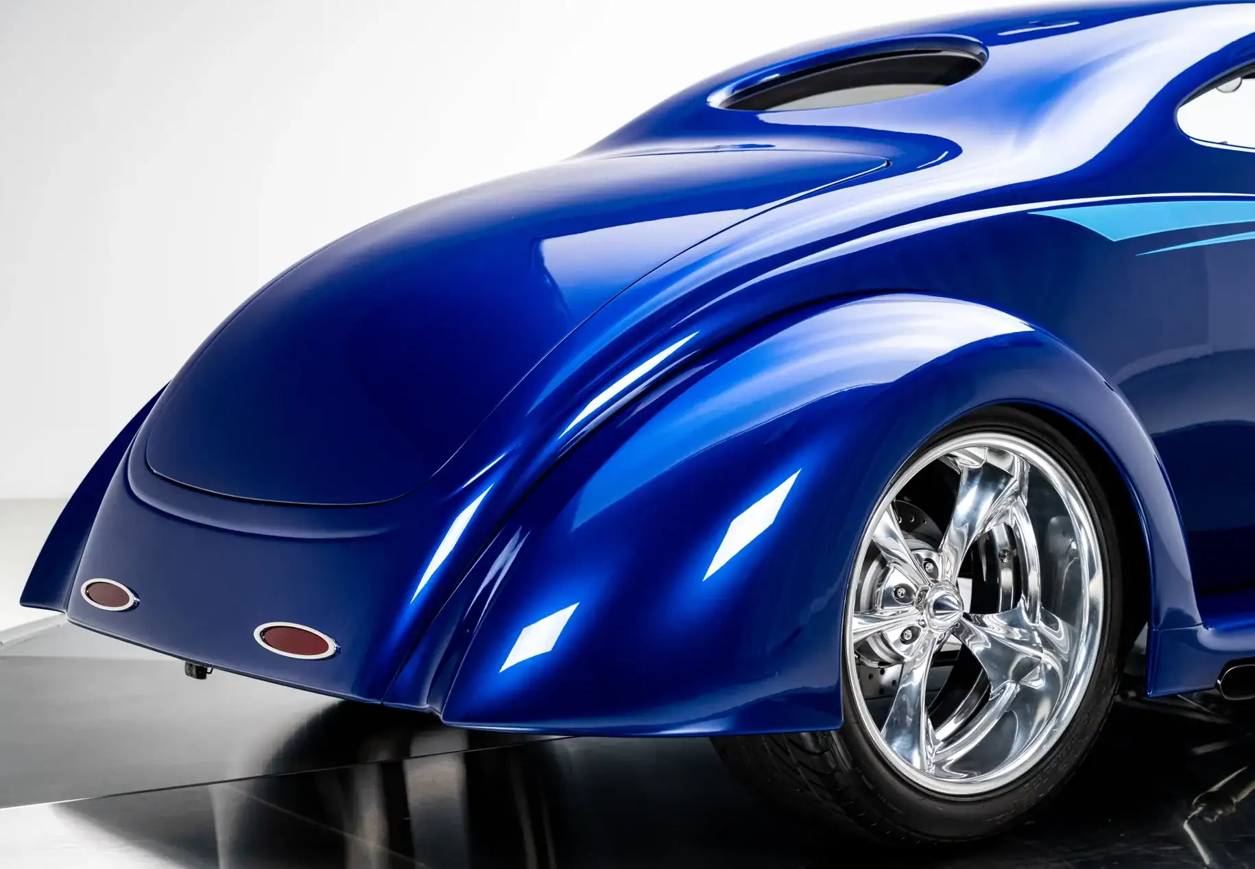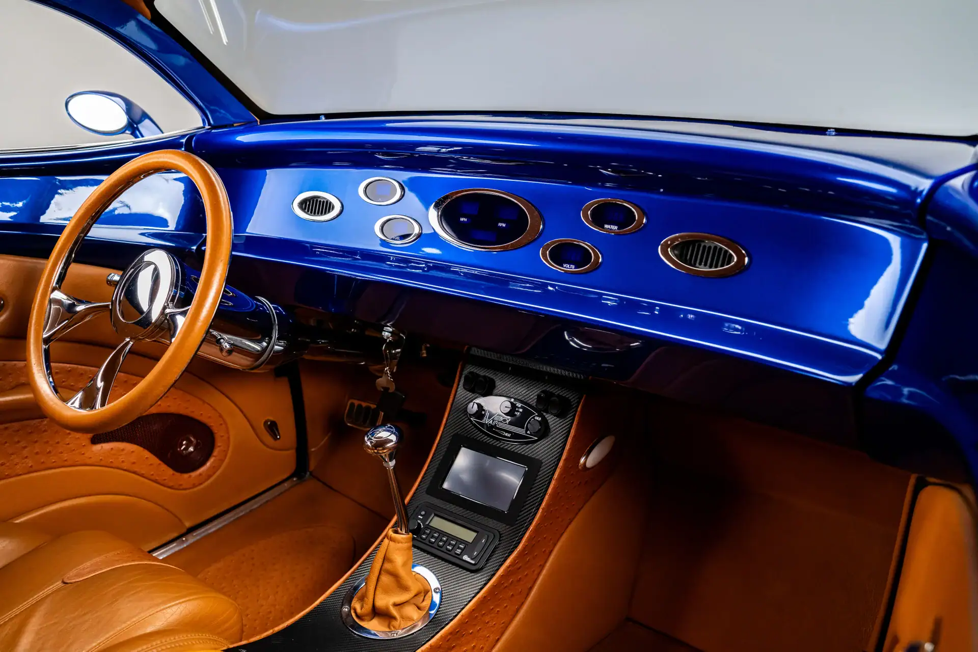 Alliant design classique et ingénierie de pointe, il affiche une présence unique sur la route. Réputé pour son souci du détail, Mike Bates, propriétaire de Color Craft à Hobart, dans l’Indiana, s’est inspiré du mouvement “stance”, qui prône l’abaissement extrême des voitures. Sa Ford de 1937 pousse ce concept encore plus loin – ou plutôt, à un niveau d’abaissement inédit – grâce à un châssis sur mesure et une suspension pneumatique qui permettent à ce coupé 5 fenêtres de reposer quasiment à plat sur le sol. Au cœur de cette préparation se trouve la superbe carrosserie en fibre de verre d’Oze Rod Shop, qui conserve la calandre et l’emplacement des phares caractéristiques de la Ford de 1937 d’origine, tandis que son toit fortement abaissé et ses lignes fluides lui confèrent un profil moderne et agressif. Bates a sublimé le design avec des phares de Mini Cooper de 2006, parfaitement intégrés aux ailes pour une allure élégante et harmonieuse. La carrosserie a ensuite reçu plusieurs couches de peinture Sikkens Blue Pearl.