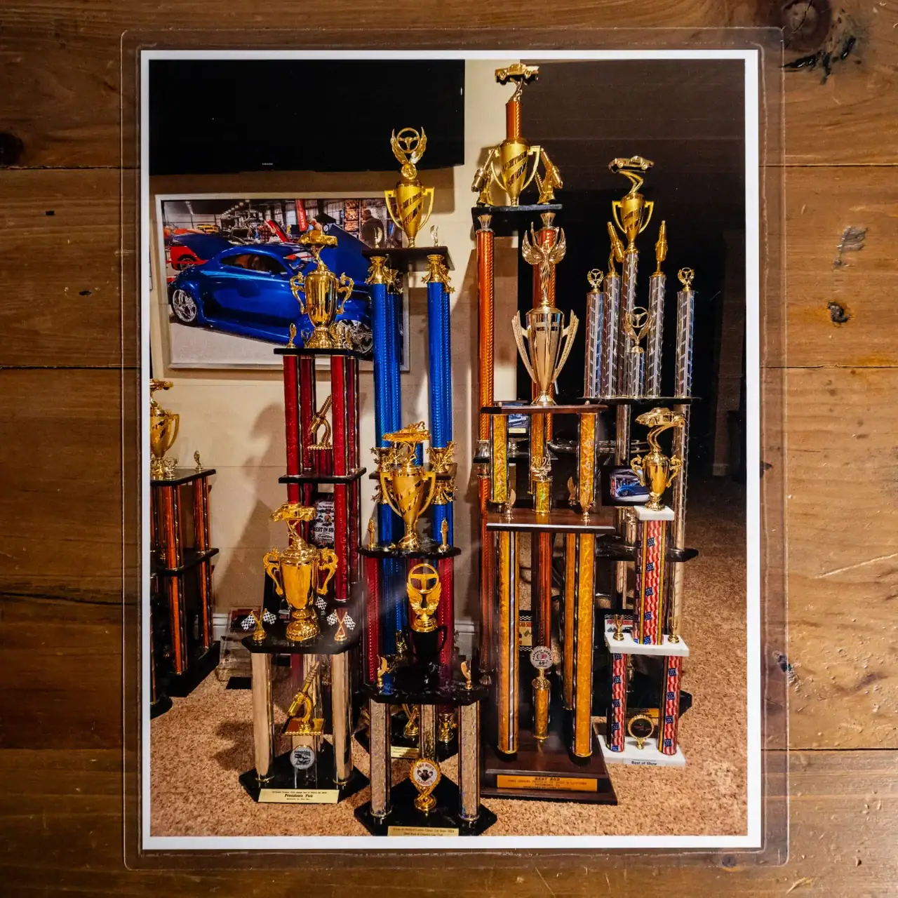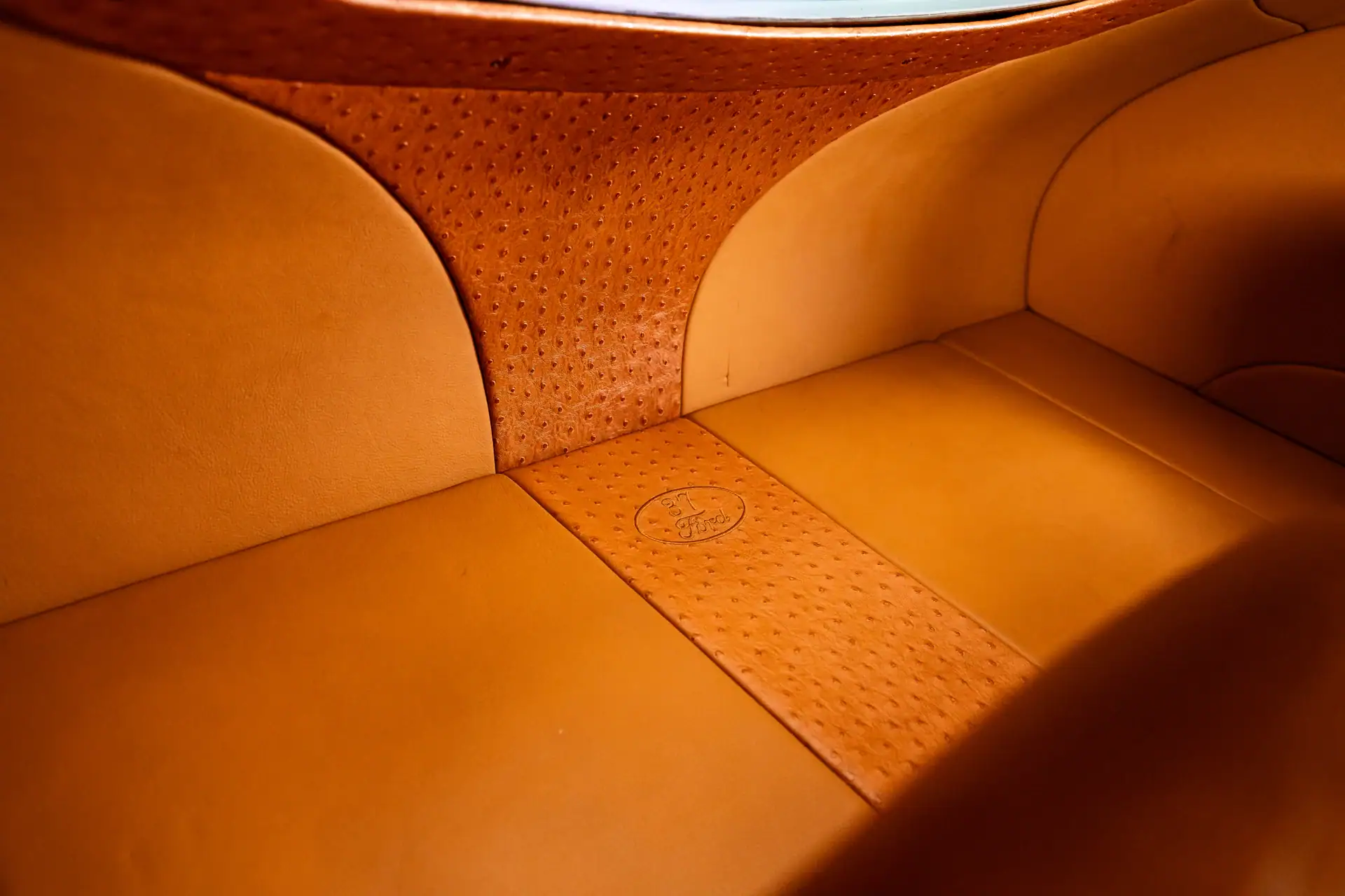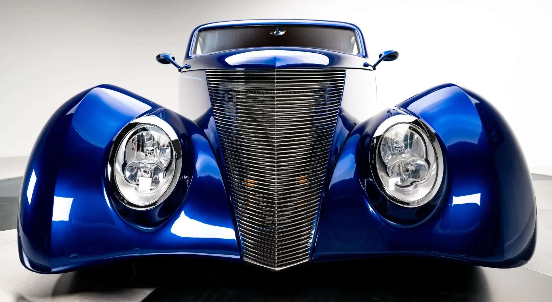 Alliant design classique et ingénierie de pointe, il affiche une présence unique sur la route. Réputé pour son souci du détail, Mike Bates, propriétaire de Color Craft à Hobart, dans l’Indiana, s’est inspiré du mouvement “stance”, qui prône l’abaissement extrême des voitures. Sa Ford de 1937 pousse ce concept encore plus loin – ou plutôt, à un niveau d’abaissement inédit – grâce à un châssis sur mesure et une suspension pneumatique qui permettent à ce coupé 5 fenêtres de reposer quasiment à plat sur le sol. Au cœur de cette préparation se trouve la superbe carrosserie en fibre de verre d’Oze Rod Shop, qui conserve la calandre et l’emplacement des phares caractéristiques de la Ford de 1937 d’origine, tandis que son toit fortement abaissé et ses lignes fluides lui confèrent un profil moderne et agressif. Bates a sublimé le design avec des phares de Mini Cooper de 2006, parfaitement intégrés aux ailes pour une allure élégante et harmonieuse. La carrosserie a ensuite reçu plusieurs couches de peinture Sikkens Blue Pearl.