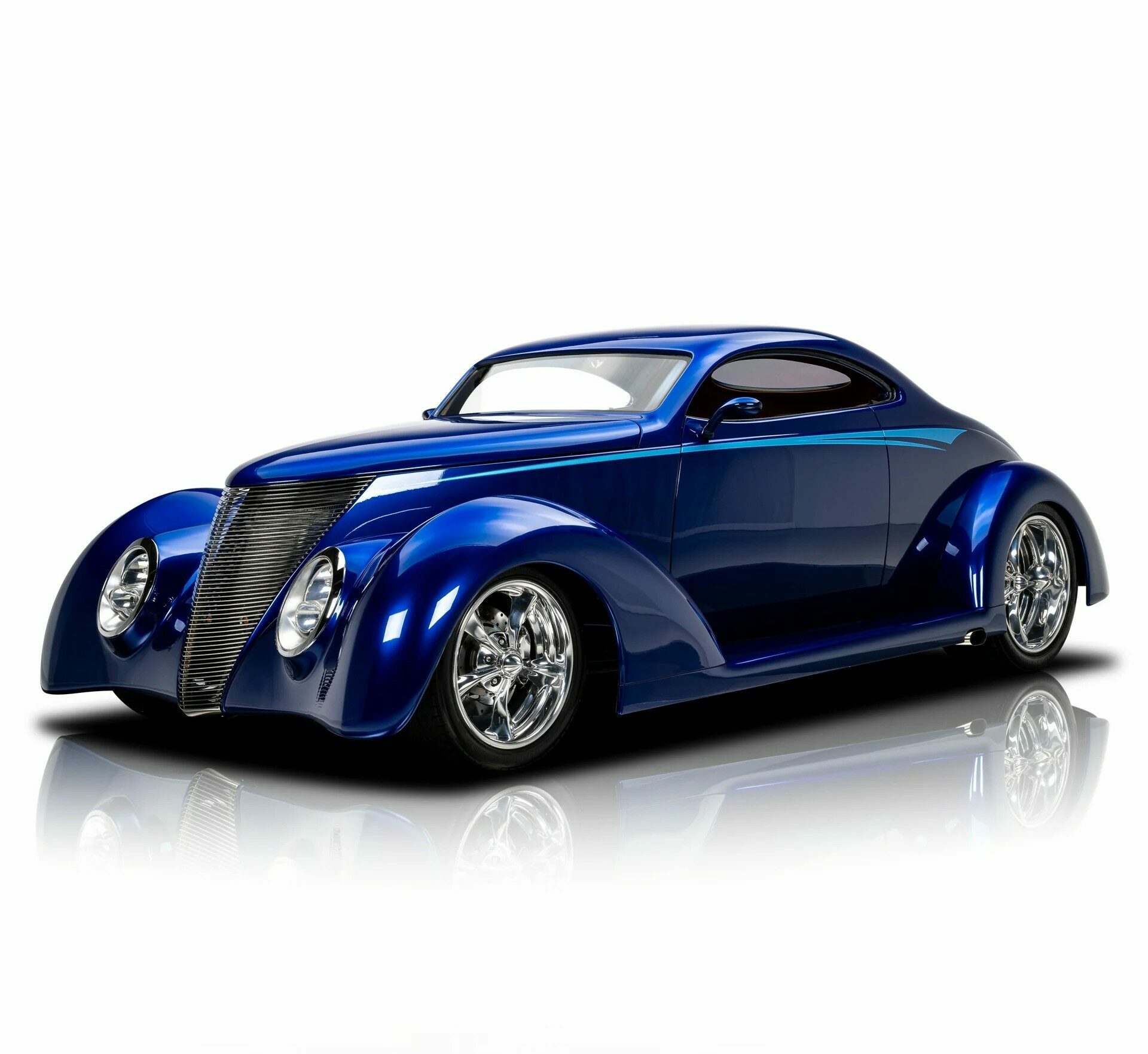 Un volant Billet Specialties harmonise l’ensemble du design intérieur, tandis que le système audio dissimulé dans le coffre, avec écran LCD et lecteur DVD, apporte une touche de modernité. Avec son palmarès exceptionnel, notamment ses récompenses aux événements Goodguys, ce coupé Ford 1937 radical est aussi performant qu’impressionnant. Sa construction est un parfait mélange de culture Hot Rod classique et d’innovations modernes… Custom Built ’37 Ford 5 Window OZE Coupe… Chevrolet LT1 350ci small block V8 engine… Electronic Fuel Injection… 4L60E automatic transmission with overdrive… Lokar shifter… Chassis built by Fatman Fabrication… Boxed rails and tubular cross members… Rack and pinion steering… Sikkens Blue Pearl paint… Ford 9 inch rear end 3.70 gears… Air Ride suspension… Vintage Air air conditioning… Four wheel Wilwood disc brakes… 17 inch front, 20 inch rear Billet Specialties wheels… Custom leather interior… Dakota Digital gauges… Billet Specialties steering wheel… Trunk mounted LCD monitor and DVD player… Titled as a 1937 Ford…