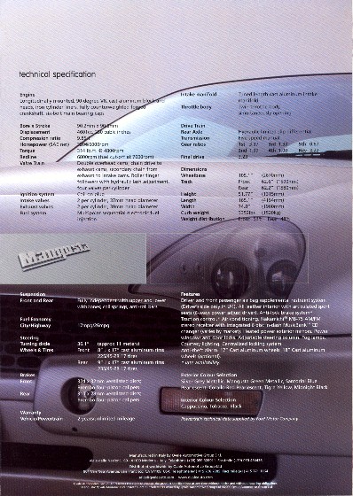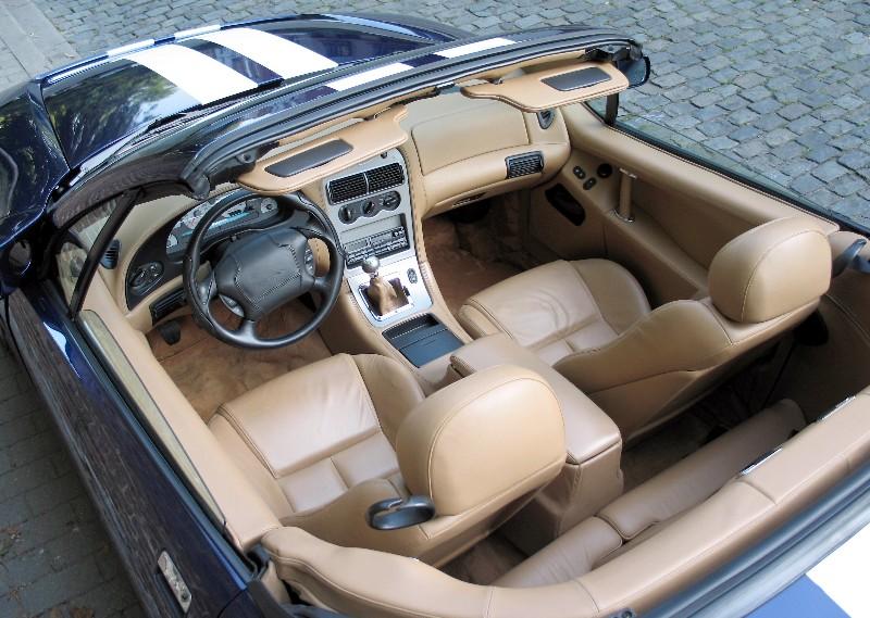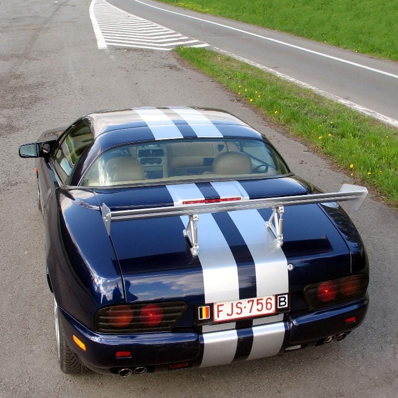V8 à 90° (Ford-Cobra) Energie : Essence Disposition du moteur Longitudinal avant Alimentation Gestion intégrale Suralimentation – Distribution 2 arbres à cames en tête Nombre de soupapes 2 par cylindre / 32 Soupapes Alésage & Course 90.2 x 90.0 mm / GTR N.C. Cylindrée 4601 cc / 4.925 GTR Compression 9.85 / GTR N.C. Puissance 320 cv à 6000 tr/min / 365 cv GTR Couple 43.4 mkg à 4800 tr/min / GTR N.C. Boite de vitesse 5 rapports Puissance fiscale N.C. Transmission Propulsion Antipatinage Non / Oui GTR ESP Non / Oui GTR Direction Crémaillère, assistée Suspensions Av Triangles superposés Suspensions Ar Triangles superposés Longueur 419 cm Largeur 190 cm Hauteur 132 cm Cx – FreinsAv Disques ventilés Brembo (324mm) FreinsAr Disques ventilés Brembo (310mm) ABS De série PneuAv 225/45 ZR17 PneuAr 235/45 ZR17 Poids 1300 kg