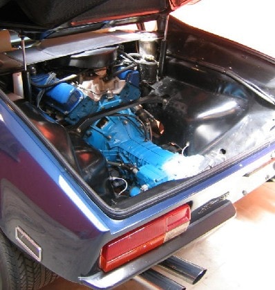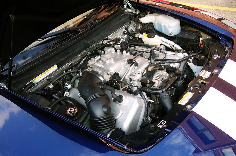 L’enveloppe allouée au projet n’avait semble-t-il pas permis aux designers de s’attarder plus longtemps sous le capot ni d’effacer le petit Shelby Cobra du collecteur d’admission…, un détail charmant soit dit en passant.