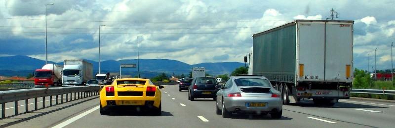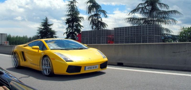 Retour vers le grand-nord…., vitesse imposée par le code de la route, 130 km/h et 110km/h par temps de pluie… Grosse surprise aux environs de Montélimar, une Lamborghini Gallardo V-10 me double à 200 km/h… Au hasard du trafic, elle vient titiller également une Porsche…