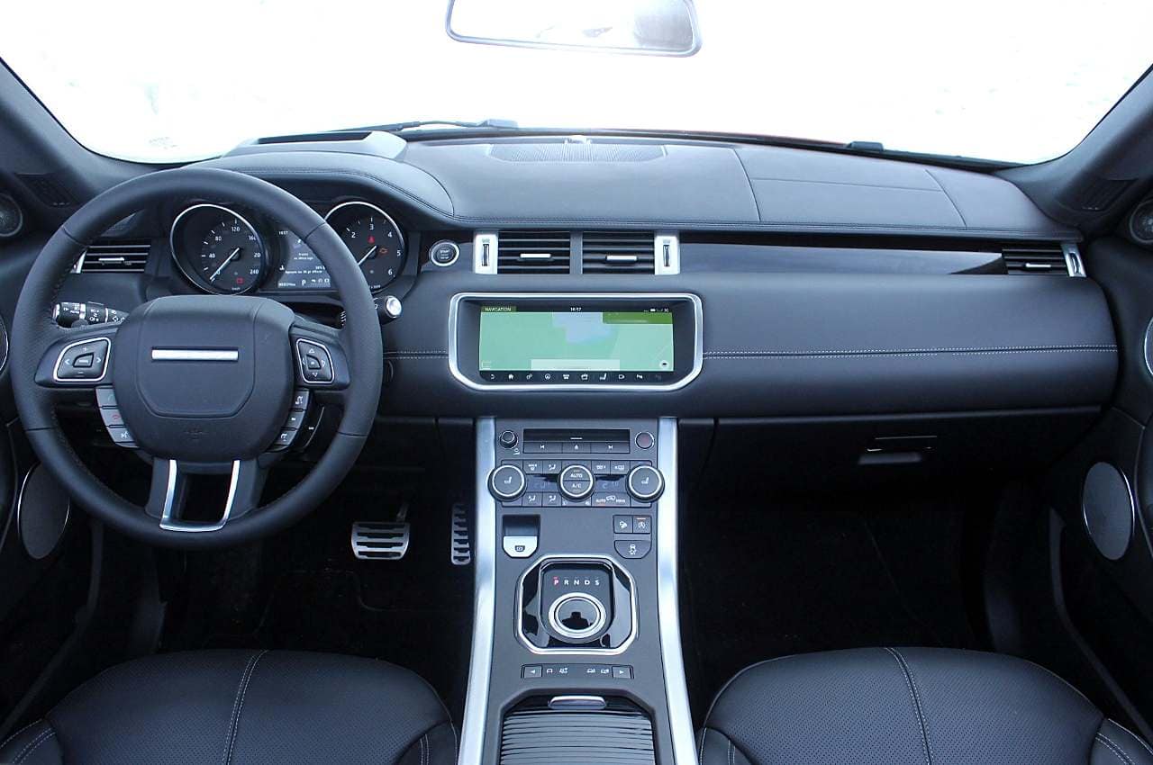 A bord de ce cabriolet, aucune surprise, on se retrouve bel et bien à bord d’un Evoque sauf que les portières relativement lourdes marquent la différence… et comme elles sont très hautes, conduire le coude à la portière ce n’est pas dans son style…, en revanche, d’excellents sièges avant maintiennent parfaitement le corps, ils sont aussi confortables, chauffants et bien dessinés.