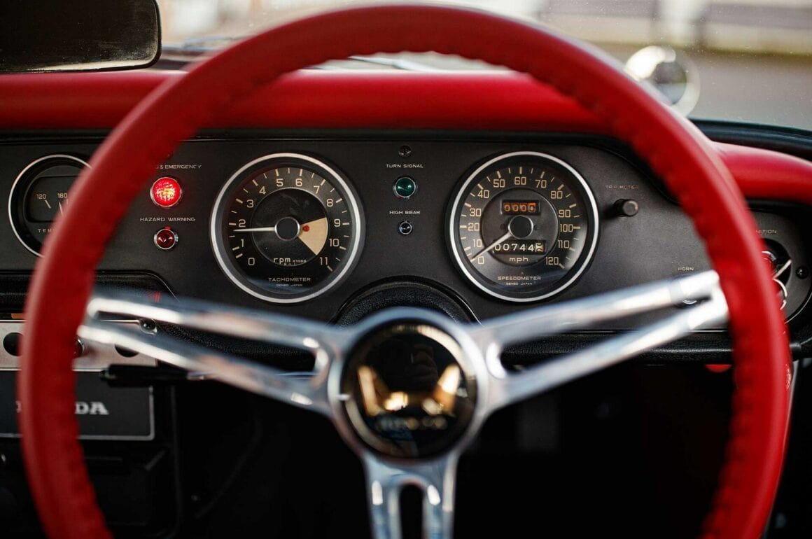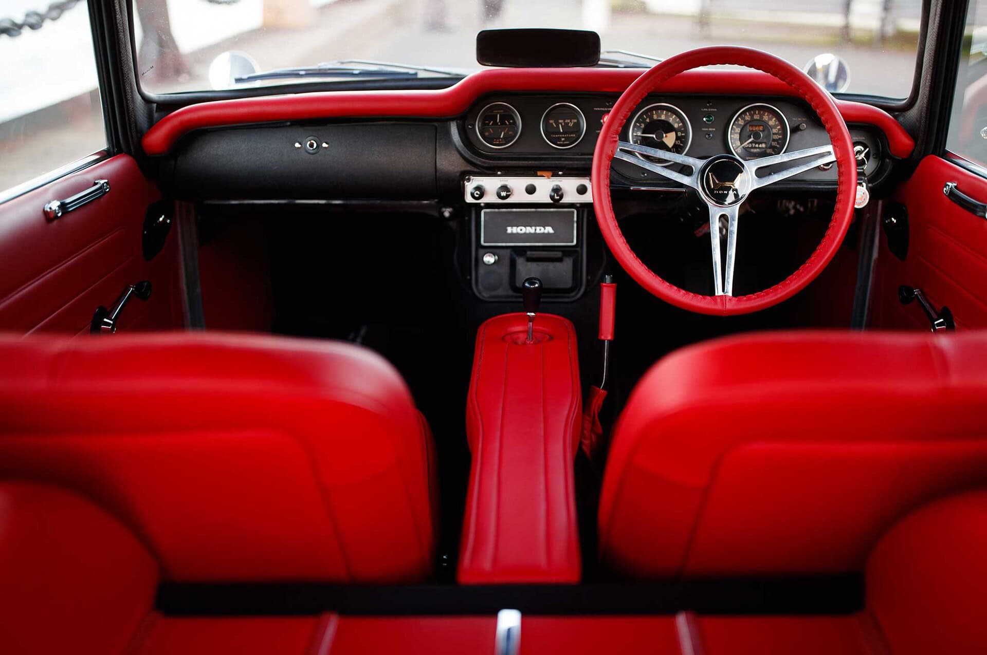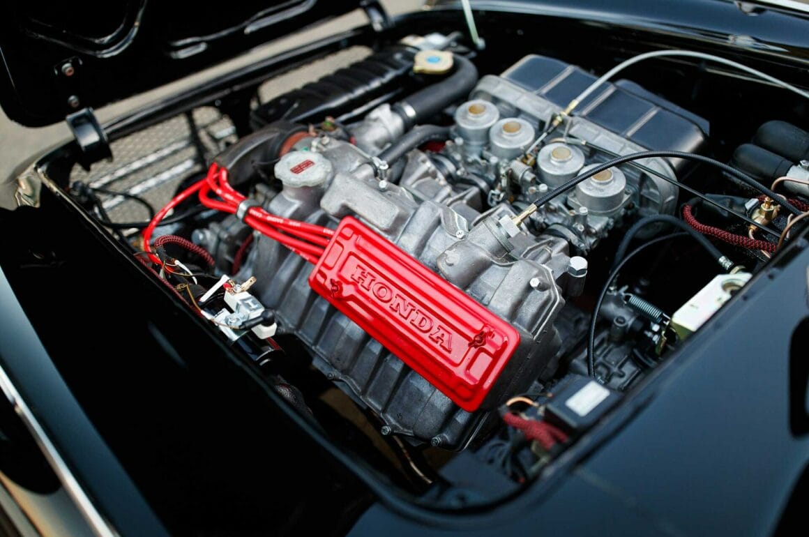 Le cuir rouge foncé offre le genre de contraste qui, même lorsqu’il est appelé à se battre pour attirer l’attention avec un extérieur aussi élégant, exige l’attention car il brille virtuellement, même à distance. La modernisation a été limitée au traitement des matériaux luxuriants, tandis que les compteurs et les aiguillages OEM ont été préservés. Les rares fois où nous avons rencontré le coupé S800 de Honda, ils étaient soit dans une situation désespérée, soit dans un état de restauration traditionnel. Nous n’avons pas encore rencontré de restomod armé d’une version aussi moderne de l’une des premières Honda.