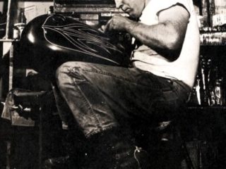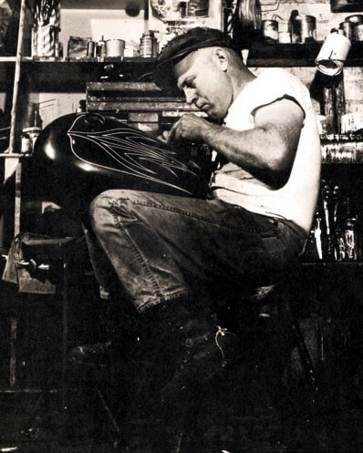 De son vivant, il fut un artiste remarquable d’inventivité, d’abord dans le Hot-Rodding dont il fut un des pères fondateurs (c’est plus ou moins ça, sans l’être tout à fait, mais c’est pas très loin de la vérité quand même, excepté une part de légende qui fait fantasmer)…, c’est par contre le père incontestable de la “Kustom Kulture“, des pin-stripping complexes et des peintures en forme de flammes… ainsi que de toute une série de thèmes graphiques dont “l’oeil ailé“…