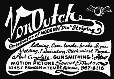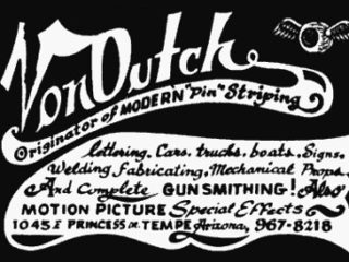 Von Dutch était l’incarnation de la créativité dans le monde du Custom et du Hot-Rodding… et il l’est toujours…, que ce soit sur les pistes de dragsters ou une 40′ Willys à essieu avant rigide passe le 400 mètres en 6 secondes… que ce soit en rue ou une 60′ Ford nostalgia Super Stock conduite par un p’tit vieux tout ridé affiche 9 secondes…ou encore, que ce soit via un jeune punk conduisant sur Hollywood Blvd, un Rat “homebuilt” T-Buckett, rouillé de partout.
