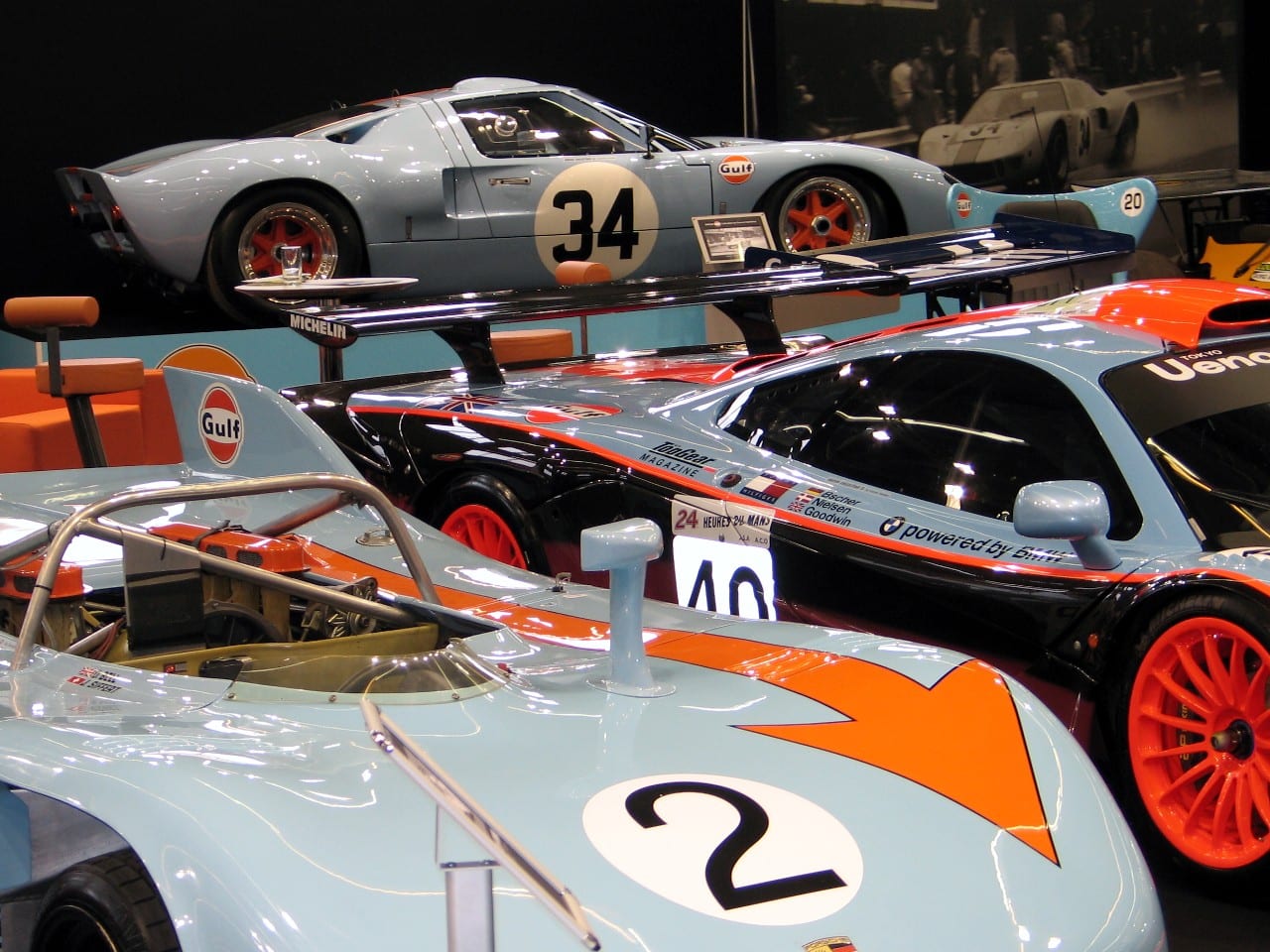 – Gulf : 1ère mondiale – 14 voitures présentées retraçant l’épopée du pétrolier en compétition automobile : Ford GT 40, Porsche 917, Mc Laren, Aston Martin…