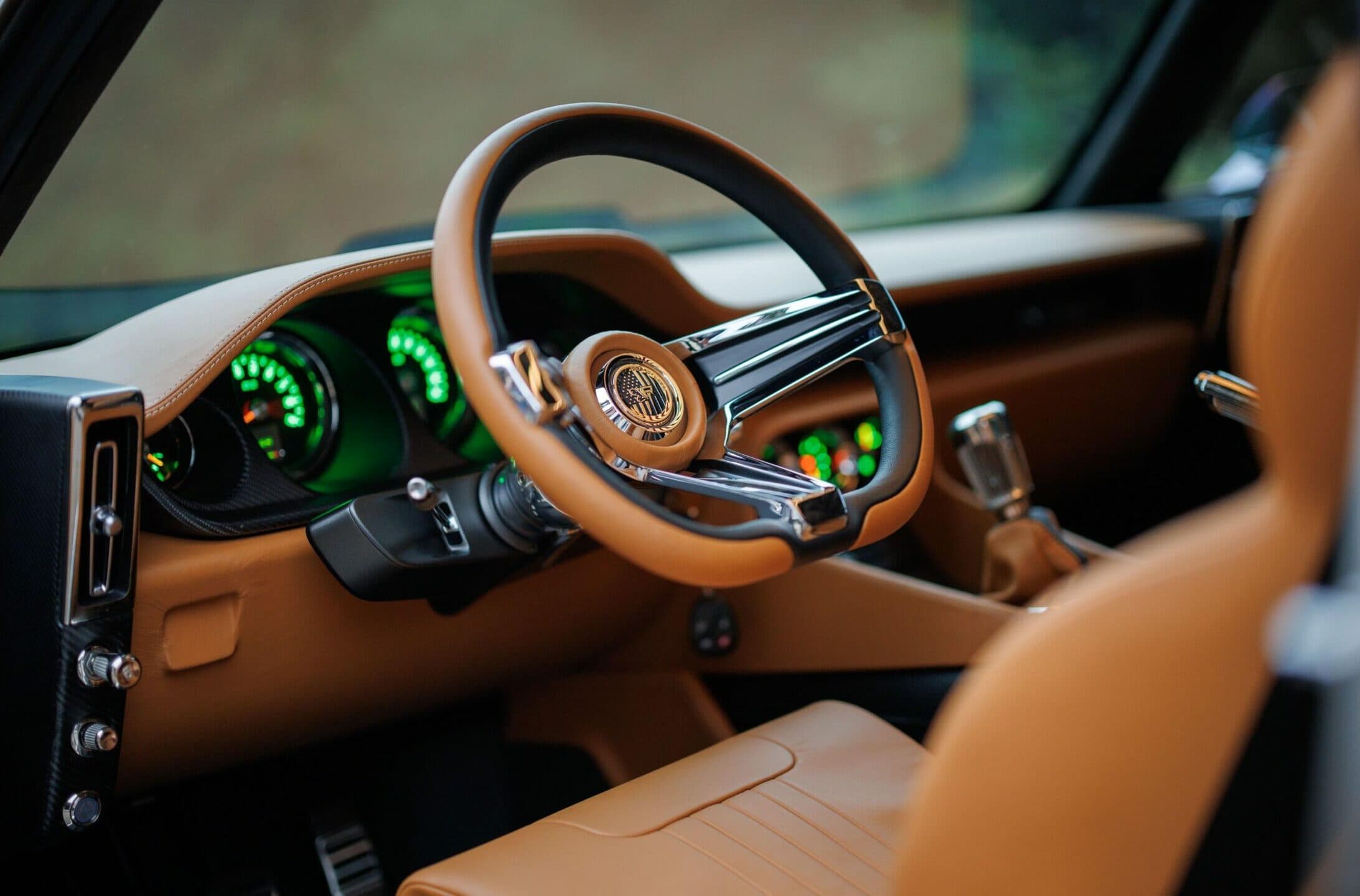 Bien sûr, la DBS était équipée de larges pneus Michelin PS Cup 2 sur des jantes HRE personnalisées de 19 et 20po avec des disques Brembo de 15po et des étriers à six pistons pour s’assurer que l’investissement du propriétaire ne serait pas perdu dans le premier virage. Conformément à son statut classique, Ringbrothers, Ragle et Upholstery Unlimited ont collaboré sur l’intérieur, qui a été mis à jour de manière experte à l’aide de panneaux en mousse usinée, d’un tableau de bord et d’une console, le tout en fibre de carbone et de cuir. Il y a aussi des accents en acier inoxydable imprimés en 3D et c’est là que la connexion Gentex est révélée : la société a fourni des visières à atténuation automatique, marquant la première fois qu’elles étaient apparues dans une “Street-Machine. Ils ont également produit les rétroviseurs extérieurs sculptés et le rétroviseur intérieur.
