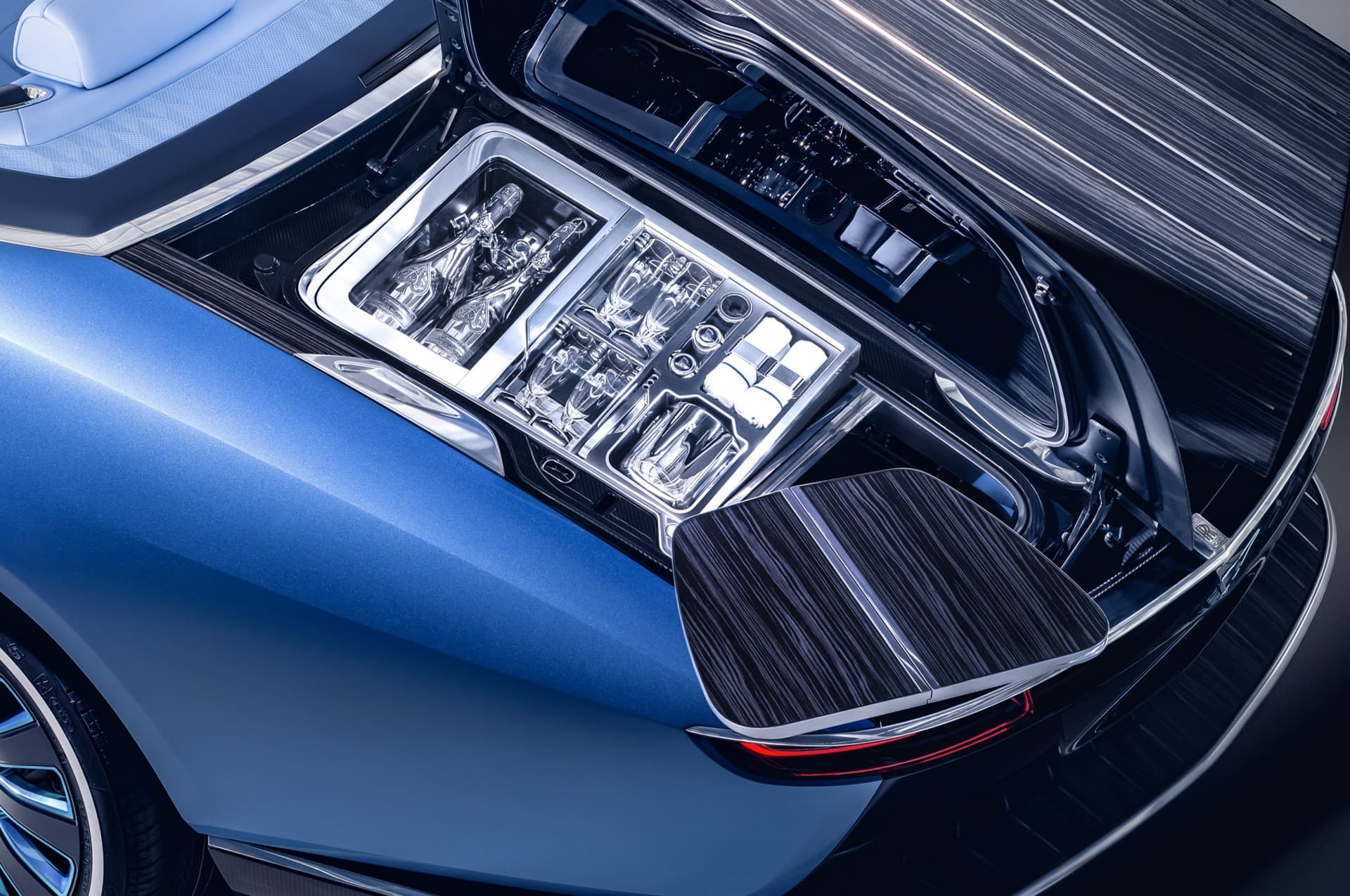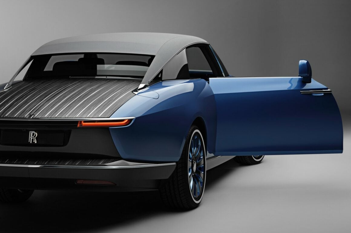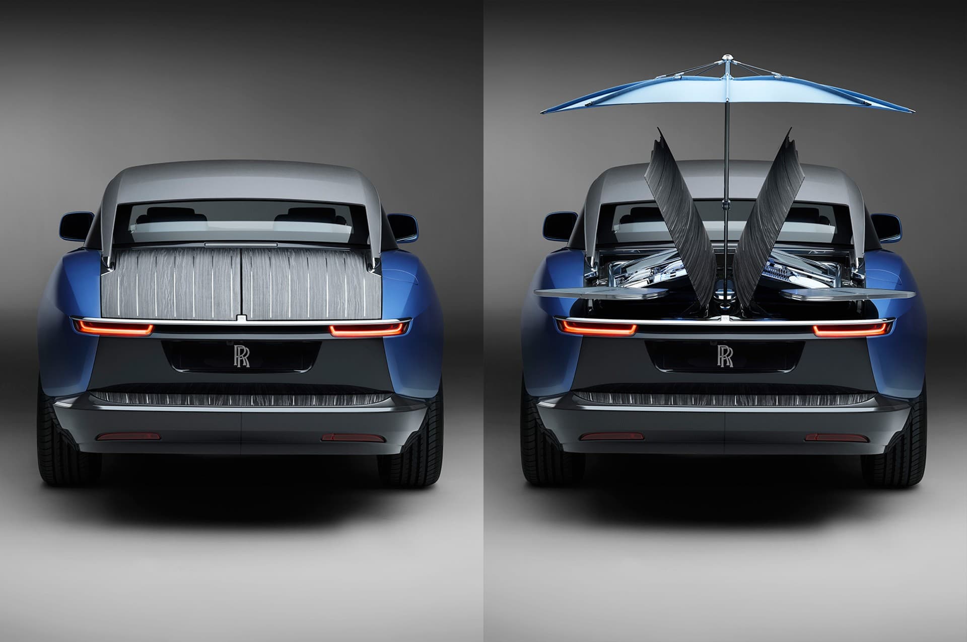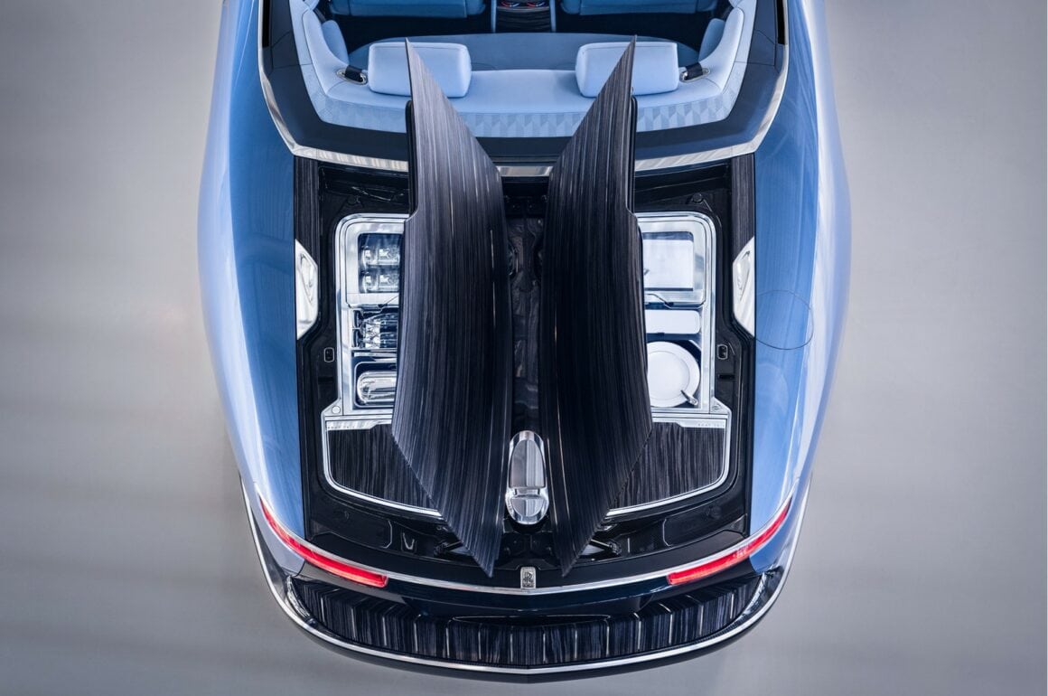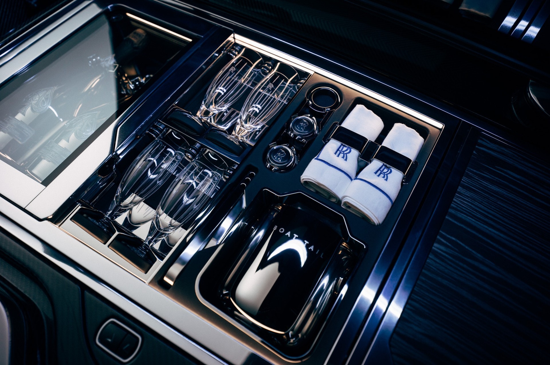 La Boat Tail est la seule Rolls-Royce contemporaine à feux arrière horizontaux. La pièce maîtresse de la Rolls-Royce Boat Tail est probablement son coffre, dont les deux ouvrants s’articulent électriquement comme des ailes de papillon pour révéler deux compartiments, l’un dédié à l’apéritif et l’autre au repas. Cet espace est donc conçu pour conserver nourriture et boissons au frais. Il dispose de son propre circuit de climatisation et de deux ventilateurs servant à dissiper la chaleur. Ses capacités de régulation thermique ont été testées par des températures allant de 80 °C à – 20 °C. La partie arrière de la voiture nécessite à elle seule cinq calculateurs. Le véhicule s’accompagne d’une batterie d’accessoires de marques toutes plus prestigieuses les unes que les autres : coutellerie Christofle, stylo Montblanc et montre Bovet 1822 exclusive notamment.