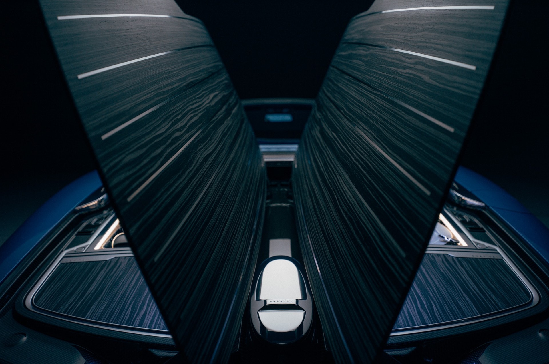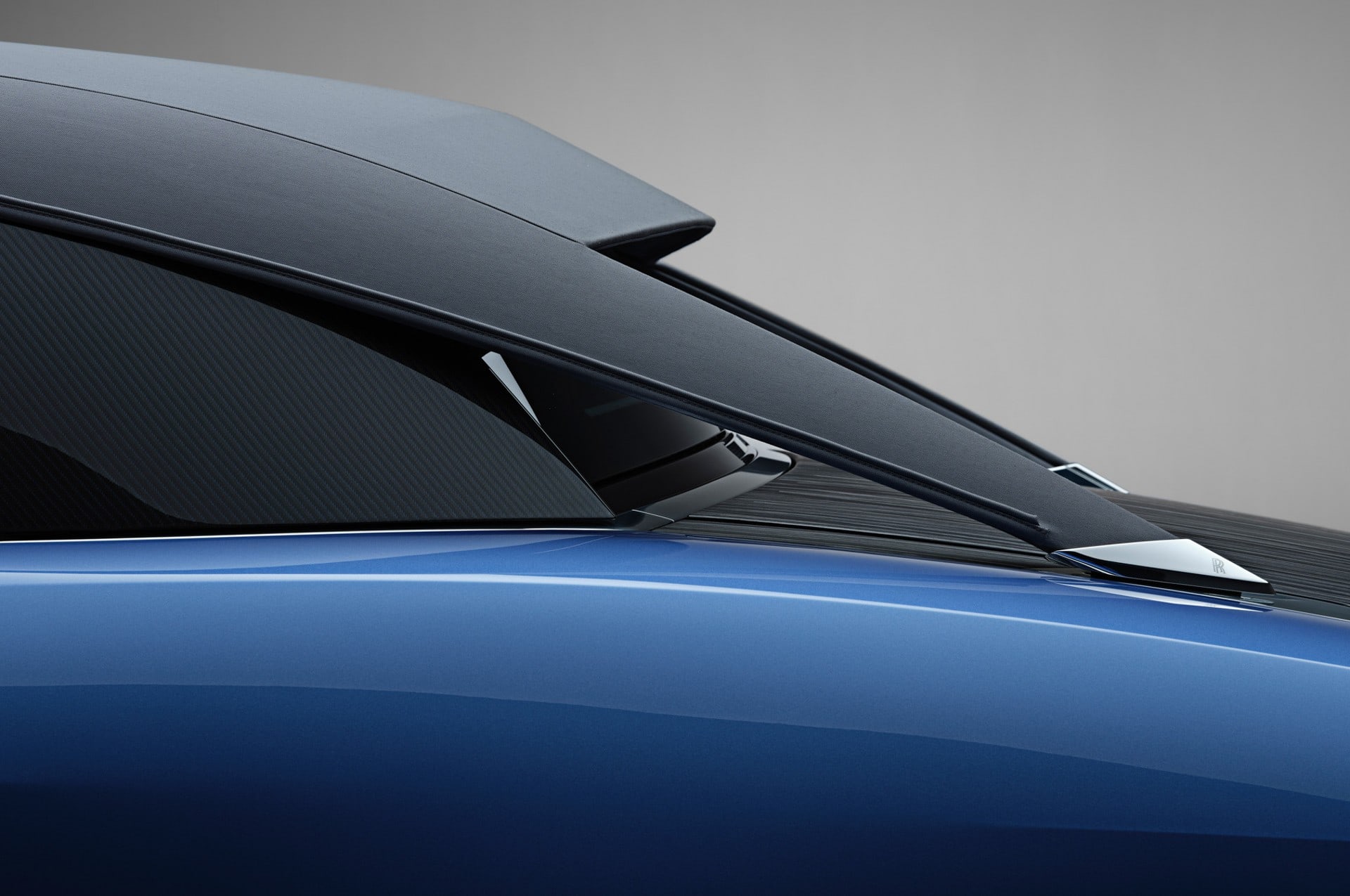 L’habitacle a également fait l’objet du plus grand soin, comme en témoigne le motif guilloché des caches centraux des compteurs. Le système audio utilise l’ensemble du plancher comme caisse de résonance pour le caisson de graves, et non un unique seuil dédié comme les autres modèles actuels de la marque. Lorsque le large panneau de toit gris est en place, ses montants arrière inclinés donnent à la Boat-Tail une allure de coupé. Il ne peut être rangé à bord, mais une bâche est fournie pour abriter l’intérieur de la voiture à l’arrêt en cas d’averse. De la formation des panneaux de carrosserie en aluminium à la peinture du capot, une grande partie de la construction de la Boat-Tail est réalisée à la main. En tout, 1.813 composants ont été développés spécifiquement pour ce modèle.