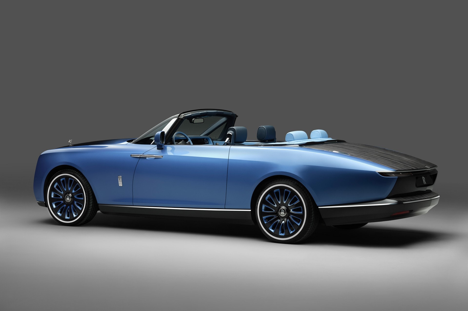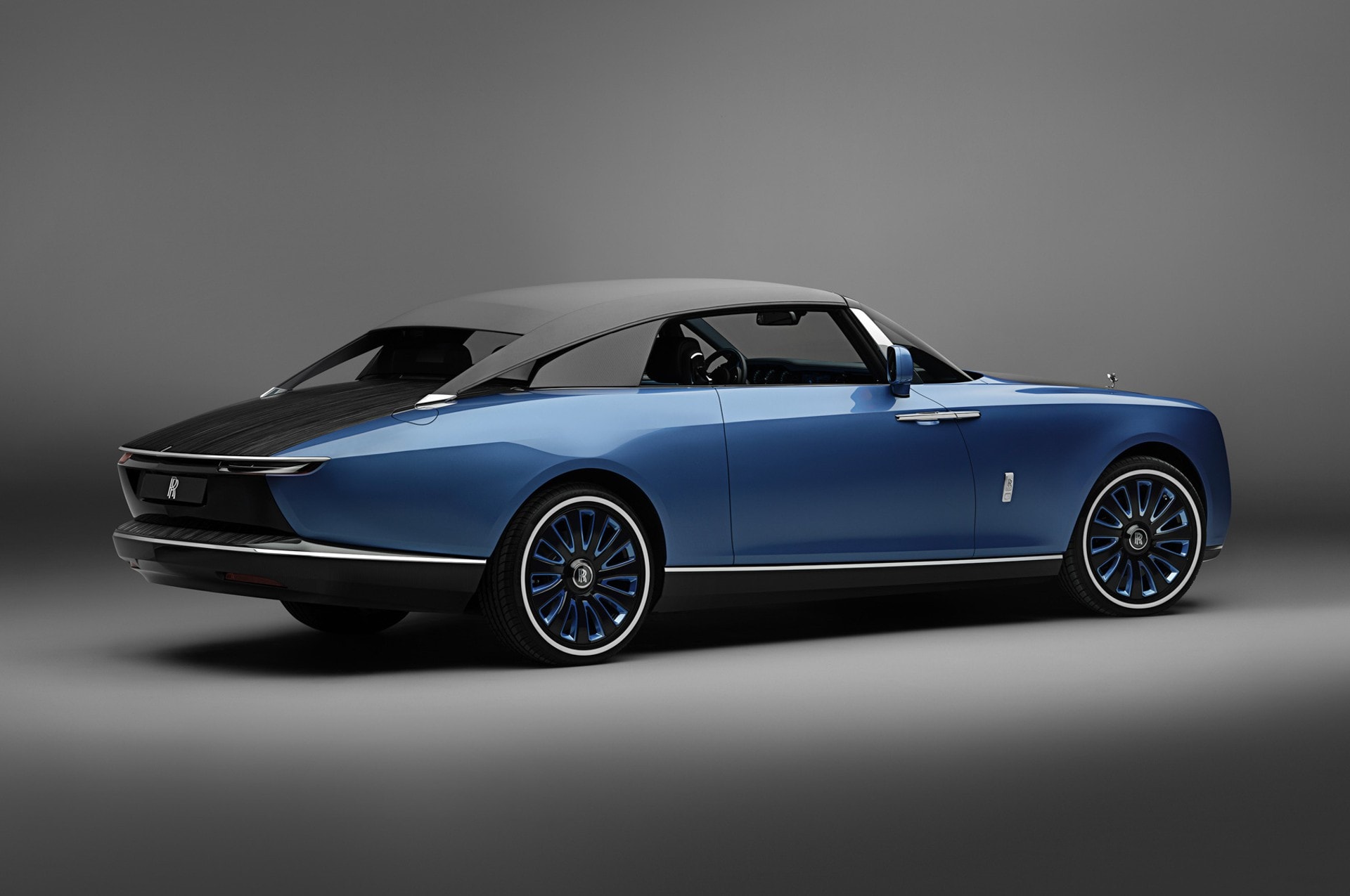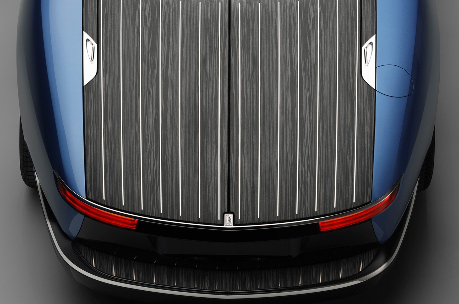 Le nom de la voiture, qui peut se traduire littéralement par “queue de bateau”, souligne son inspiration nautique et a déjà été employé par Rolls-Royce pour un modèle de 1932, dont un couple d’acquéreurs du nouveau véhicule est déjà propriétaire. De profil, l’amincissement de la carrosserie à la poupe rappelle clairement les grands voiliers de Classe “J” des années 1930. Une teinte bleu clair domine la carrosserie, contrastée par le bleu foncé du capot et du cuir de la sellerie. La partie supérieure du coffre est couverte d’un placage de bois gris foncé strié d’aluminium évoquant le pont d’un yacht. À l’intérieur des blocs optiques avant fins et horizontaux, des LED assurent une signature lumineuse rappelant aussi le profil d’un bateau. La calandre totalement intégrée à la face avant et les feux arrière horizontaux sont inédits chez Rolls-Royce. Les pneus à flancs blancs et les jantes bleues apportent une touche rétro à l’ensemble.