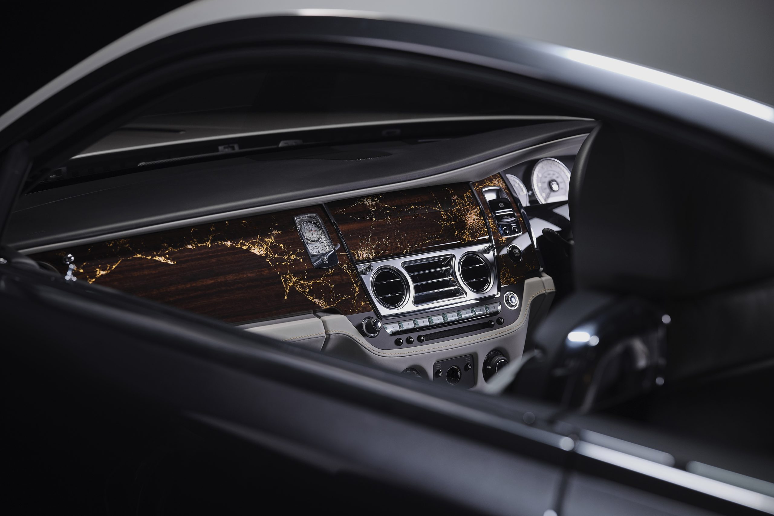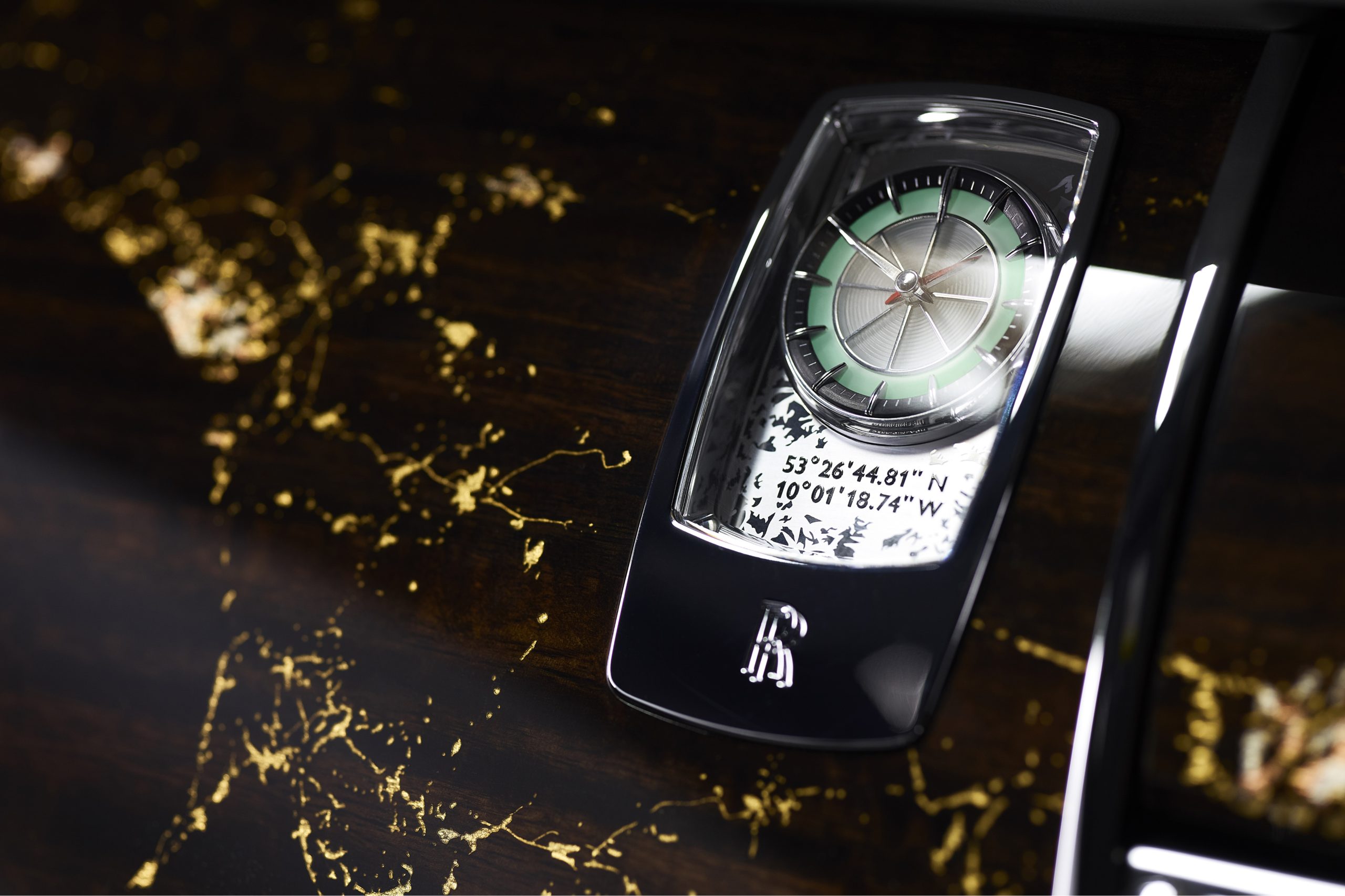 En hommage à cette anecdote, le Rolls-Royce Bespoke Collective a conçu une horloge magistrale avec un effet de fond glacé tendant au vert pâle en cas de conduite nocturne. L’aiguille des heures rouge se trouve au sommet de lignes inspirées par un compas sur le panneau de l’horloge, tandis que les coordonnées du lieu d’atterrissage sont gravées en dessous.