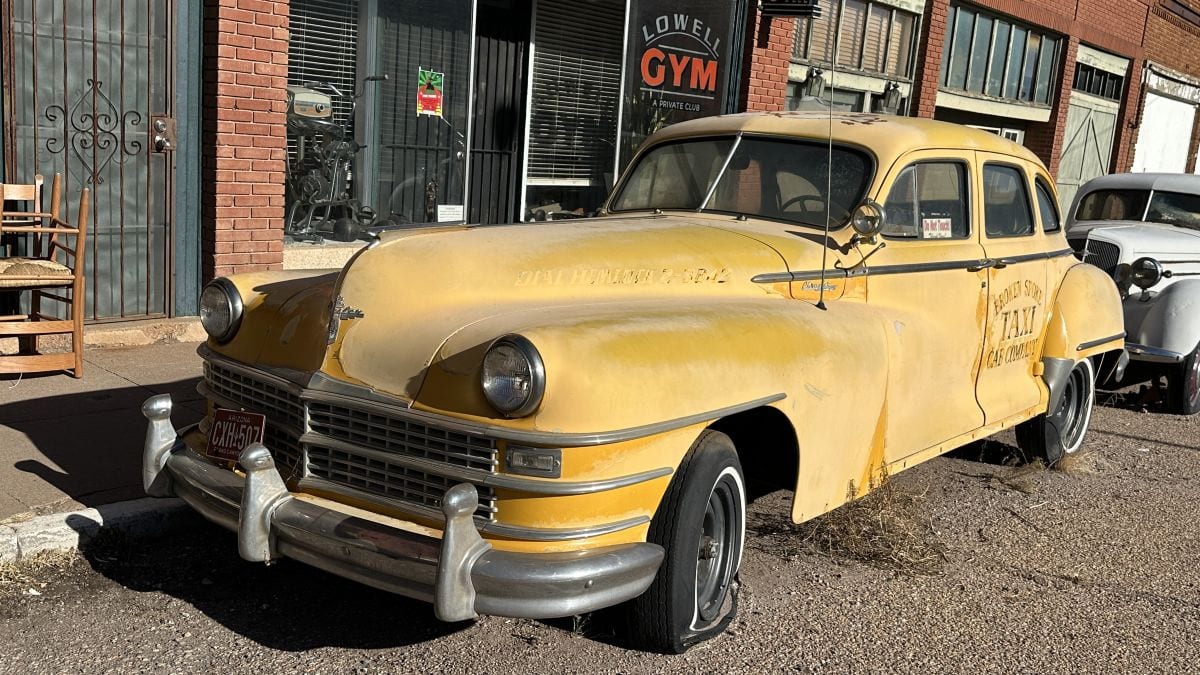 Chrysler New Yorker 1948, c’était à son époque une offre luxueuse de Chrysler, avec un intérieur inspiré de l’Art déco. La puissance provenait d’un moteur huit cylindres en ligne de 323,5 ci, associé à une transmission semi-automatique Fluid Drive. Cette Chrysler en bord de rue était décorée en livrée de taxi pour la Broken Spoke Cab Company. Il avait de belles améliorations comme un projecteur monté sur le montant A.