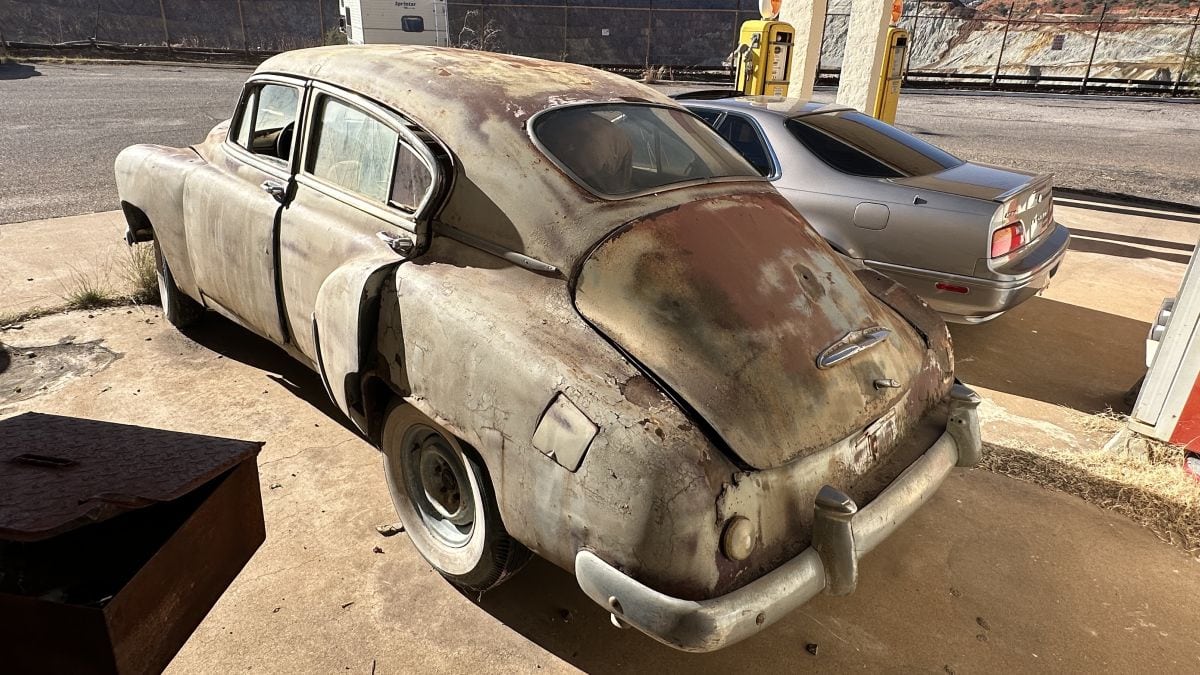 Chevrolet Styleline Deluxe 1951, garée à l’extrémité nord de Erie Street, près d’une station-service abandonnée. La porte arrière droite était entrouverte surement depuis 10 ans. Alors j’ai jeté un coup d’œil à l’intérieur et j’ai senti une odeur de “vieille voiture pourrie”. L’offre standard de la Styleline était un six moteurs en ligne “Thrift-Master” de 216ci couplé à une boîte manuelle à trois vitesses.