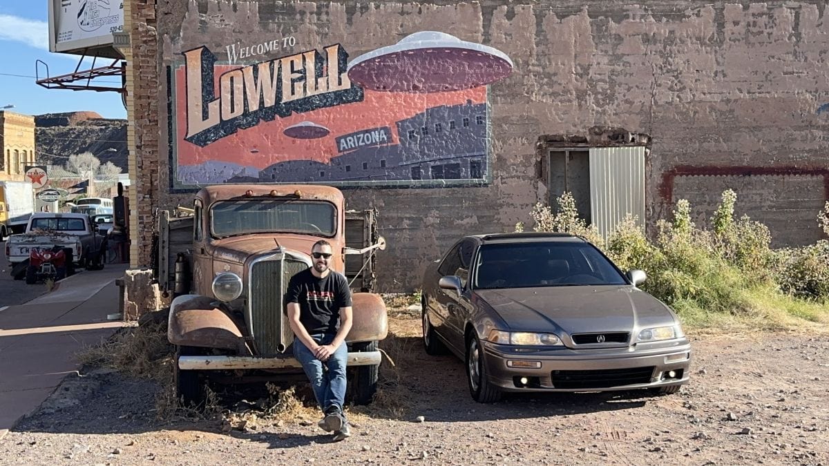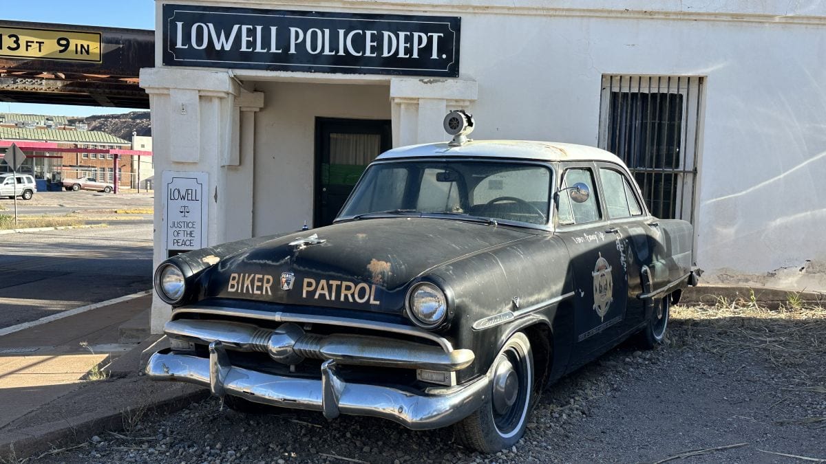 J’ai ensuite fait une promenade à travers Lowell, en Arizona, un petit bled pourri et désertique en périphérie de Bisbee. Ce village mortifère n’est qu’à environ huit miles au nord de la frontière mexicaine et le fait que ce soit si isolé ajoute à son ambiance sépulcrale digne d’un western de fin des temps avec des CowBoy’s Hollywoodiens presque centenaires… Une photo de mon guide local, pour la postérité sur le pare choc d’un camion d’origine inconnue…
