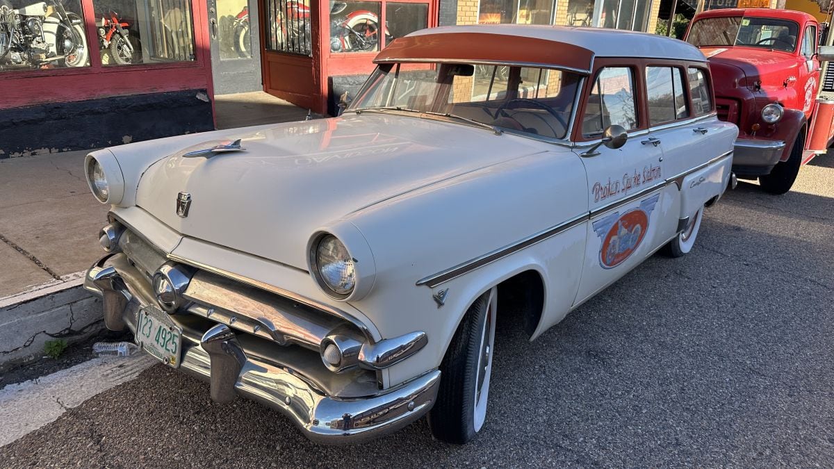 Ford Crestline Country Squire 1954, un break quatre portes, c’ était un haut de gamme à son époque. Sur le thème de Broken Spoke, ce machin bicolore arborait des badges V8 sur les ailes avant signifiant qu’il était propulsé par un V8 Y-block 239ci en option, d’une puissance de 130 chevaux.