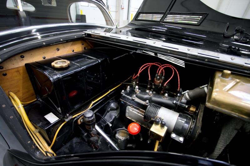 Son petit moteur quatre cylindres de 1385cc à soupapes latérales, développe 38 chevaux, la transmission aux roues arrière s’effectuant via une boîte trois vitesses utilisant déjà à l’époque, le fameux système Transaxle qu’on connaîtra plus tard chez Alfa et Porsche.