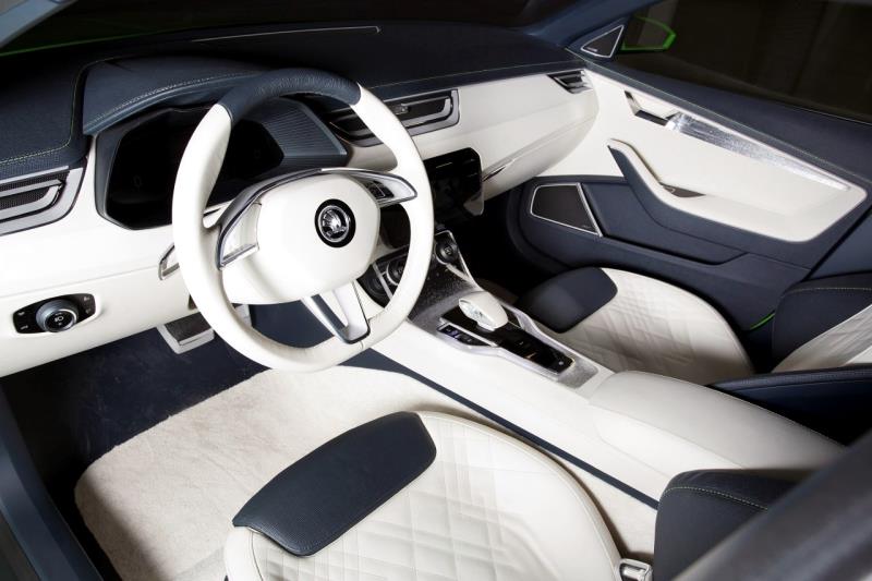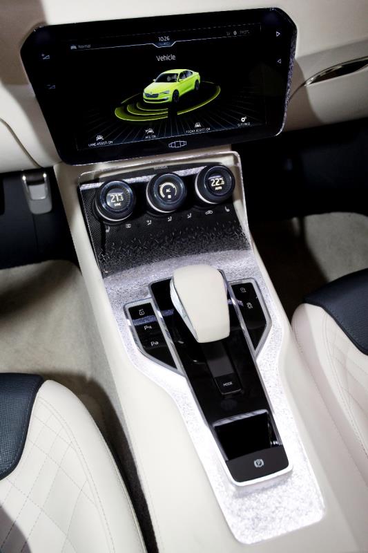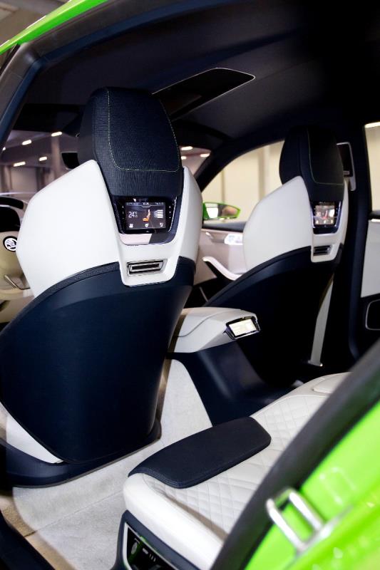 Comme il s’agit d’une Skoda, petit clin d’œil à la Bohème toute proche avec des commandes tactiles intégrées dans du véritable cristal de Bohème qui sur la voiture de production devrait être remplacé par du faux plastique ayant cependant le même aspect… et que dire également des insignes avant et arrière, illuminés en permanence… et du coffre ayant aussi une contenance giga ?