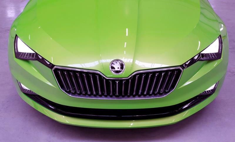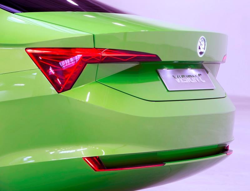 Comparée à une Superb, la Vision-C, plus large, plus basse, donne aussi l’impression d’être beaucoup plus longue, alors qu’en réalité, elle ne dépasse pas 4,66 m, empruntant au passage la nouvelle plate-forme MBQ du Groupe VW qui supporte la structure de l’Audi A3, de la VW Golf VII mais également de la dernière Octavia…, en revanche, ses lignes élancées, étirées au possible, sa forme de coupé 5 portes et son immense calandre entourée par des phares triangulaires (tout comme les feux arrière), tout ce design donc…, contribue à rendre cette berline coupé encore plus dynamique alors que l’immense hayon arrière se voit surmonté dans sa base par un imposant spoiler qui sans aucun doute contribue à obtenir un Cx record de 0,26…, ajoutez à ce tableau, de belles jantes spécifiques de 19 pouces chaussant des enveloppes de 225/40, et nul doute que cette voiture joue dans un tout autre registre, celui de l’élégance et du raffinement.
