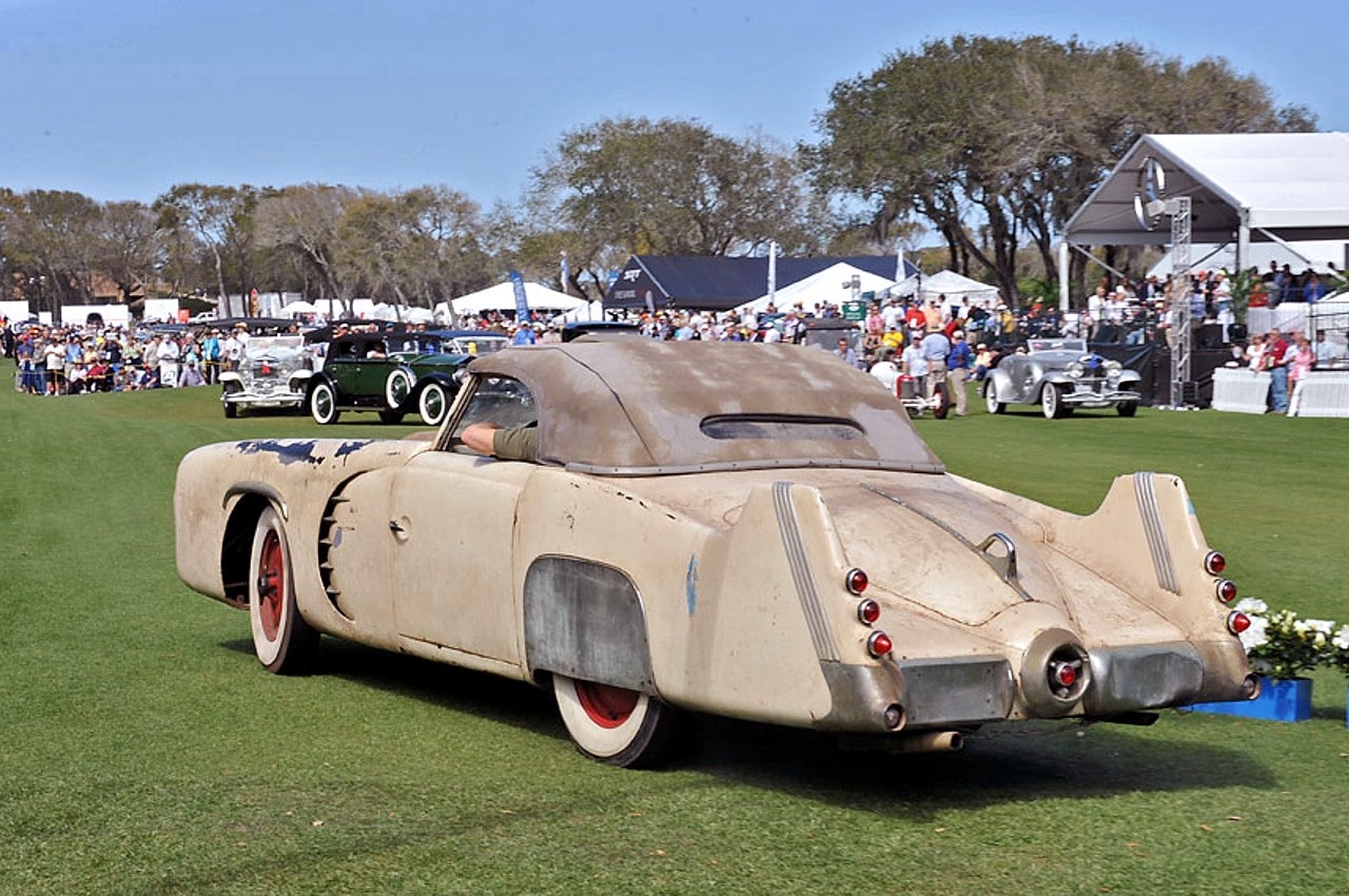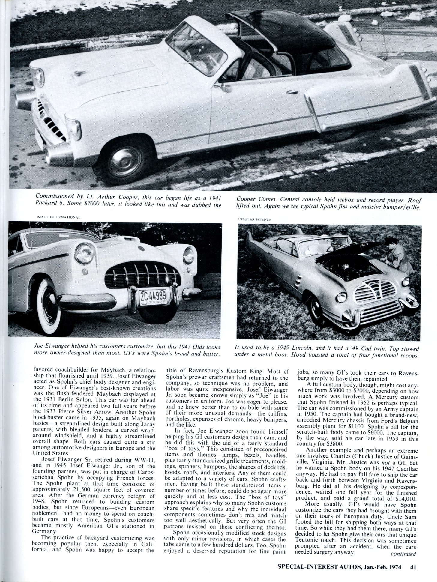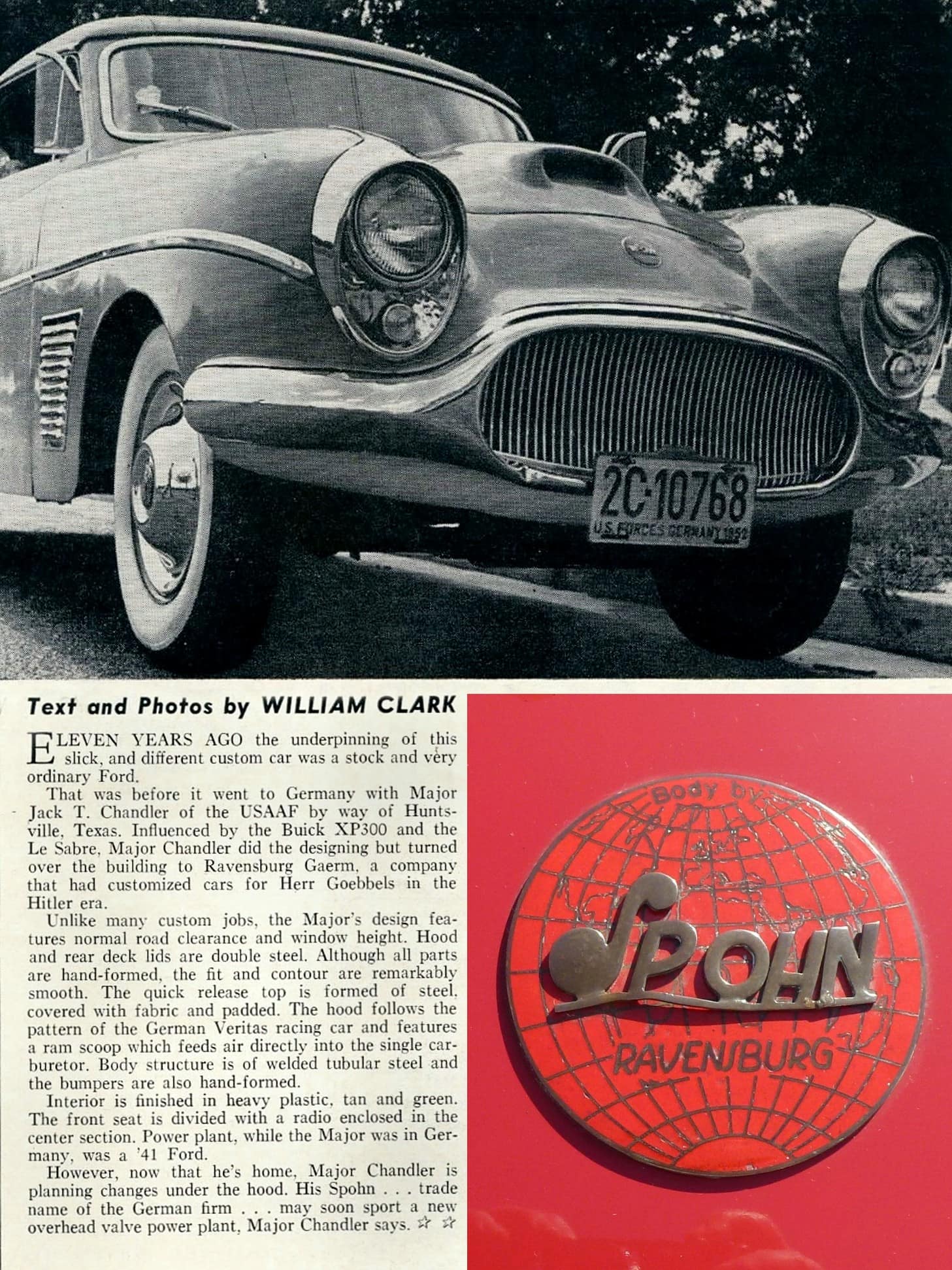Intarissable, il m’a expliqué qu’après la guerre, Spohn avait acheté énormément d’anciennes voitures de l’armée pour en utiliser les châssis, qu’il carrossait en voitures exceptionnelles : “Chaque voiture construite par Spohn l’a été selon les spécifications des acheteurs. Moins de 200 Spohn’s ont été fabriquées et aucune d’elles ne se ressemblent”… m’a-t-il expliqué ! (c’est également une bonne chose qu’il n’y a pas une autre laideur comme celle-ci)…“Cette Spohn très particulière est considérée comme une Spohn 1957, année ou elle fut construite, mais elle était basée sur un châssis de Ford 1939 avec un moteur V8 d’une Cadillac 331ci 1953″…