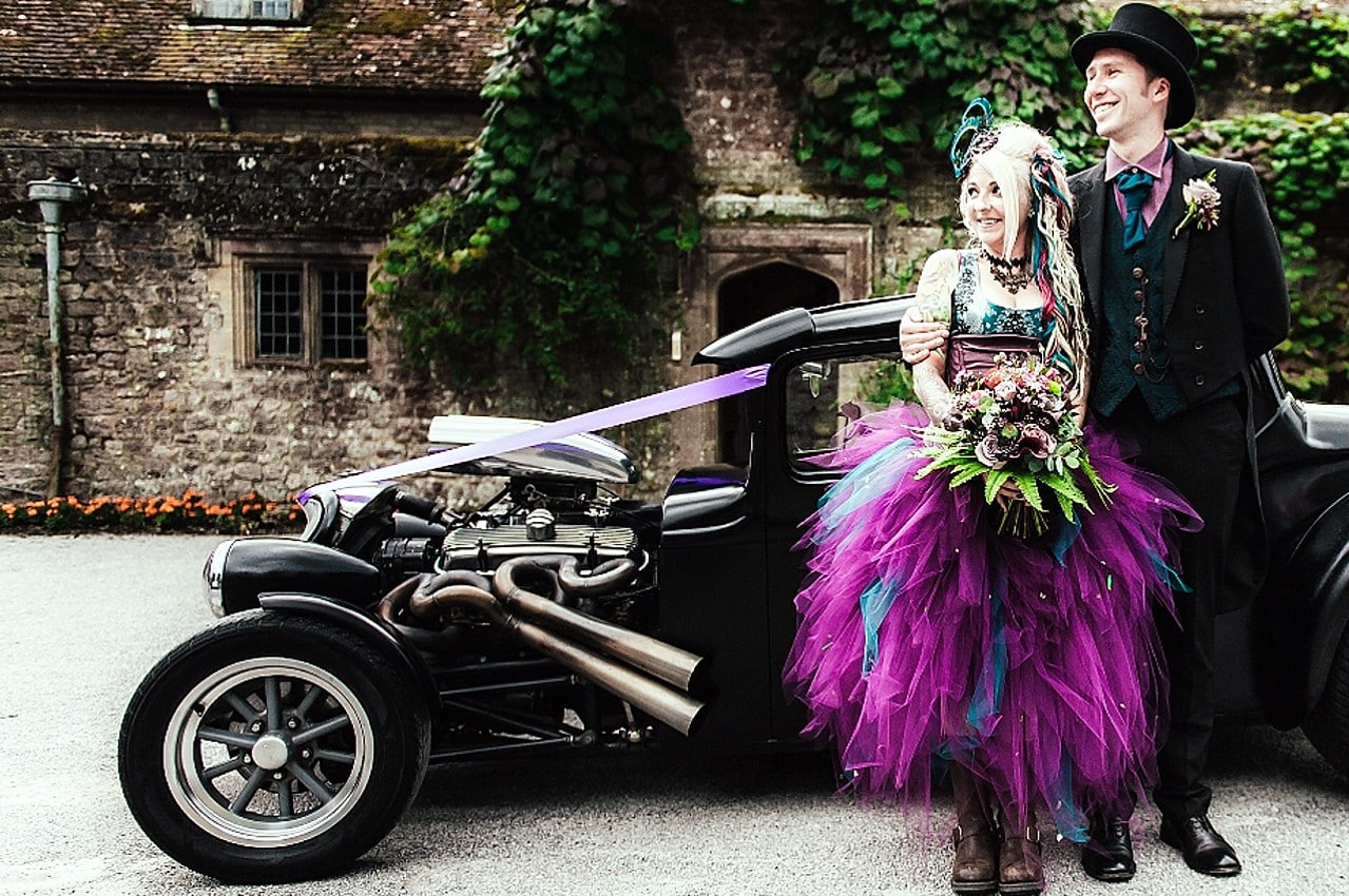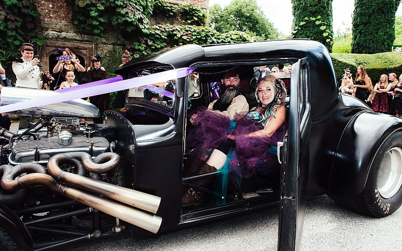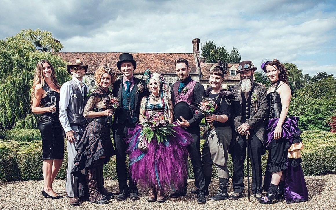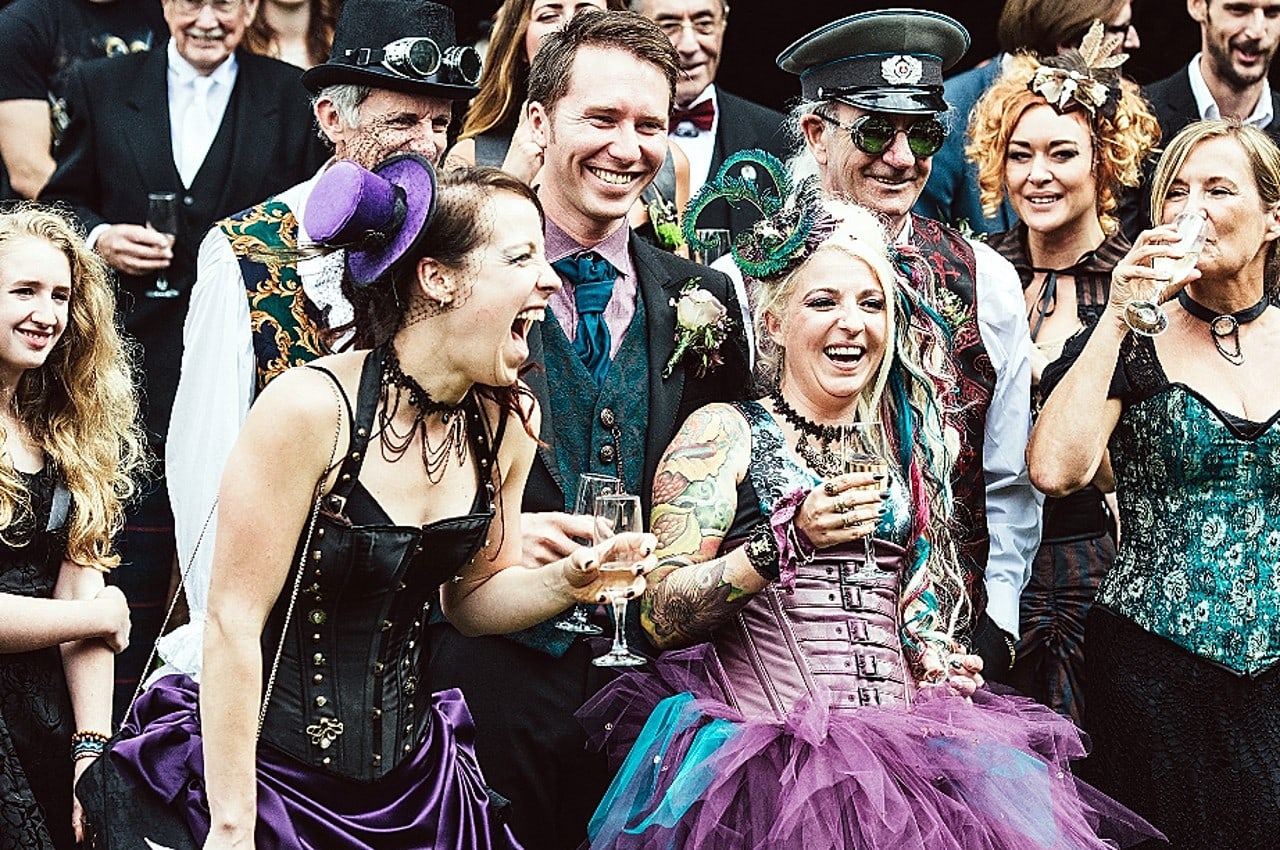 Jojo et Andy ont eu un mariage Steampunk néo-victorien à Nettlestead Place dans le Kent…, il n’aurait pas pu être plus différent de la normale…, Jodi était magnifique dans sa robe violette faite par les sœurs de la lune et achetée par Etsy.