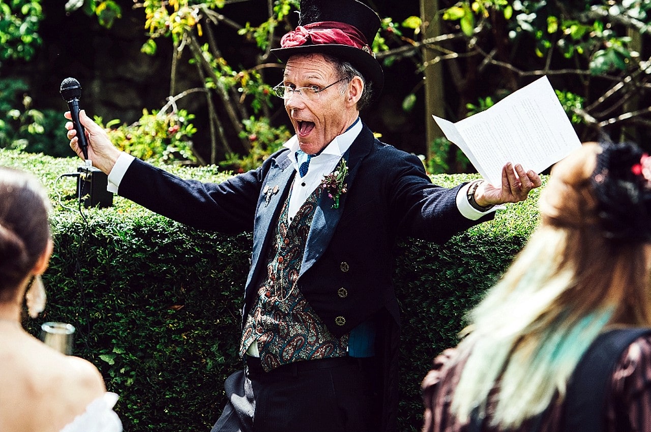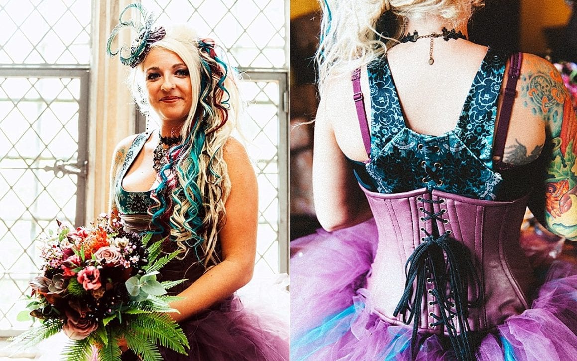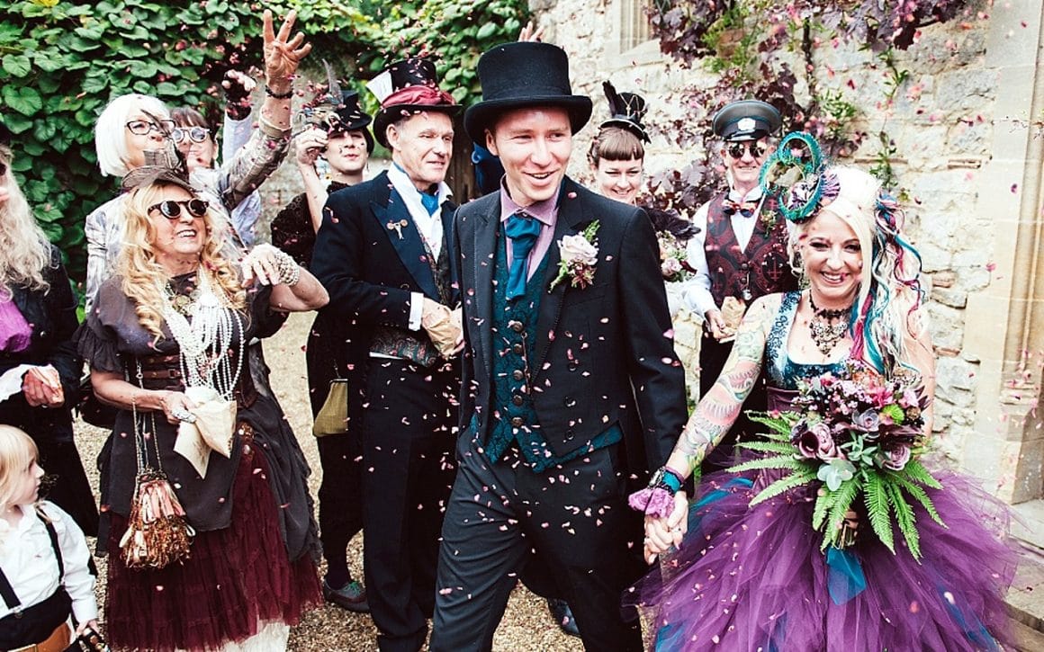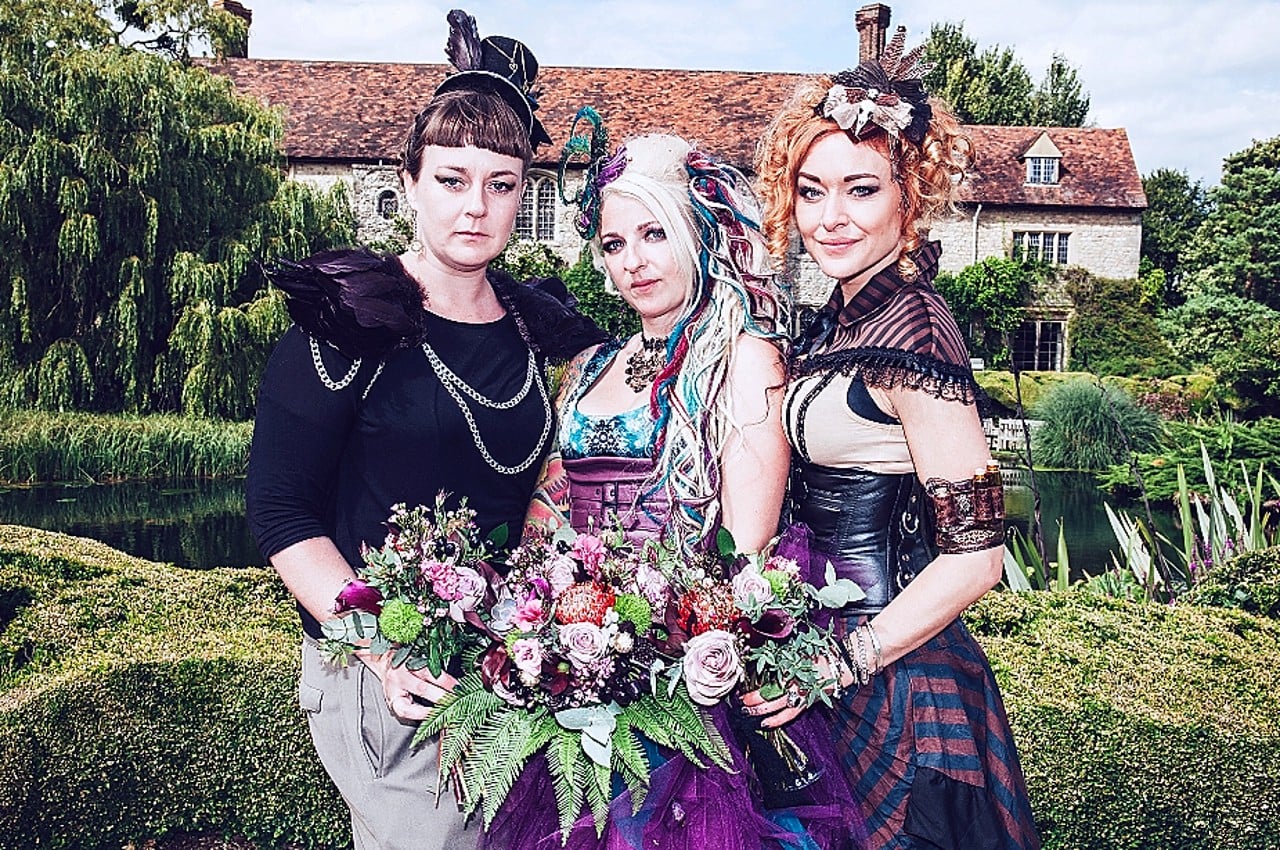 Jojo et Andy ont eu un mariage Steampunk néo-victorien à Nettlestead Place dans le Kent…, il n’aurait pas pu être plus différent de la normale…, Jodi était magnifique dans sa robe violette faite par les sœurs de la lune et achetée par Etsy.