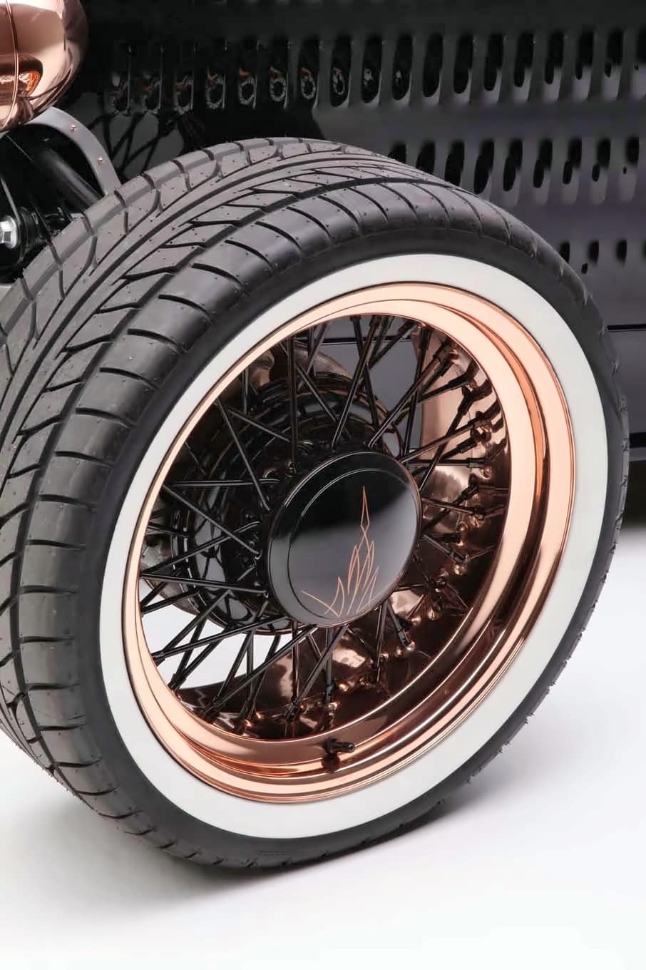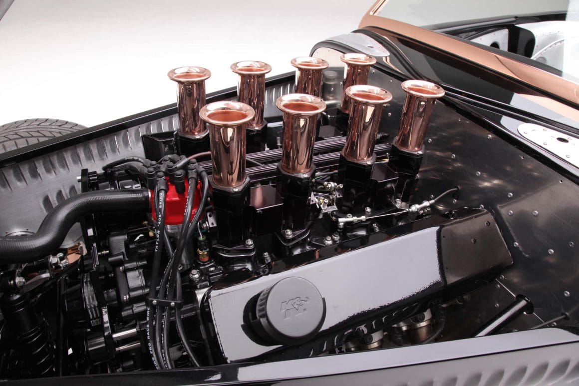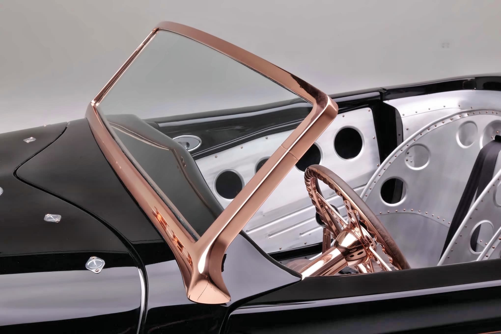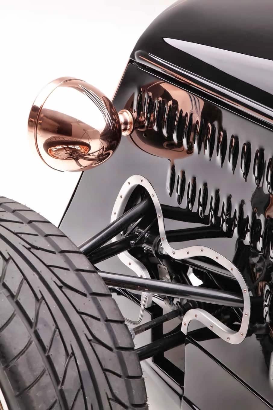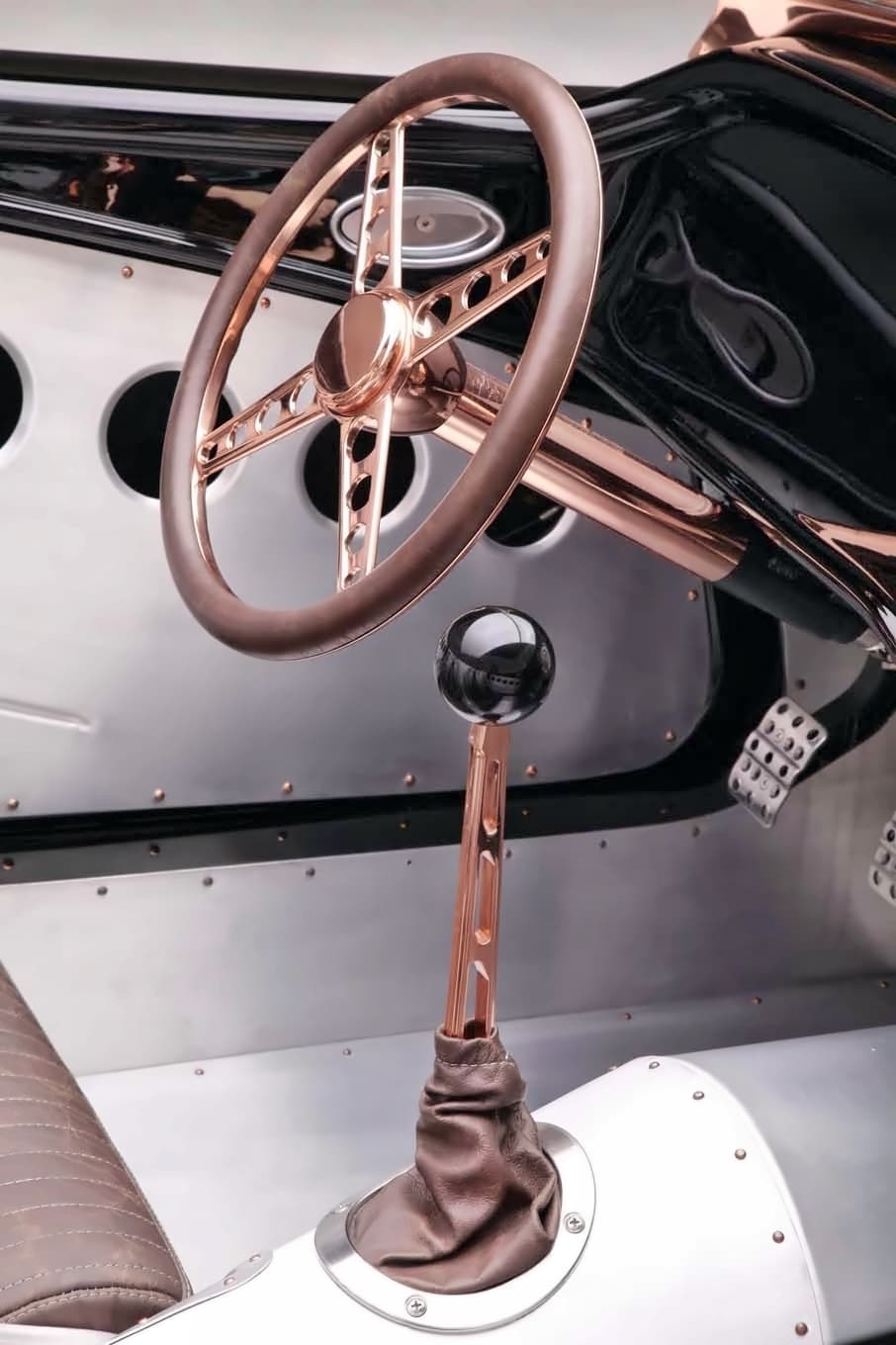 Parmi les éléments qui différencient ce Hot-Rod des autres le principal est l’utilisation de placage de cuivre au lieu de chrome., c’est la firme Ogden Chrome a fait tout ce travail…, et pour l’intérieur, des sièges de type bombardier glissent dans un intérieur tout en aluminium faisant la part belle à l’utilisation libérale de rivets partout (en cuivre et en aluminium)… la touche finale étant la jauge unique créée par Classic Instruments comprenant un compteur de vitesse (noté de 0 à 11 pour représenter 0 à 110 mph), un tachomètre à 8.000 tours, plus pression d’huile, température d’eau, tension électrique, et niveau de carburant, le tout présenté dans une horloge style “grand-père”...