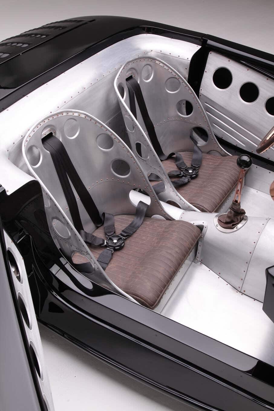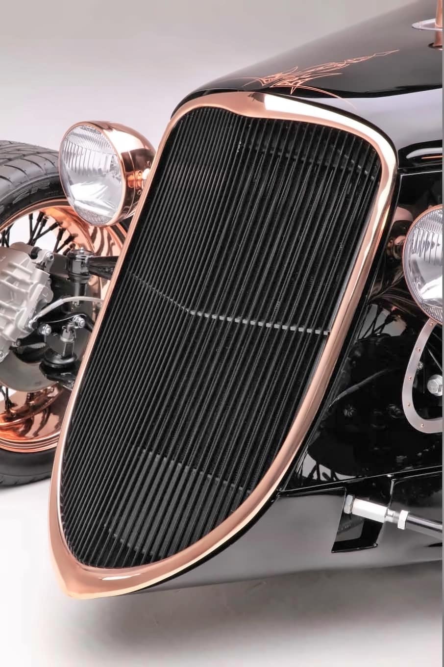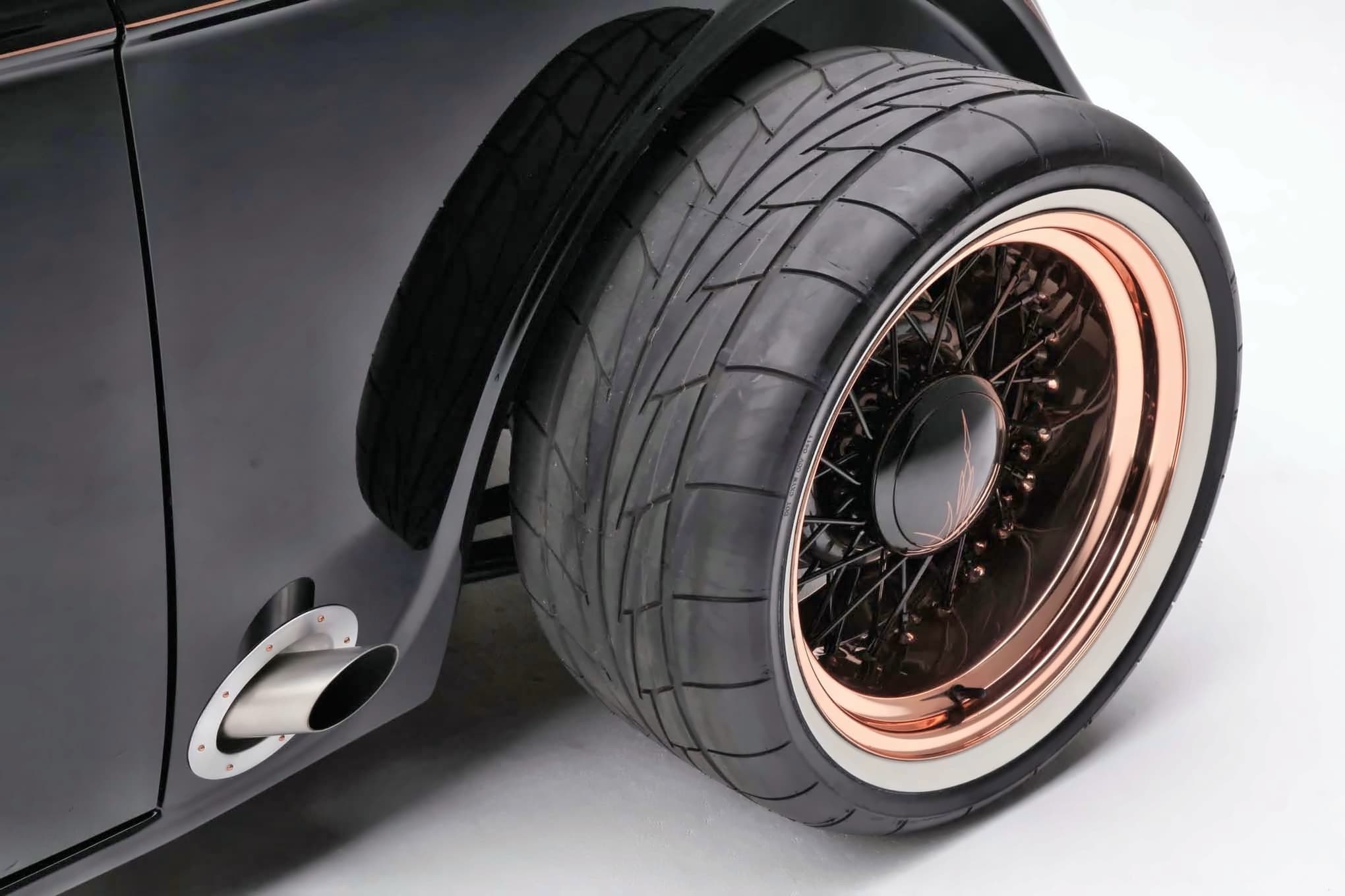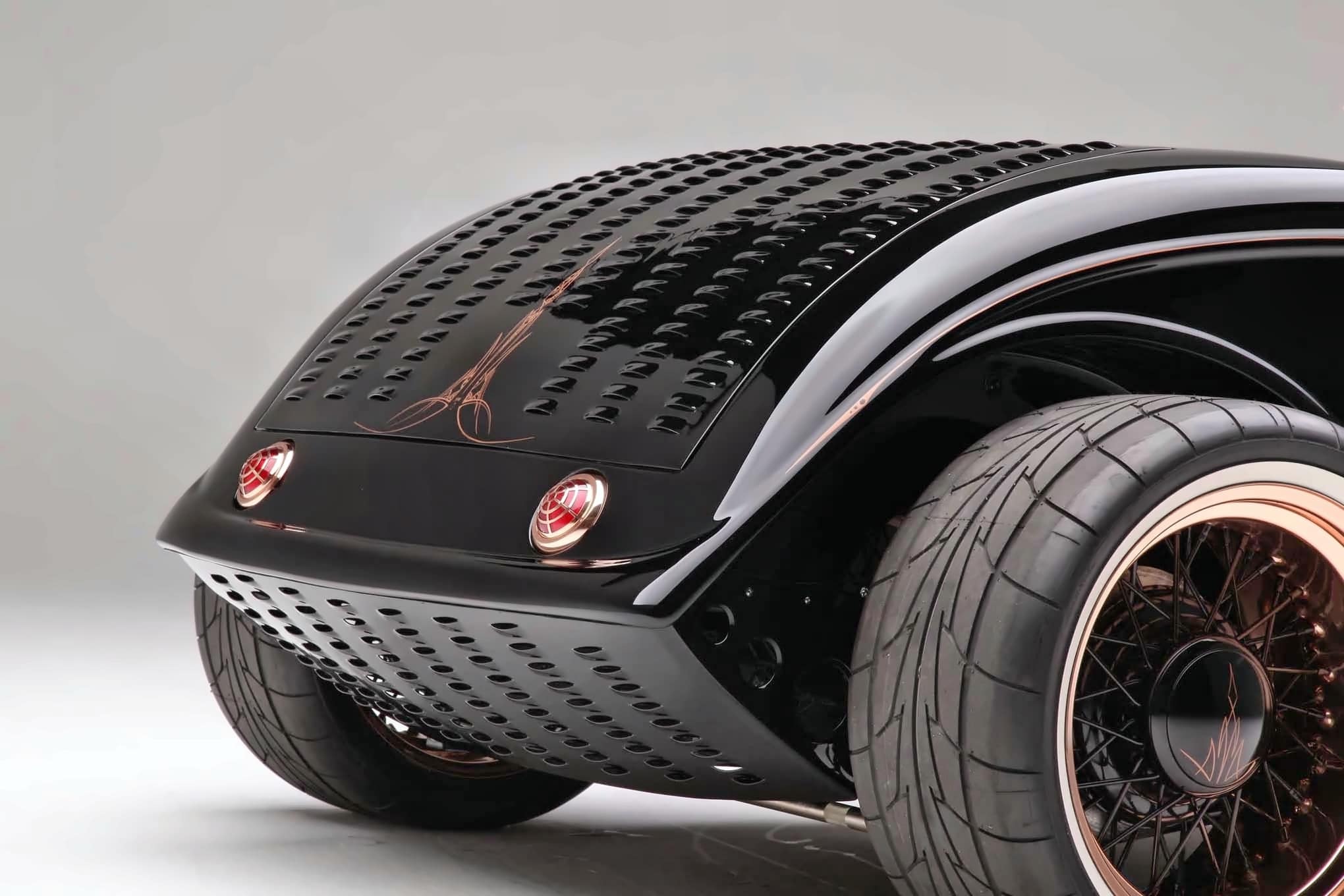 Parmi les éléments qui différencient ce Hot-Rod des autres le principal est l’utilisation de placage de cuivre au lieu de chrome., c’est la firme Ogden Chrome a fait tout ce travail…, et pour l’intérieur, des sièges de type bombardier glissent dans un intérieur tout en aluminium faisant la part belle à l’utilisation libérale de rivets partout (en cuivre et en aluminium)… la touche finale étant la jauge unique créée par Classic Instruments comprenant un compteur de vitesse (noté de 0 à 11 pour représenter 0 à 110 mph), un tachomètre à 8.000 tours, plus pression d’huile, température d’eau, tension électrique, et niveau de carburant, le tout présenté dans une horloge style “grand-père”...