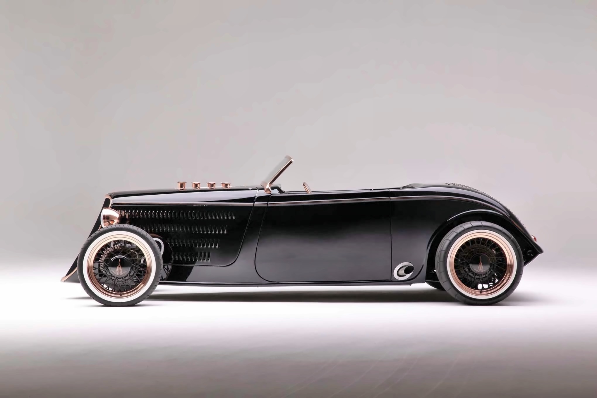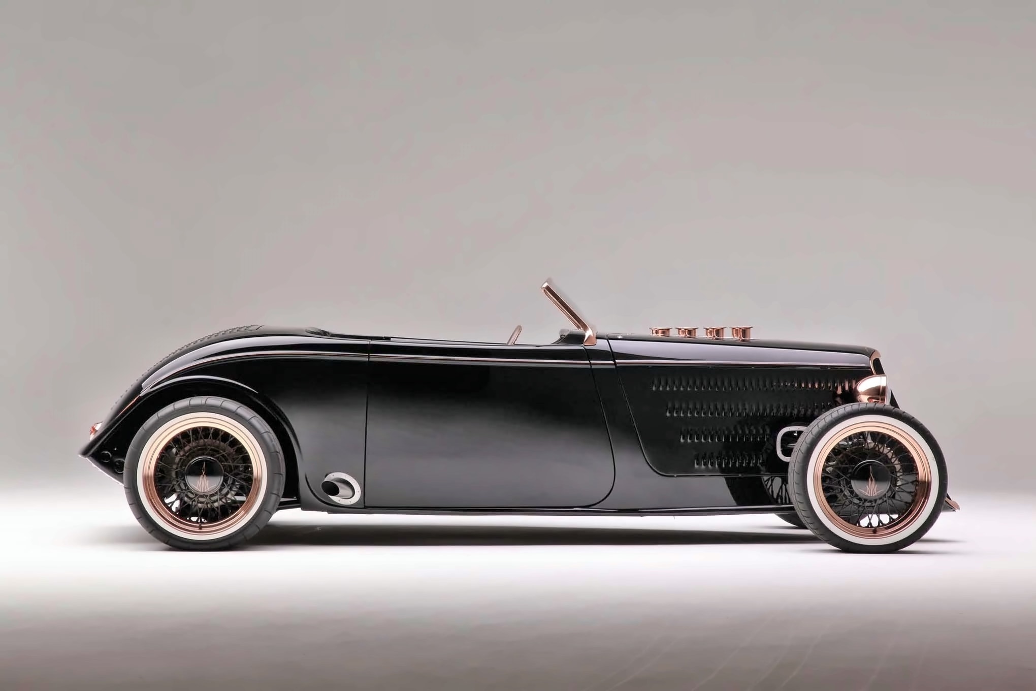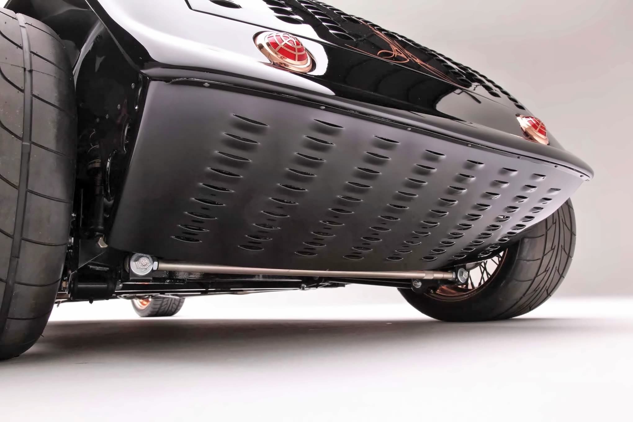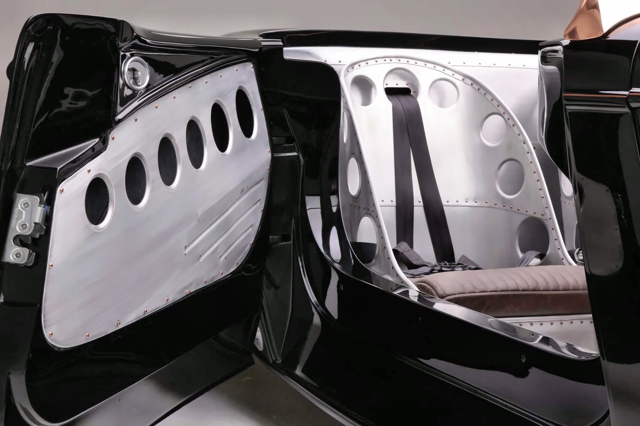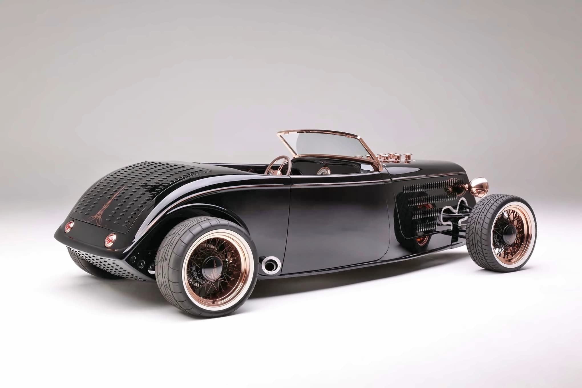 Parmi les éléments qui différencient ce Hot-Rod des autres le principal est l’utilisation de placage de cuivre au lieu de chrome., c’est la firme Ogden Chrome a fait tout ce travail…, et pour l’intérieur, des sièges de type bombardier glissent dans un intérieur tout en aluminium faisant la part belle à l’utilisation libérale de rivets partout (en cuivre et en aluminium)… la touche finale étant la jauge unique créée par Classic Instruments comprenant un compteur de vitesse (noté de 0 à 11 pour représenter 0 à 110 mph), un tachomètre à 8.000 tours, plus pression d’huile, température d’eau, tension électrique, et niveau de carburant, le tout présenté dans une horloge style “grand-père”...