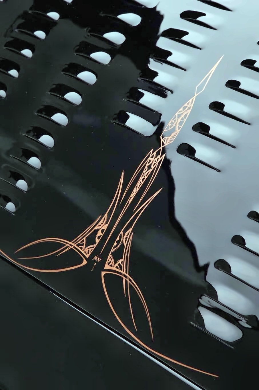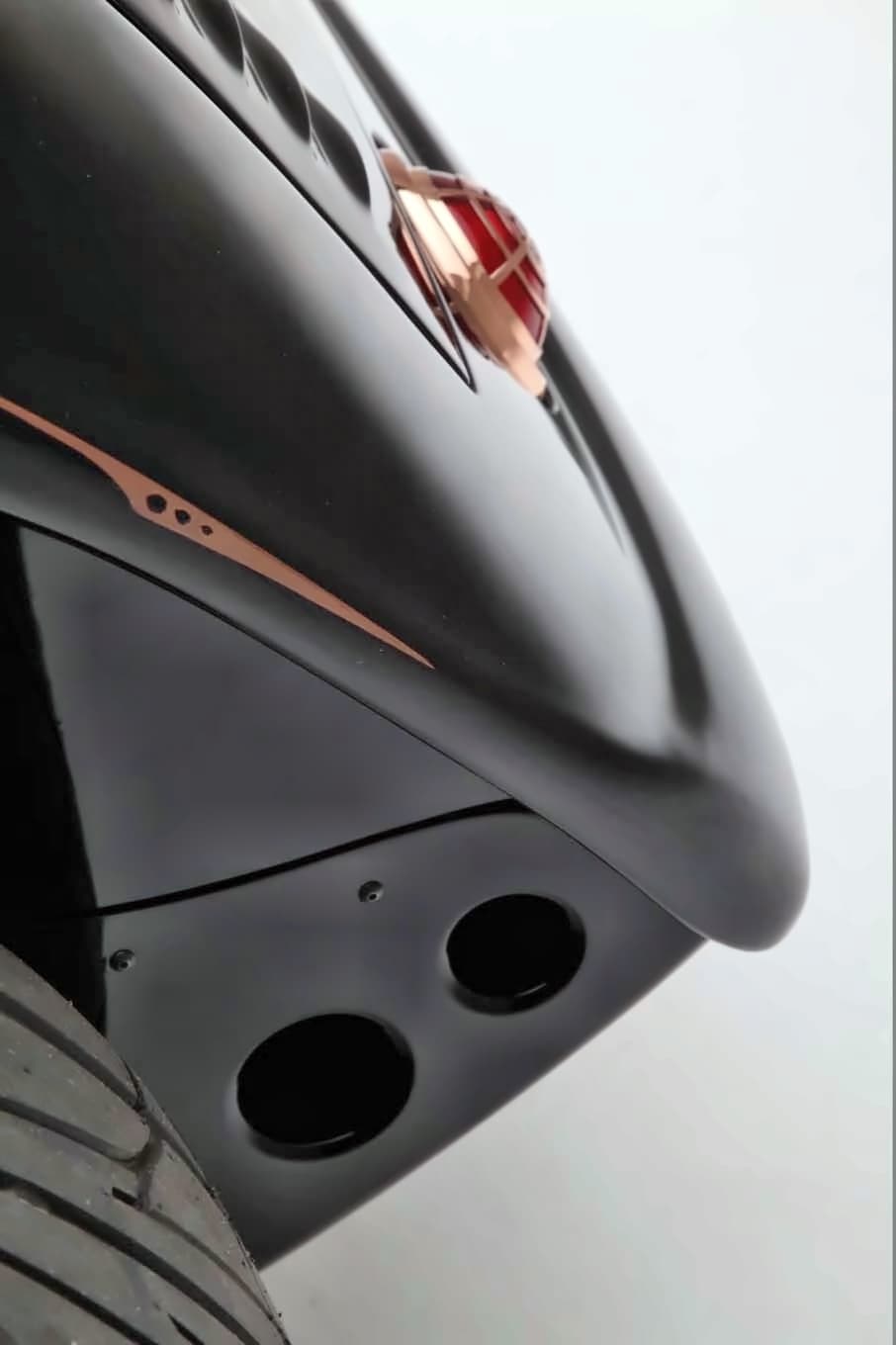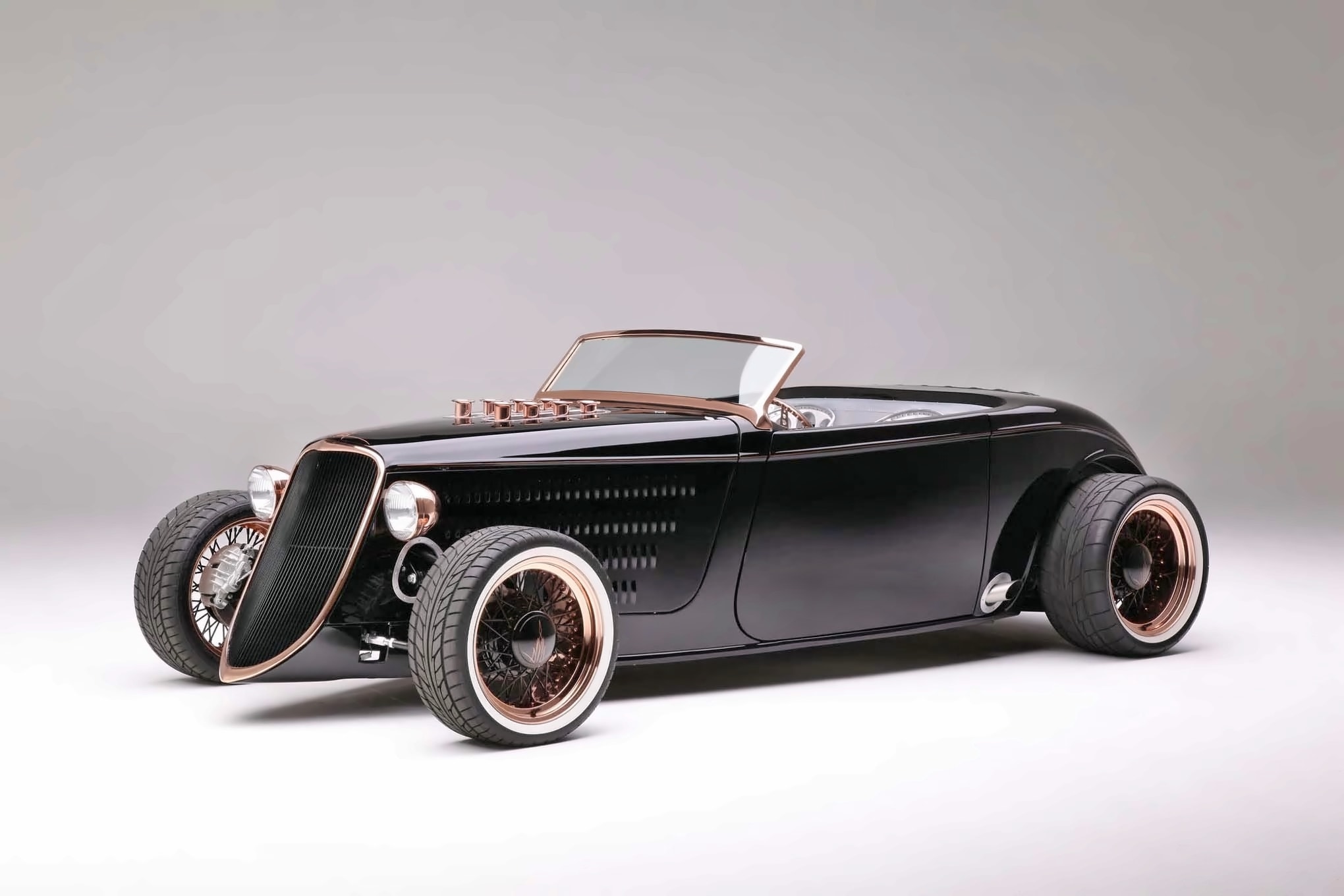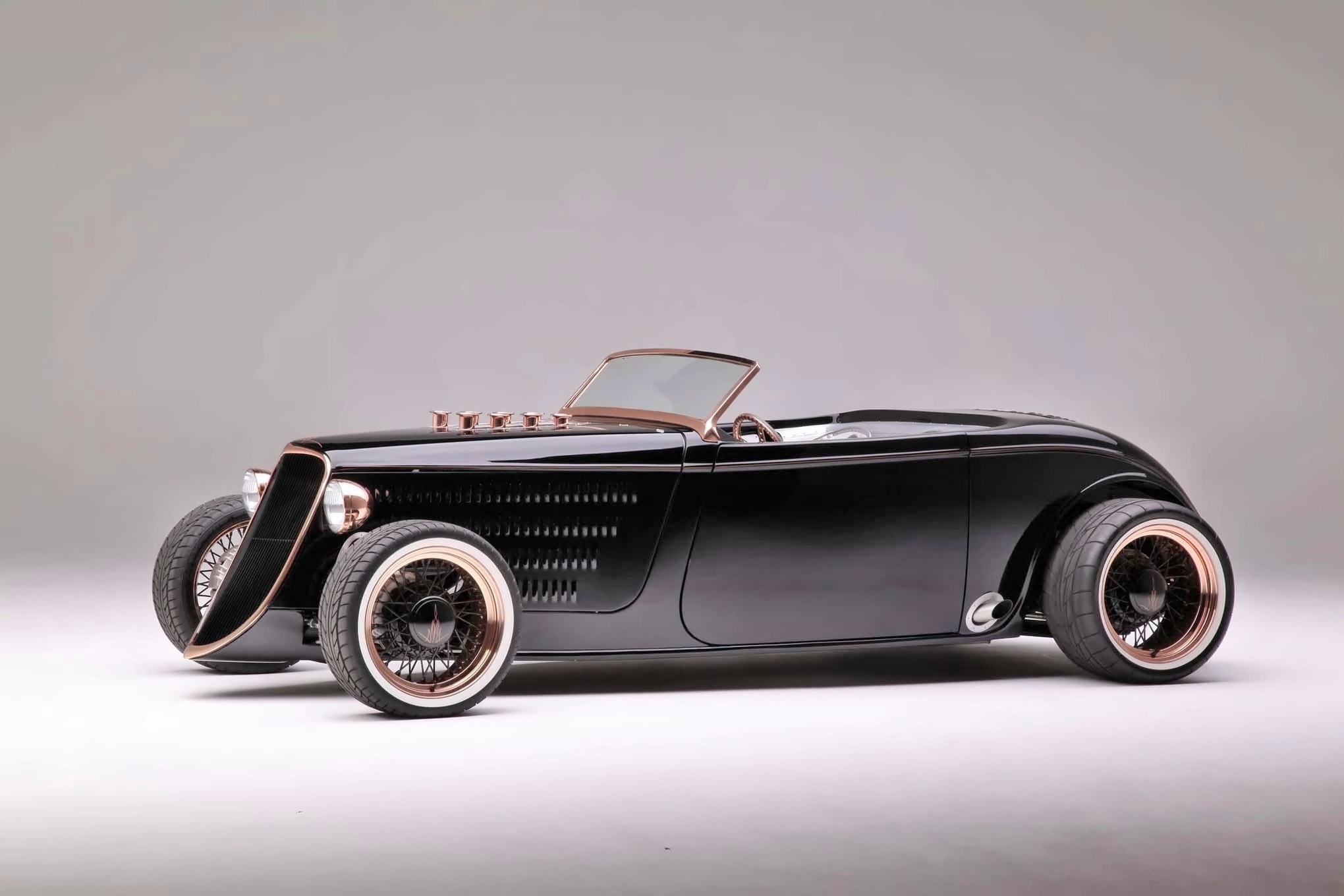 Parmi les éléments qui différencient ce Hot-Rod des autres le principal est l’utilisation de placage de cuivre au lieu de chrome., c’est la firme Ogden Chrome a fait tout ce travail…, et pour l’intérieur, des sièges de type bombardier glissent dans un intérieur tout en aluminium faisant la part belle à l’utilisation libérale de rivets partout (en cuivre et en aluminium)… la touche finale étant la jauge unique créée par Classic Instruments comprenant un compteur de vitesse (noté de 0 à 11 pour représenter 0 à 110 mph), un tachomètre à 8.000 tours, plus pression d’huile, température d’eau, tension électrique, et niveau de carburant, le tout présenté dans une horloge style “grand-père”...