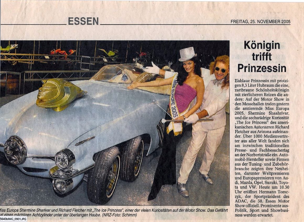 Après avoir pas mal bourlingué dans sa jeunesse, Richard Fletcher l’homme qui a créé et réalisé la “Ice Princess” a échoué quasi naufragé à Phoenix en Février 1979 où il est devenu un fabricant de voitures spéciales destinées au cinéma et aux acteurs… et il s’est mis à construire “des choses”, comme la plus longue la Ferrari F40 du monde, comme la plus grande décapotable du monde (avec un terrain de volley-ball à l’intérieur), et comme une voiture Tour-Eiffel de 12 mètres de haut…, toutes à partir de zéro.